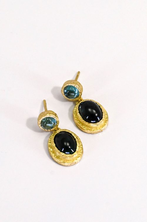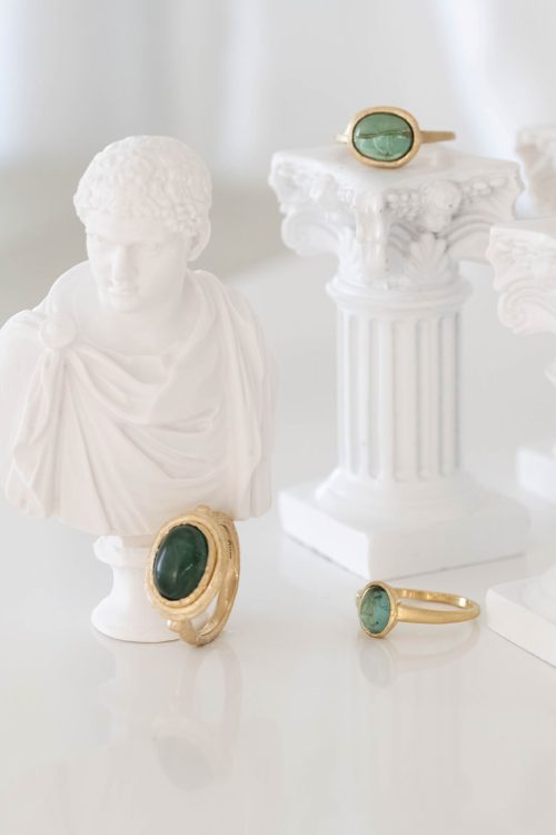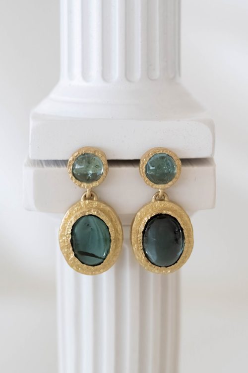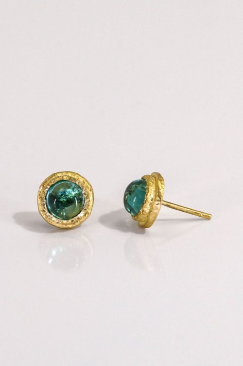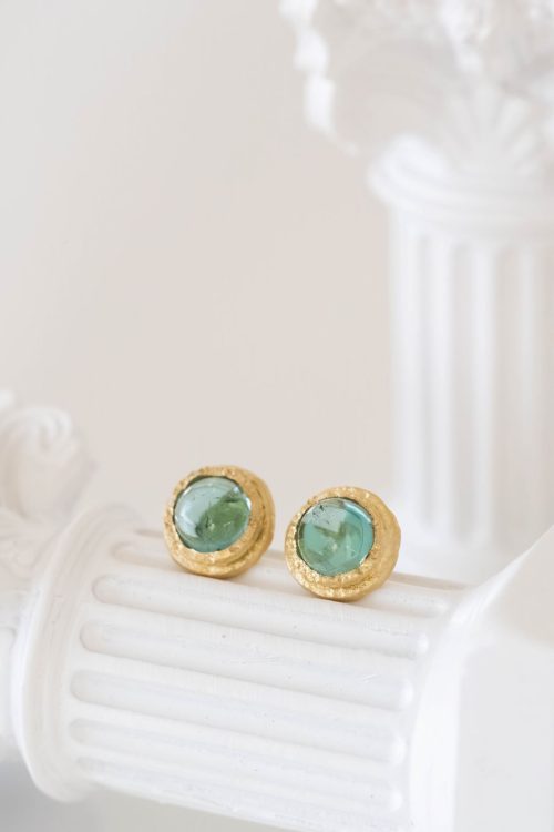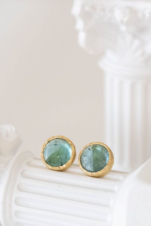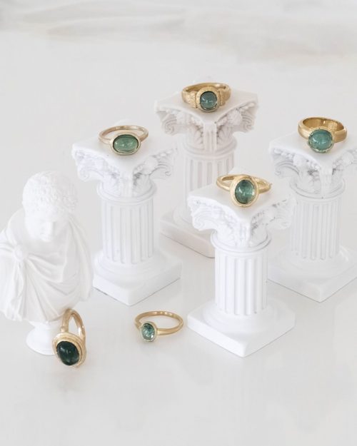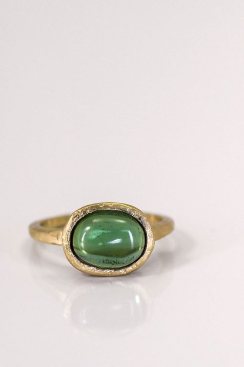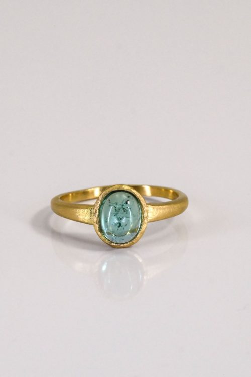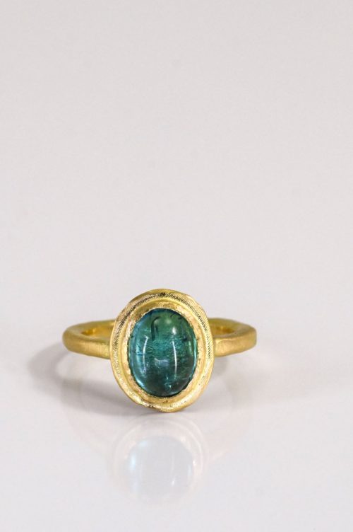 Crafted in 14-karat yellow gold, this Romanesque-style dinner ring features a 1.16-carat oval cabochon-cut natural tourmaline, medium blue-green in color. The gemstone is elegantly bezel-set, highlighting its natural color and subtle brilliance. With a design inspired by Romanesque architecture, the ring combines historic elegance with contemporary refinement, creating a sophisticated statement of craftsmanship and timeless style.