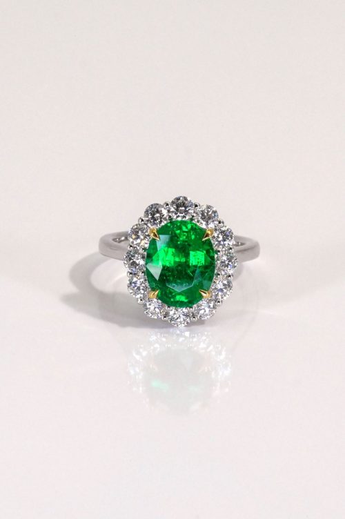 Exquisitely crafted in 18K white and yellow gold, this sophisticated dinner ring features a slightly tapered ¾ round shank with raised, two-level open-sided shoulders. The halo-style head is designed in white gold with a raised shared-claw setting, while the integrated 4-claw center setting is rendered in yellow gold for striking contrast. At its heart rests a 3.31-carat oval faceted natural Ethiopian emerald, displaying a vivid fine green hue of exceptional quality. Surrounding the center stone are 12 round brilliant-cut natural diamonds, VS1/F, with a total weight of 1.26 carats. Weighing 6 grams, this ring is a masterful balance of color, brilliance, and craftsmanship—an extraordinary statement of elegance.- Metal Type: 18k White Gold & 18k Yellow Gold