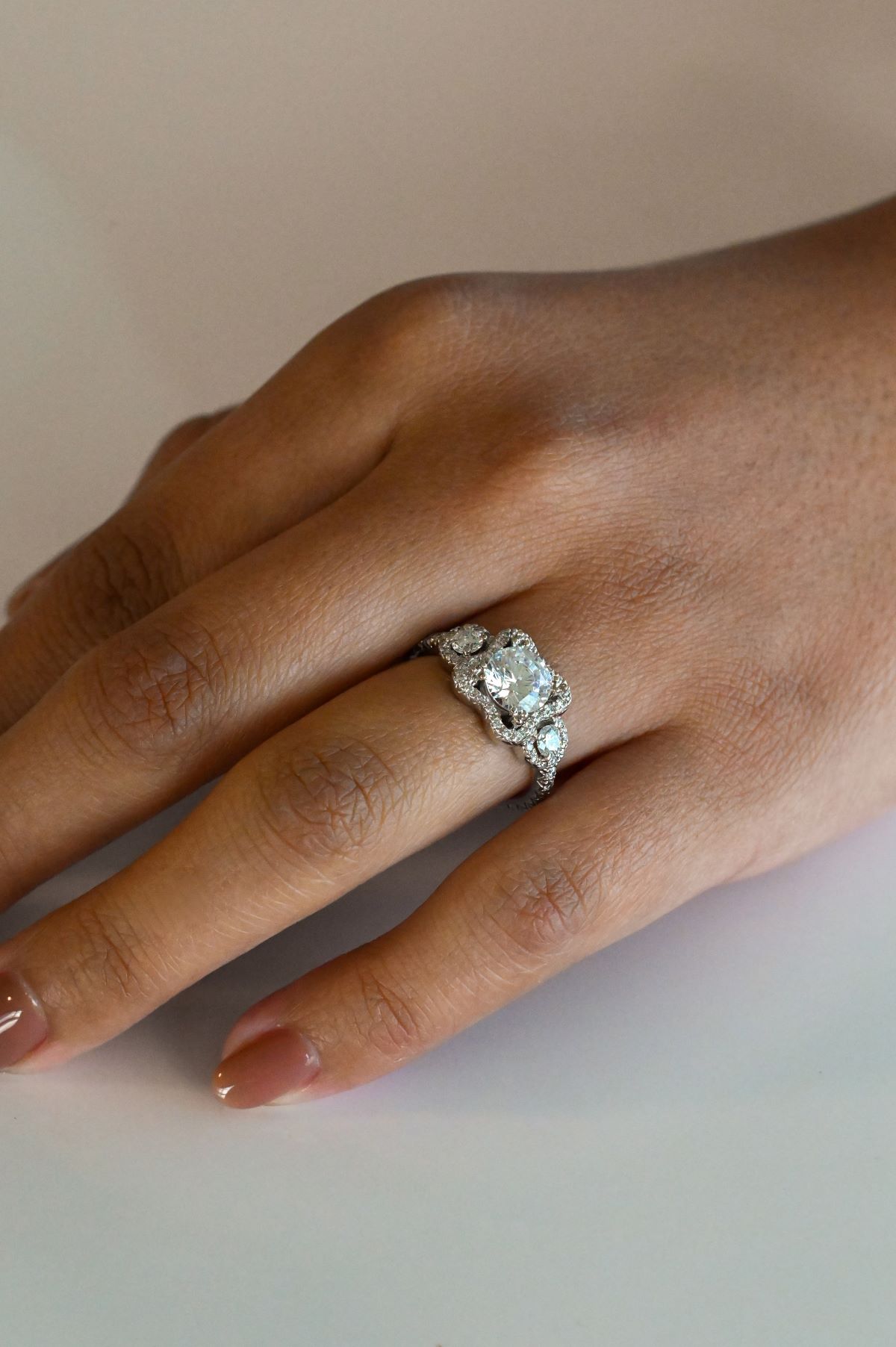 This 18k white gold square vintage-style halo semi-mount ring exudes timeless elegance. The center is flanked by two round brilliant-cut diamonds and accented with bead-set diamonds totaling 0.64 ct, creating a sparkling foundation ready to showcase a custom center stone. The intricate vintage-inspired detailing adds sophistication and character to this exquisite engagement ring.