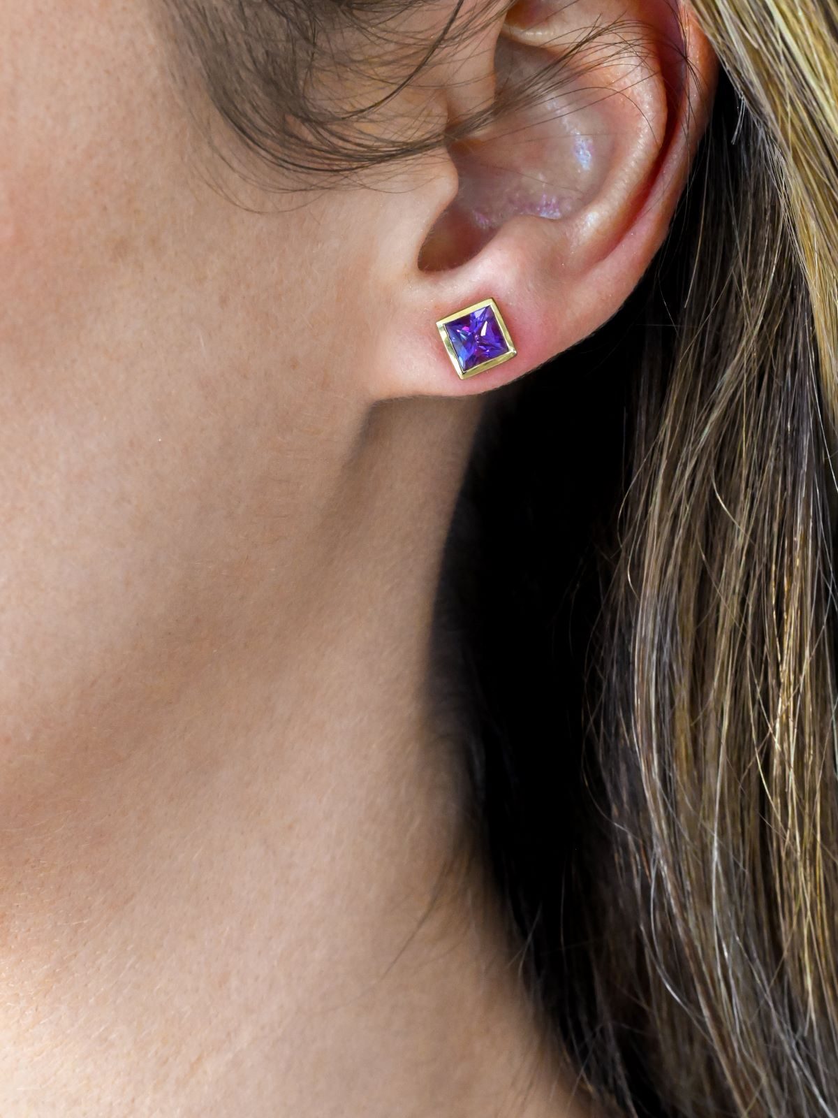 A vibrant pop of color in a refined design, these stud earrings feature two 5mm square princess-cut natural Amethysts with a total weight of 1.21 carats. Set in full bezel (halo) style 14 karat yellow gold settings with a plain shiny finish, they blend modern geometry with classic elegance—perfect for day-to-evening wear.