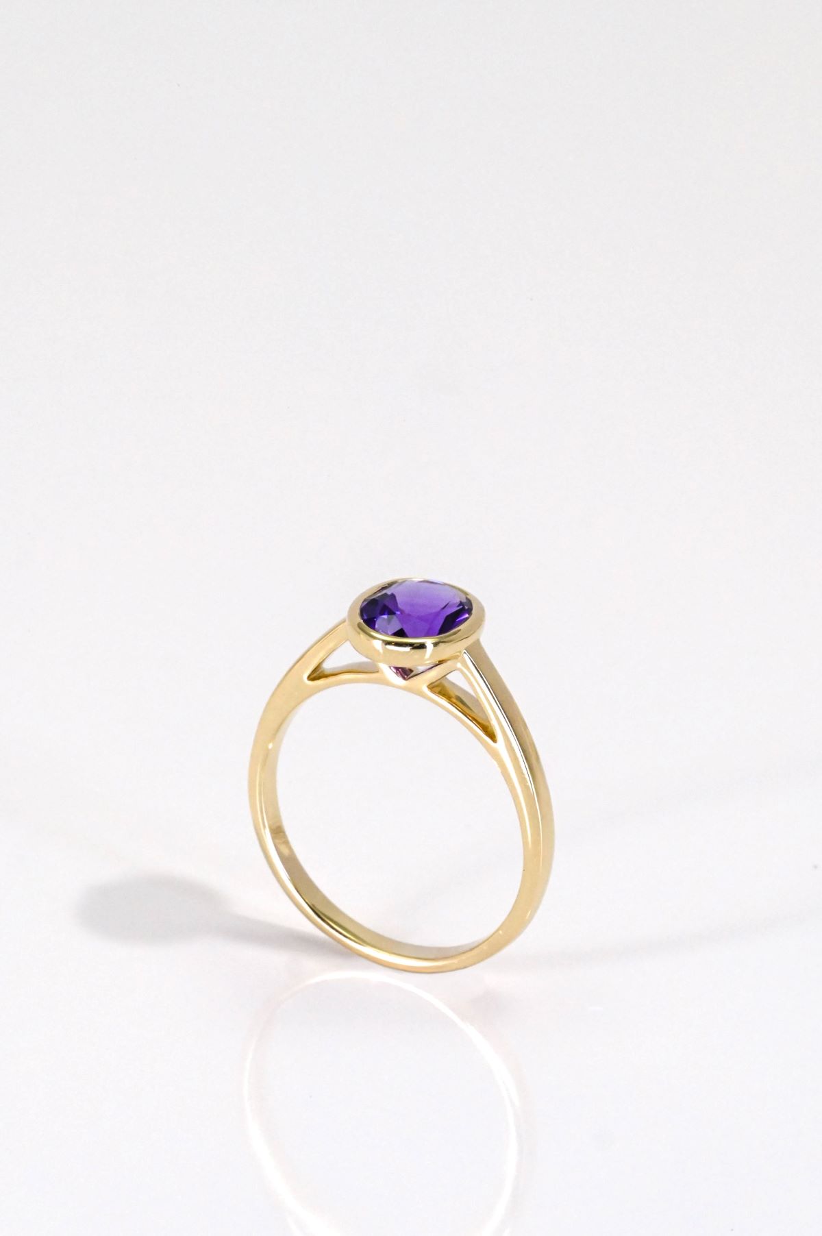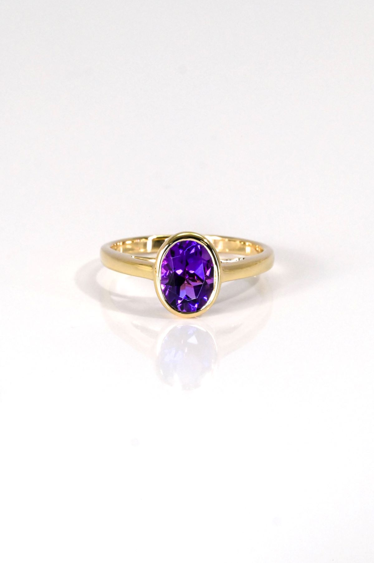 A modern take on a timeless design, this ring features a vibrant 8 x 6 mm oval faceted natural Amethyst, weighing 1.21 carats. The gemstone is securely set in a sleek halo bezel, offering both protection and a clean, contemporary look. Crafted in 14Kt yellow gold, the ring is finished with a narrow half-round band for a refined and comfortable fit. This piece pairs the rich purple hue of Amethyst with minimalist elegance—perfect for everyday sophistication or a thoughtful gift.