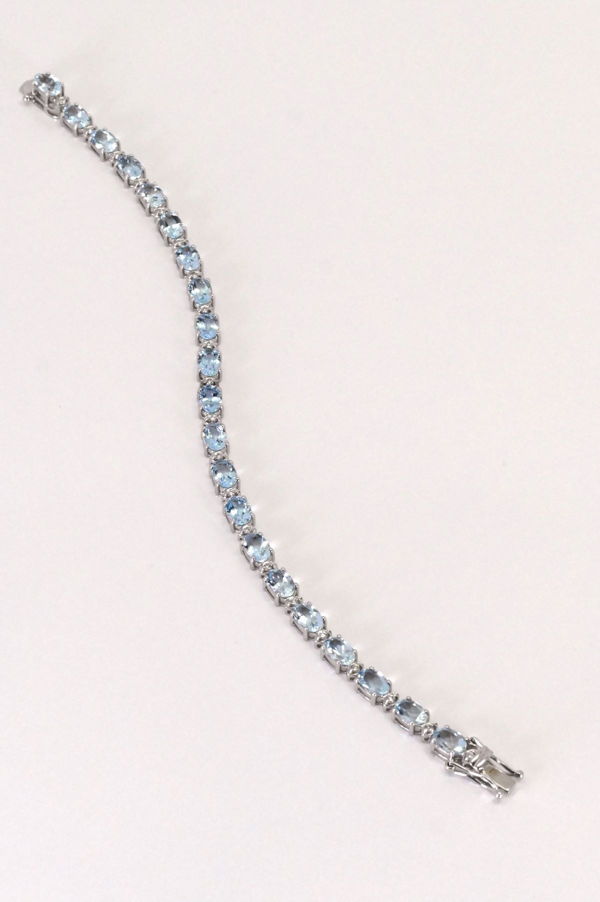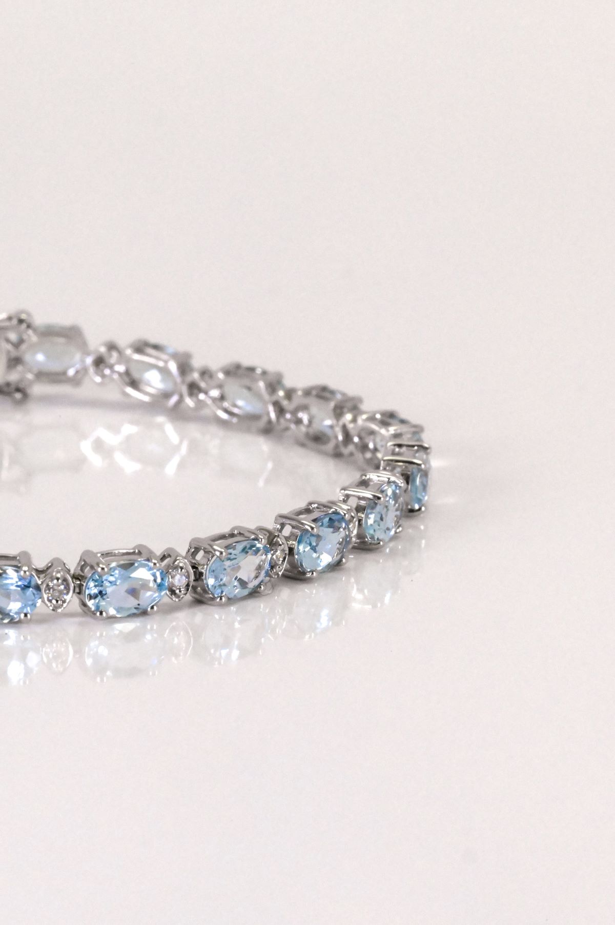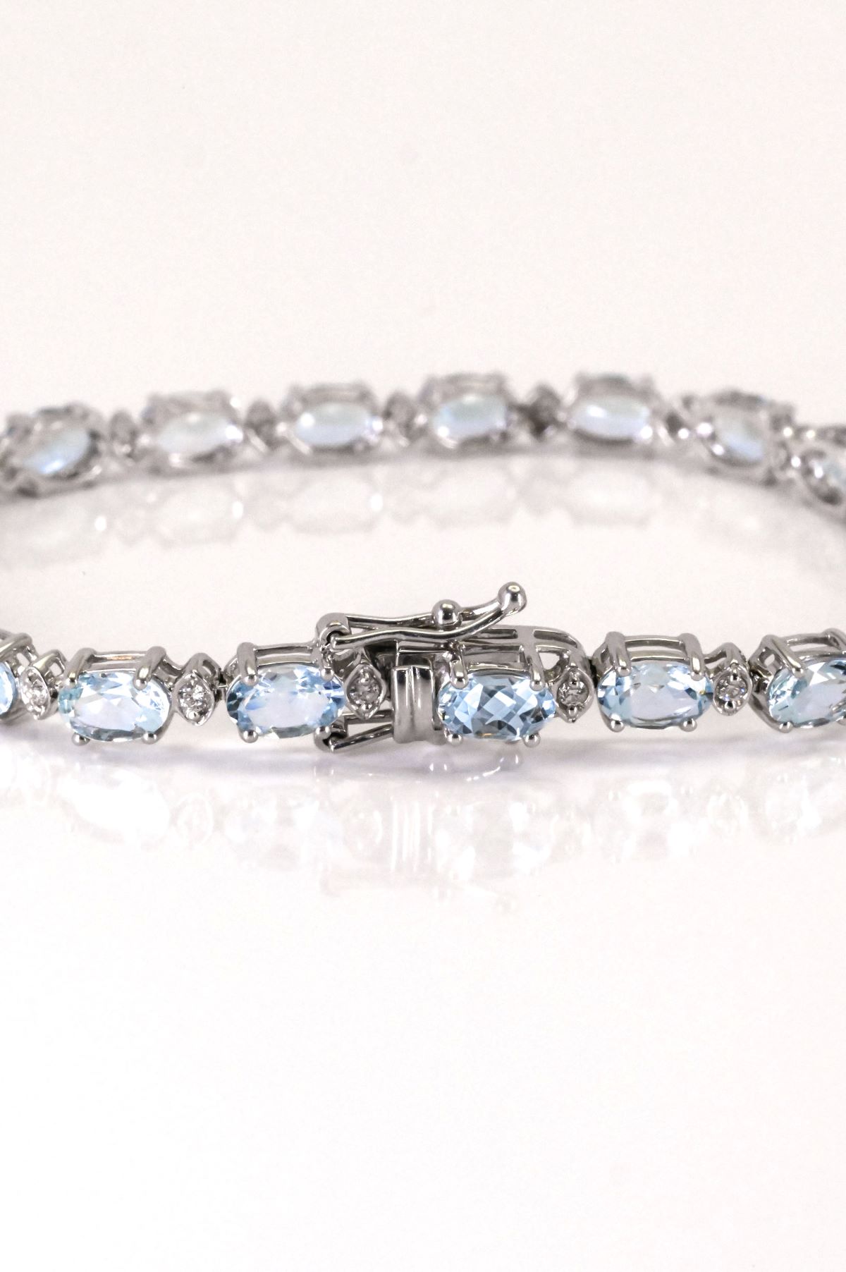 This luminous 14Kt white gold bracelet exudes refined elegance with its alternating design of oval faceted natural Aquamarines and sparkling round brilliant cut Diamonds. The cool blue hues of 8.24 carats of natural Beryl, Aquamarine, are beautifully complemented by 0.31 carats of glistening G/H color, SI2 clarity Diamonds. Delicately crafted, this piece blends color and brilliance in a timeless silhouette—ideal for special occasions or adding understated luxury to everyday wear.