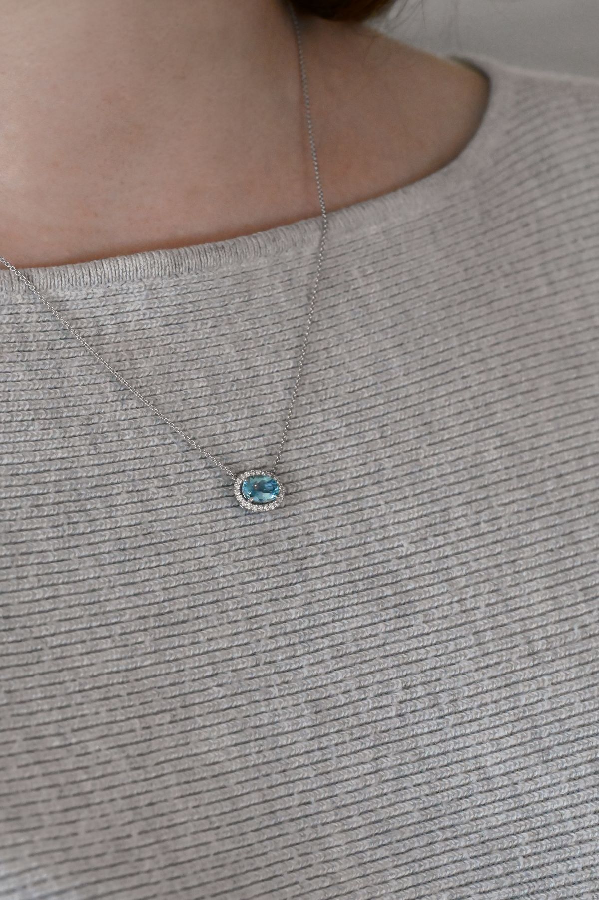 This refined pendant is crafted in 18 karat white gold and features a 1.07 carat oval faceted natural Aquamarine, traverse-set to enhance its serene blue hue. Encircling the center gem is a halo of 22 round brilliant cut Diamonds, with a total weight of 0.17 carats, graded VS2 clarity and F-G colour. The pendant is gracefully suspended from a fine white gold chain, offering a timeless blend of delicate sparkle and graceful colour.