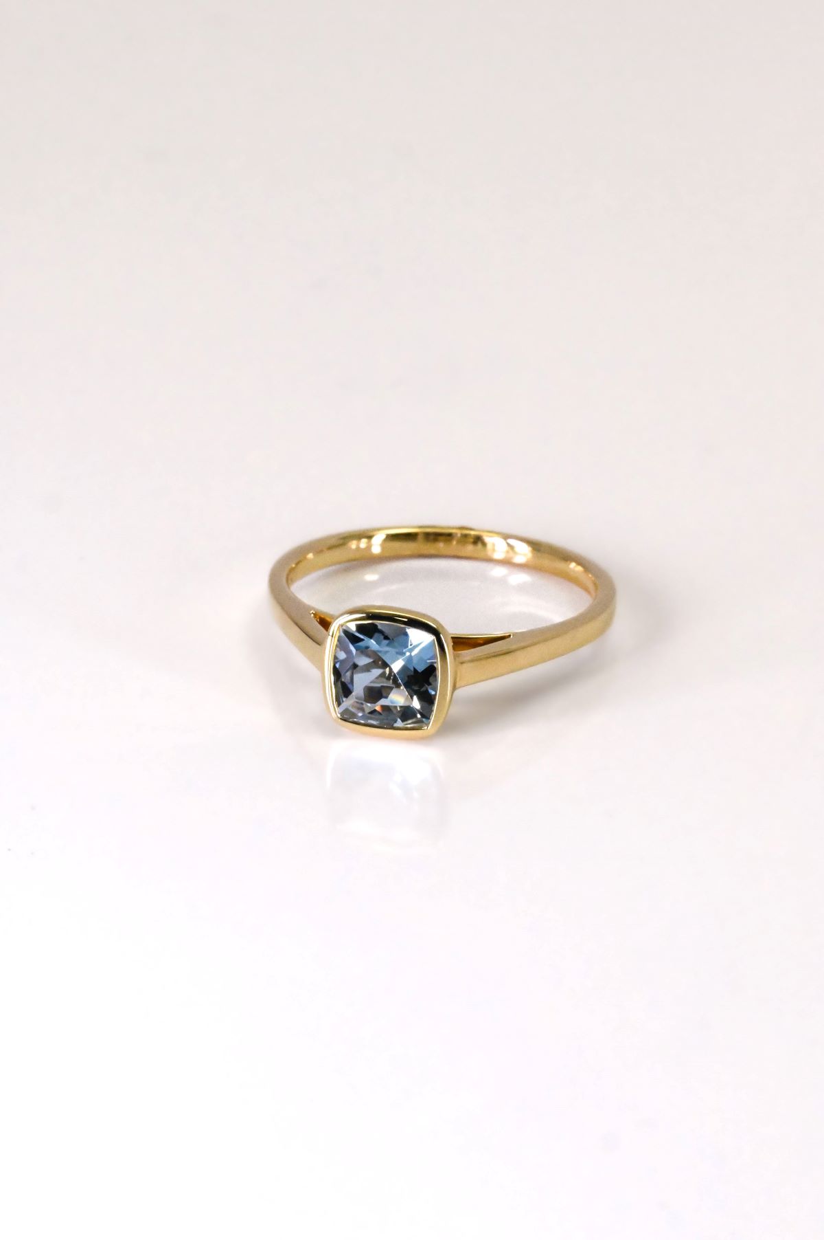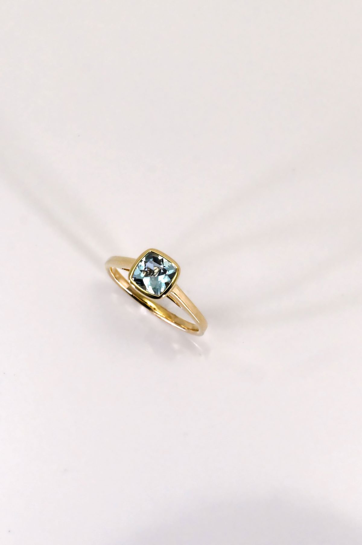 Delicate yet distinctive, this ladies’ dinner ring is crafted in rich 14Kt yellow gold and bezel set with a 0.68ct square cushion cut natural Aquamarine. The soft curves of the cushion cut offer a romantic silhouette, while the minimalist bezel setting adds a modern, secure finish.