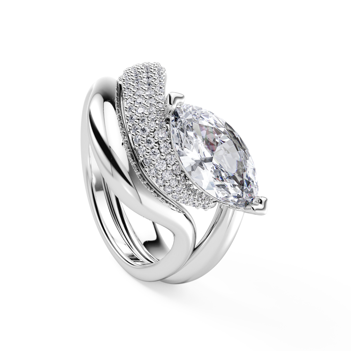 This graceful wedding band echoes the warmth and intimacy of an embrace, curving gently like open arms ready to hold. Designed as a perfect complement to the engagement ring, its subtle wave mirrors the rhythm of two lives moving in harmony—his and hers, together. Soft and organic, it captures the spirit of spring: fresh, tender, and full of promise for the shared journey ahead.