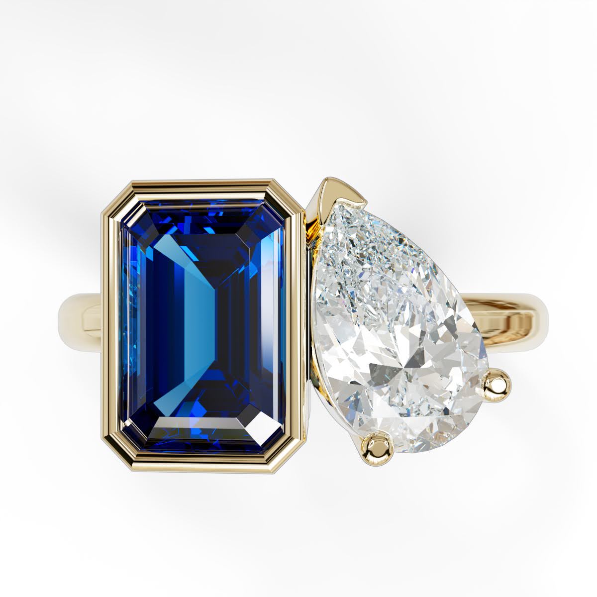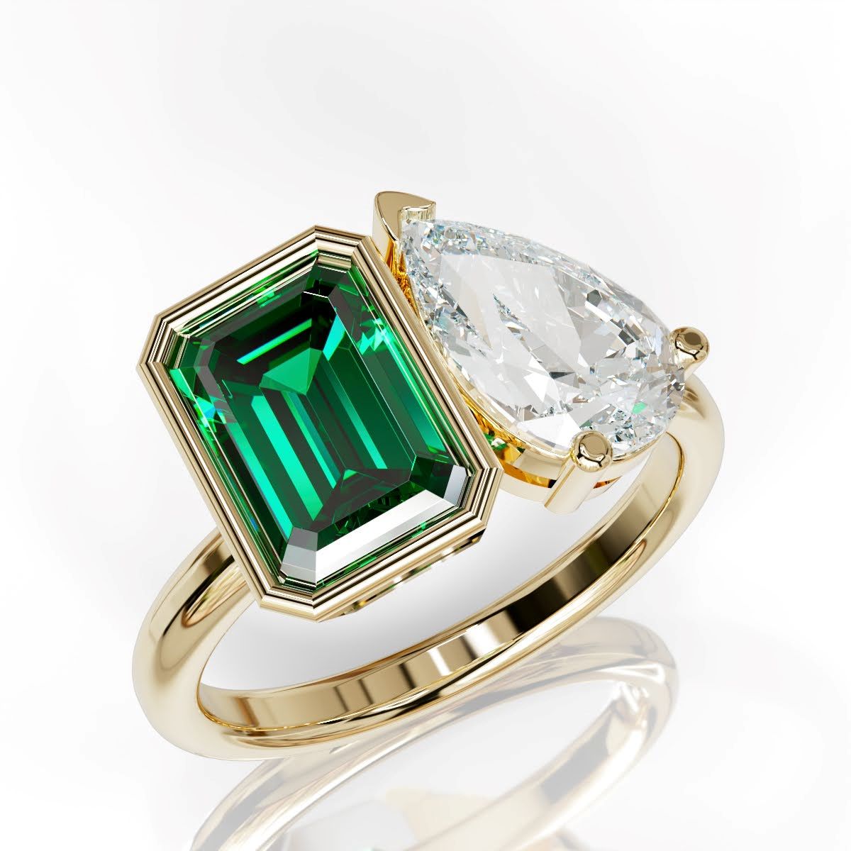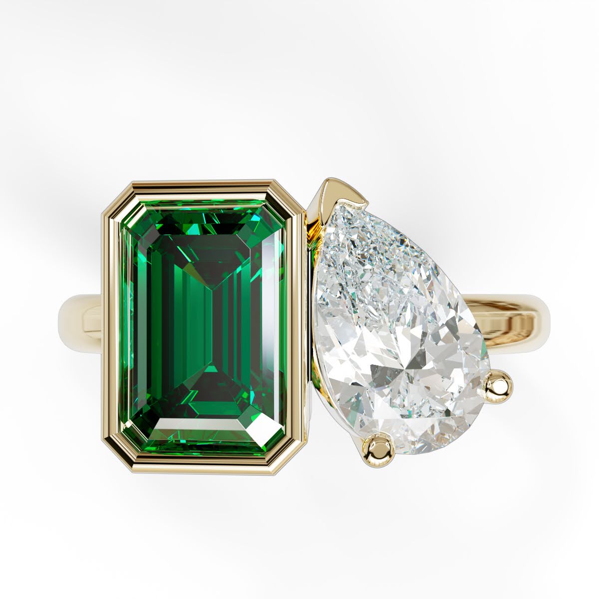 A modern ode to love in bloom. This toi et moi ring pairs a sunlit yellow emerald-cut diamond with a luminous pear-cut white diamond—two distinct souls in perfect harmony. A celebration of contrast and connection, it captures the essence of spring love: fresh, unexpected, and beautifully intertwined.