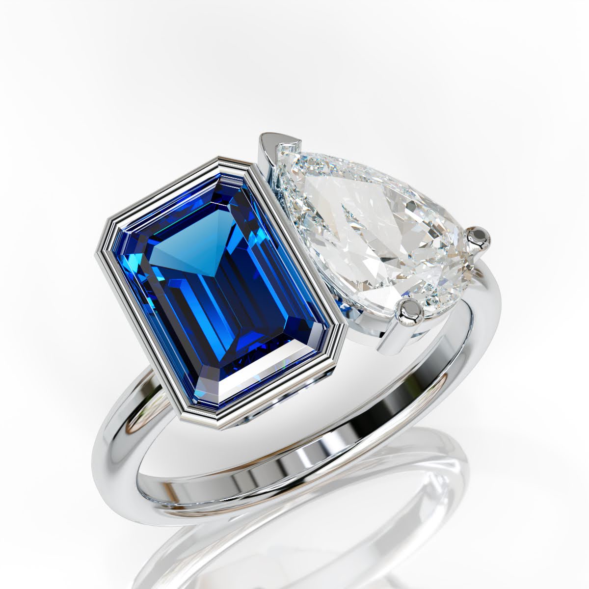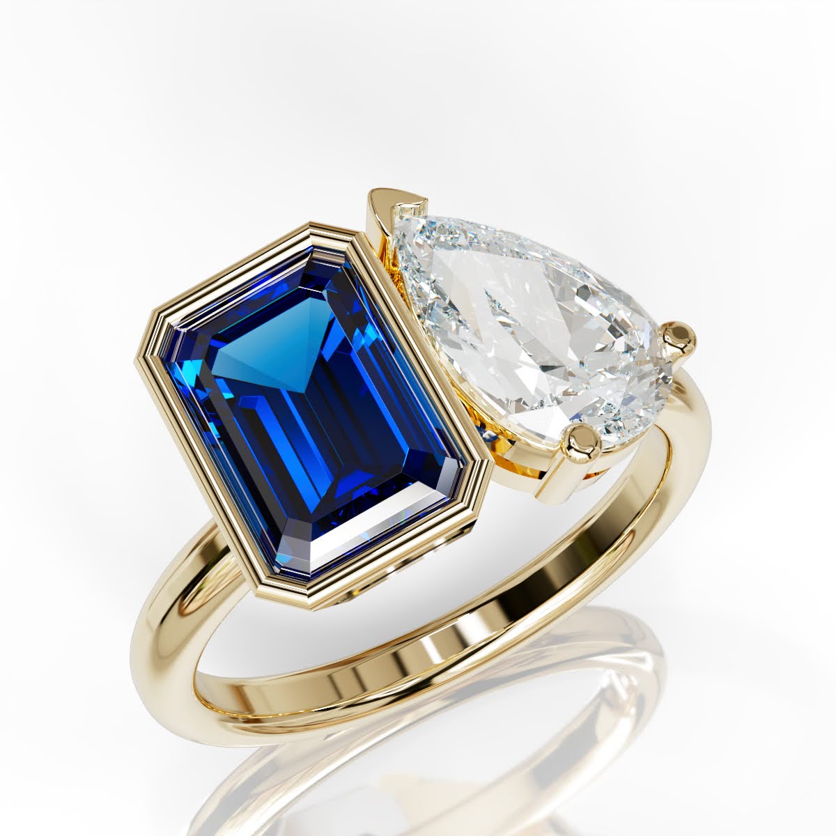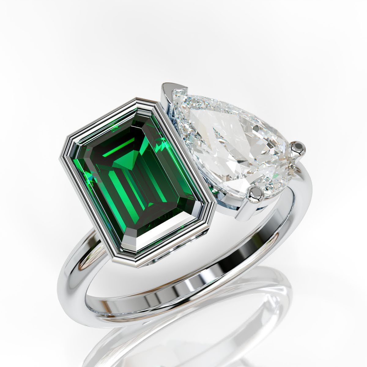 A modern ode to love in bloom. This toi et moi ring pairs a sunlit yellow emerald-cut diamond with a luminous pear-cut white diamond—two distinct souls in perfect harmony. A celebration of contrast and connection, it captures the essence of spring love: fresh, unexpected, and beautifully intertwined.