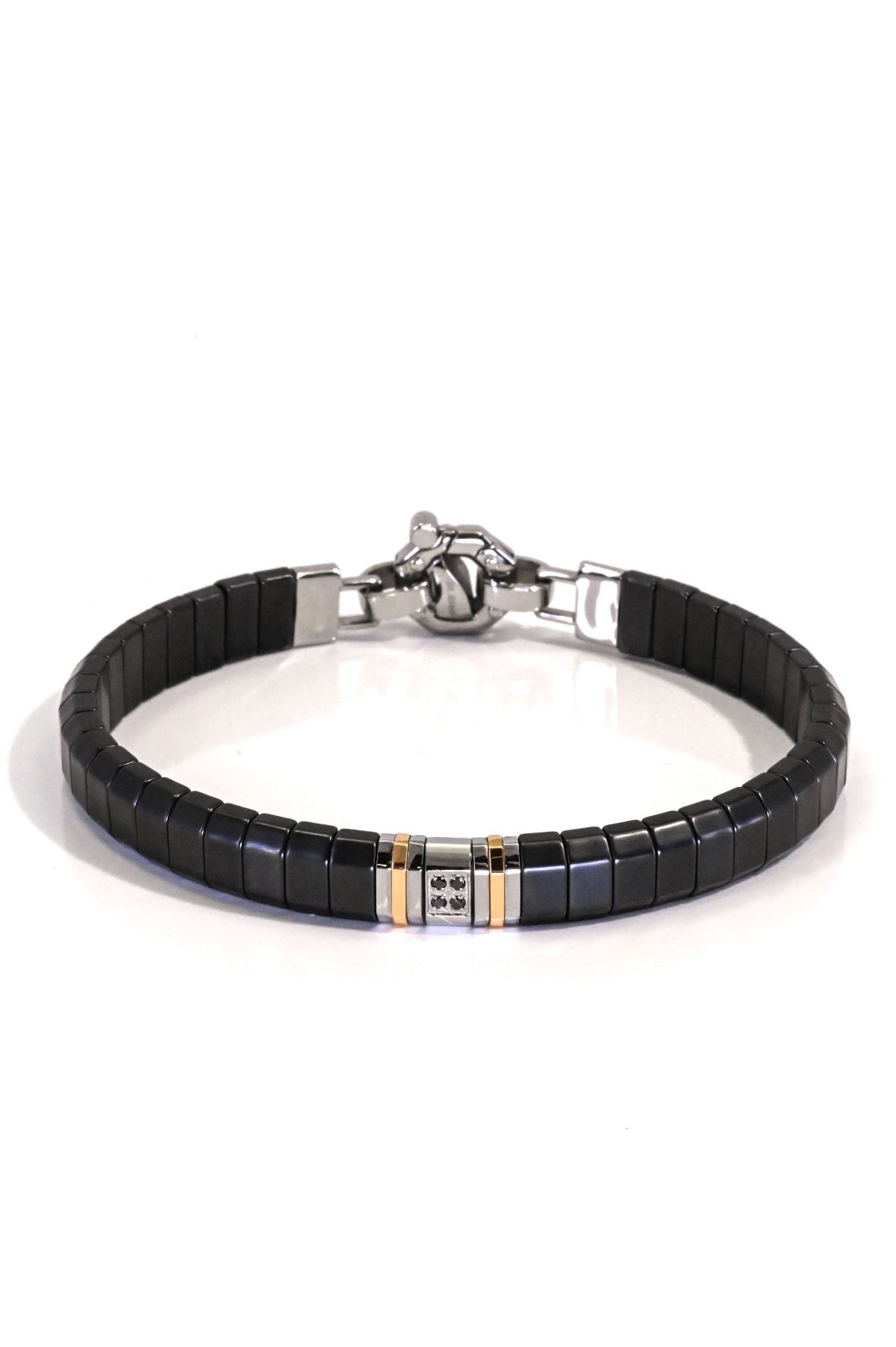 This Baraka men’s bracelet masterfully combines 18-karat rose gold with stainless steel, black ceramic, and titanium, accented with black diamonds. The contrasting materials and darkened sparkle create a bold, contemporary design that exudes masculine sophistication and showcases Baraka’s signature innovation and craftsmanship.