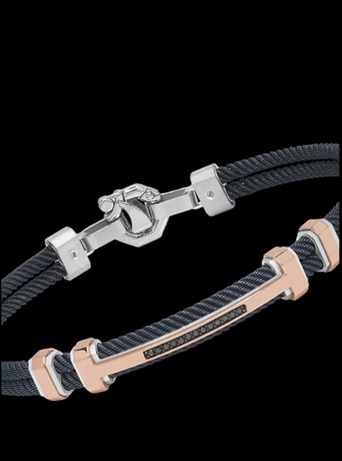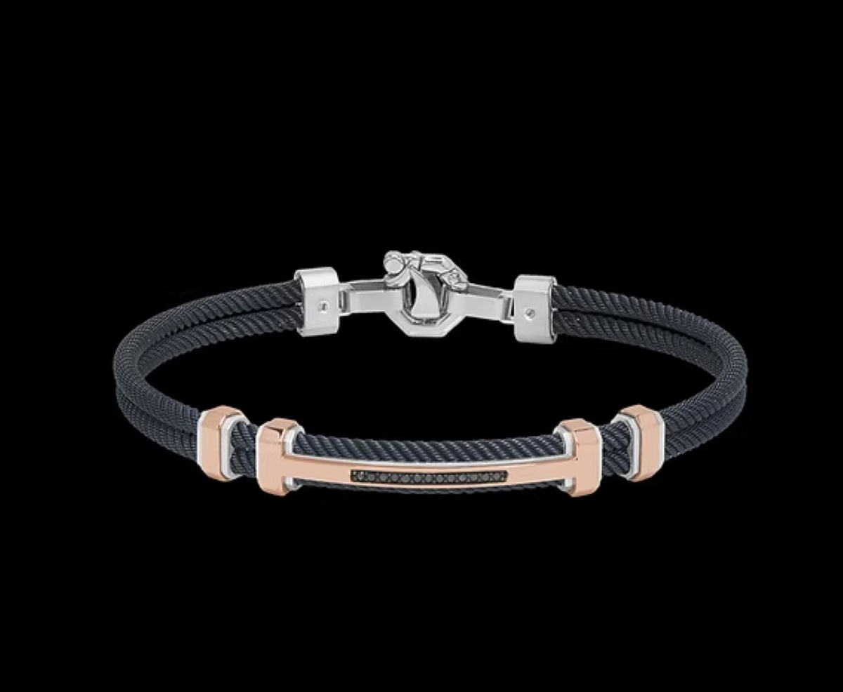 Baraka men’s bracelet expertly crafted in 18-karat rose gold, stainless steel, and sterling silver, enhanced with blue PVD accents and set with natural diamonds. A bold expression of Italian design, combining innovation, luxury, and contemporary elegance.