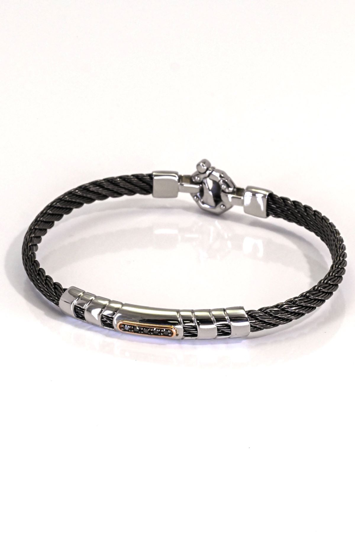 Baraka men’s bracelet crafted in 18-karat rose gold and stainless steel, accented with black PVD detailing. The design is set with 0.08 carats of black diamonds and 0.02 carats of white diamonds. Modern, bold, and impeccably engineered, this piece combines refined materials with contemporary style.