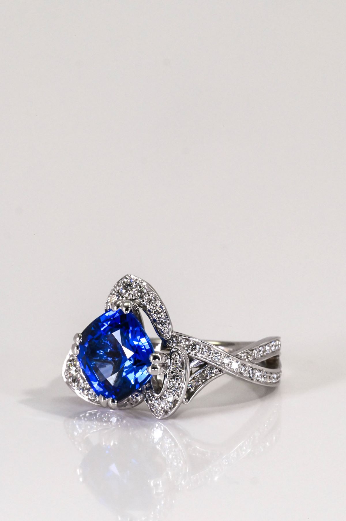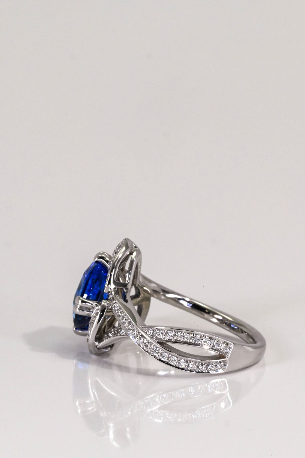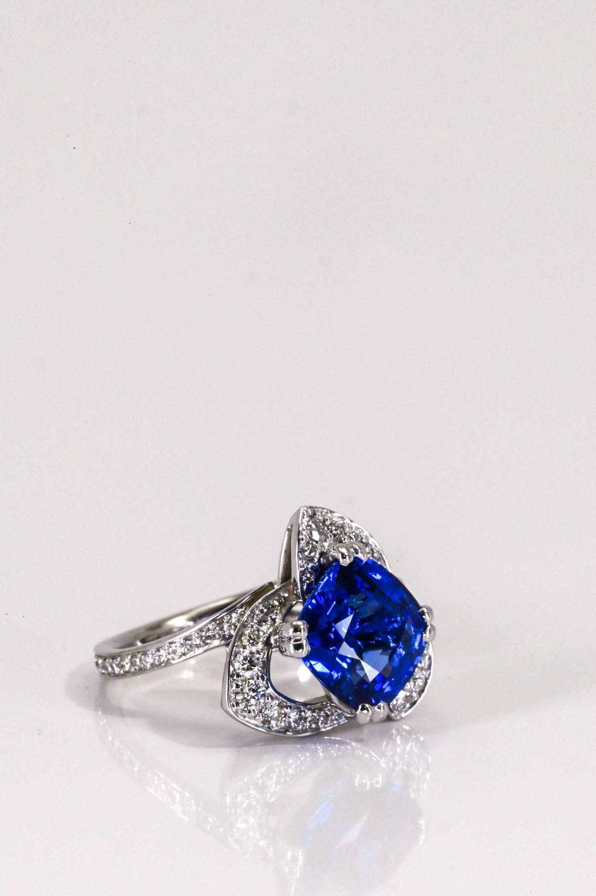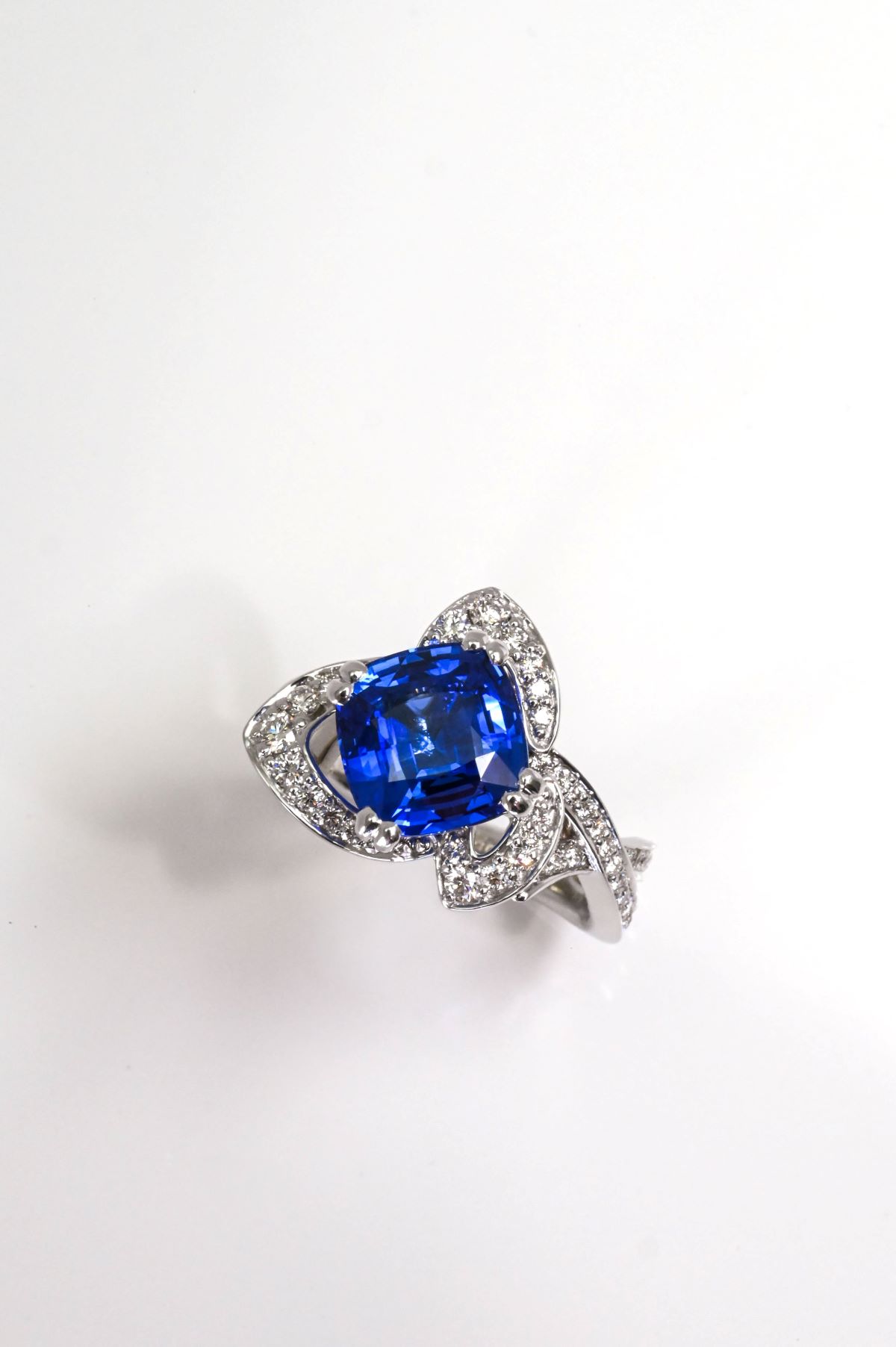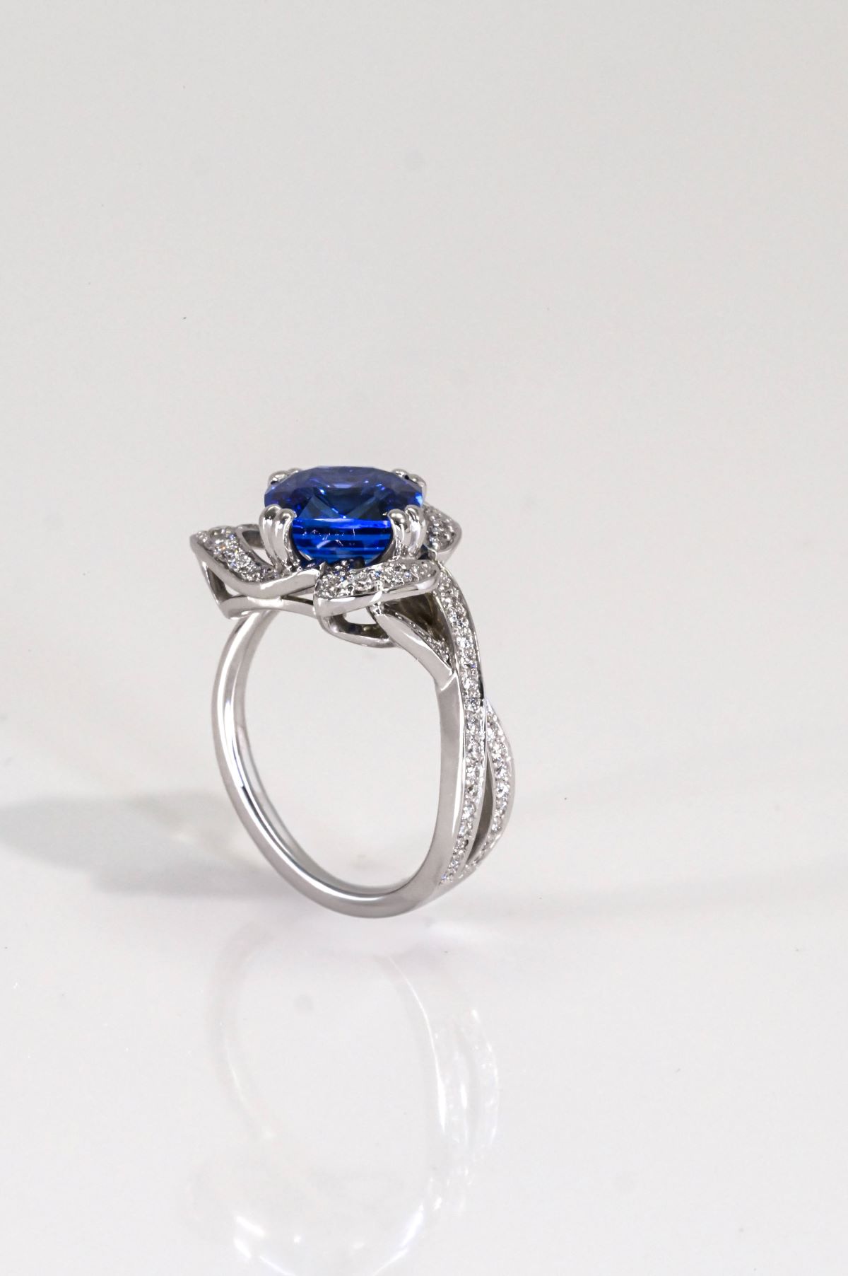 A bold and artistic statement piece, this 19Kt white gold ring features a 3.60ct cushion-cut natural sapphire (corundum) in a vivid, intense medium cornflower blue. Measuring 8.77 x 8.53 x 4.94 mm, the sapphire is beautifully complemented by 68 round brilliant cut natural diamonds (SI1/FG), totaling 0.49cts, bead-set in a flowing, free-form design. A striking blend of color, brilliance, and modern elegance.