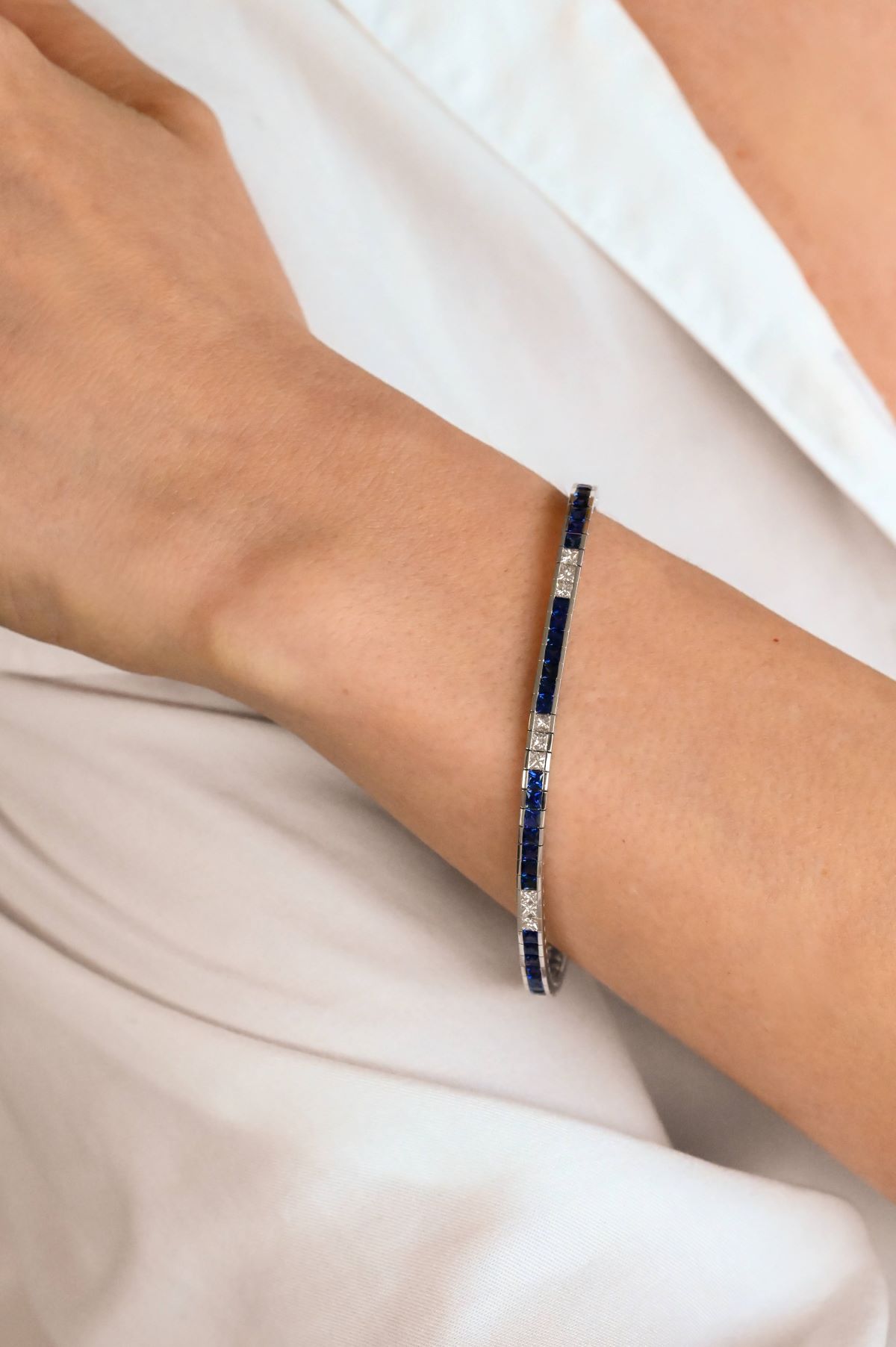 A refined statement of elegance, this 18 karat white gold bracelet features a sleek channel-set design with alternating groups of seven princess-cut Ceylon blue sapphires and trios of brilliant natural diamonds. The vibrant sapphires, weighing 4.14 carats in total, are perfectly complemented by 1.59 carats of dazzling diamonds, creating a striking play of color and light. Measuring 7 inches in length, the bracelet is secured with an integrated inline box clasp and undercarriage flip safety clasp, ensuring both comfort and sophistication.