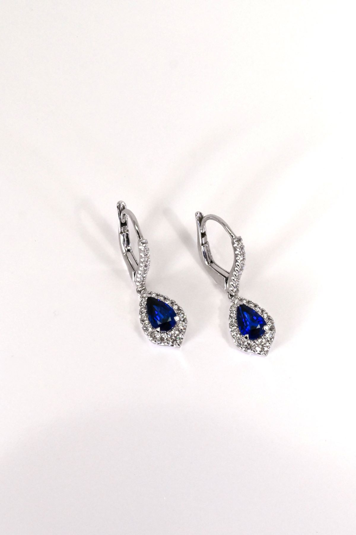 Elegant drop design pierced earrings crafted in 18 karat white gold. Each earring features a pear-shaped natural fine Ceylon blue sapphire, with a combined total weight of 1.00 carat. The sapphires are beautifully accented by 46 round brilliant cut diamonds, totaling 0.53 carats, graded VS clarity and F/G color. The earrings are completed with diamond-set European backs for a secure and graceful fit.