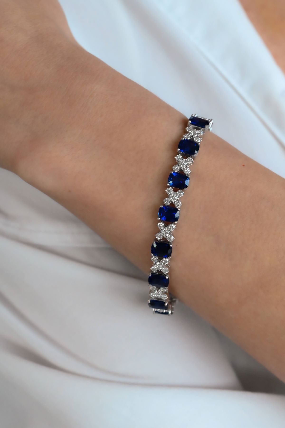 Exquisite craftsmanship meets timeless elegance in this luxurious sapphire and diamond bracelet. Crafted in rich 18-karat white gold with a polished finish, the design features alternating rectangular cushion-cut sapphire settings and five-stone “X” motif diamond links, each with a two-level open gallery for added dimension and brilliance. The bracelet showcases 15 fine natural Ceylon blue sapphires totaling 15.13 carats, known for their vivid color and exceptional clarity. Interspersed are 75 round brilliant-cut natural diamonds, totaling 4.27 carats, offering dazzling contrast and fire. Secured with a discreet inline box clasp and an undercarriage safety lock, this piece combines elegance with lasting security—perfect for special occasions or a showstopping addition to your fine jewelry collection.