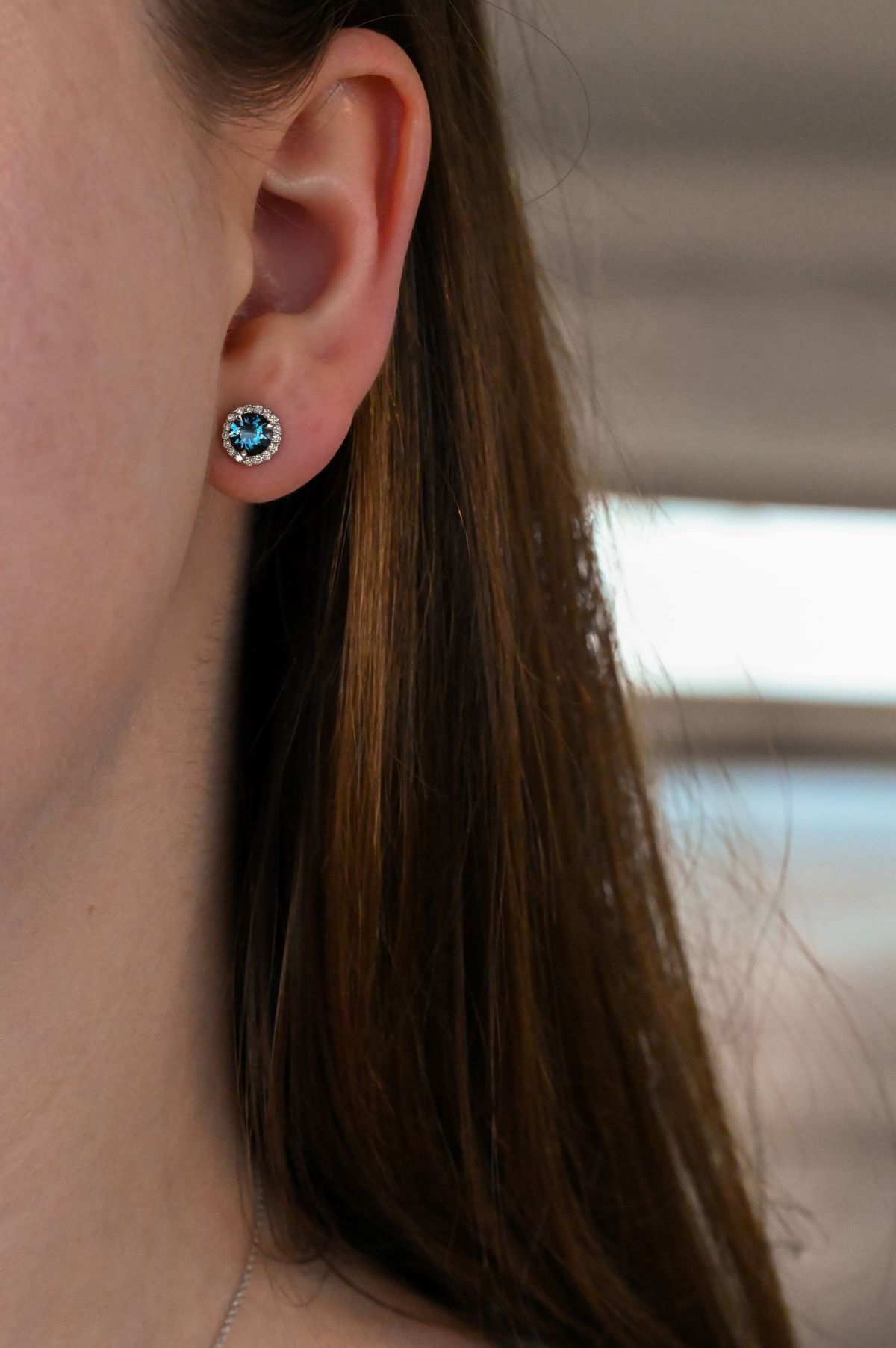 This elegant pair of 14Kt white gold pierced stud earrings features a classic “Marguerita” halo design. Each earring is set with a richly hued London Blue natural Topaz, with a combined total weight of 1.01 carats. Surrounding the center stones are natural round brilliant cut diamonds totaling 0.18 carats, adding a delicate sparkle. The earrings are finished with secure stud posts and butterfly backs for comfortable wear and timeless sophistication.