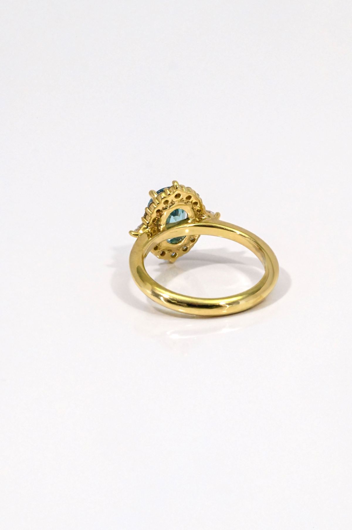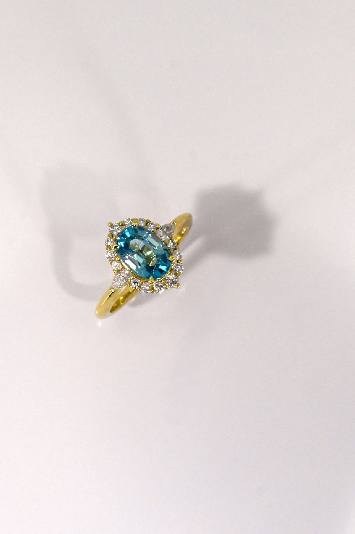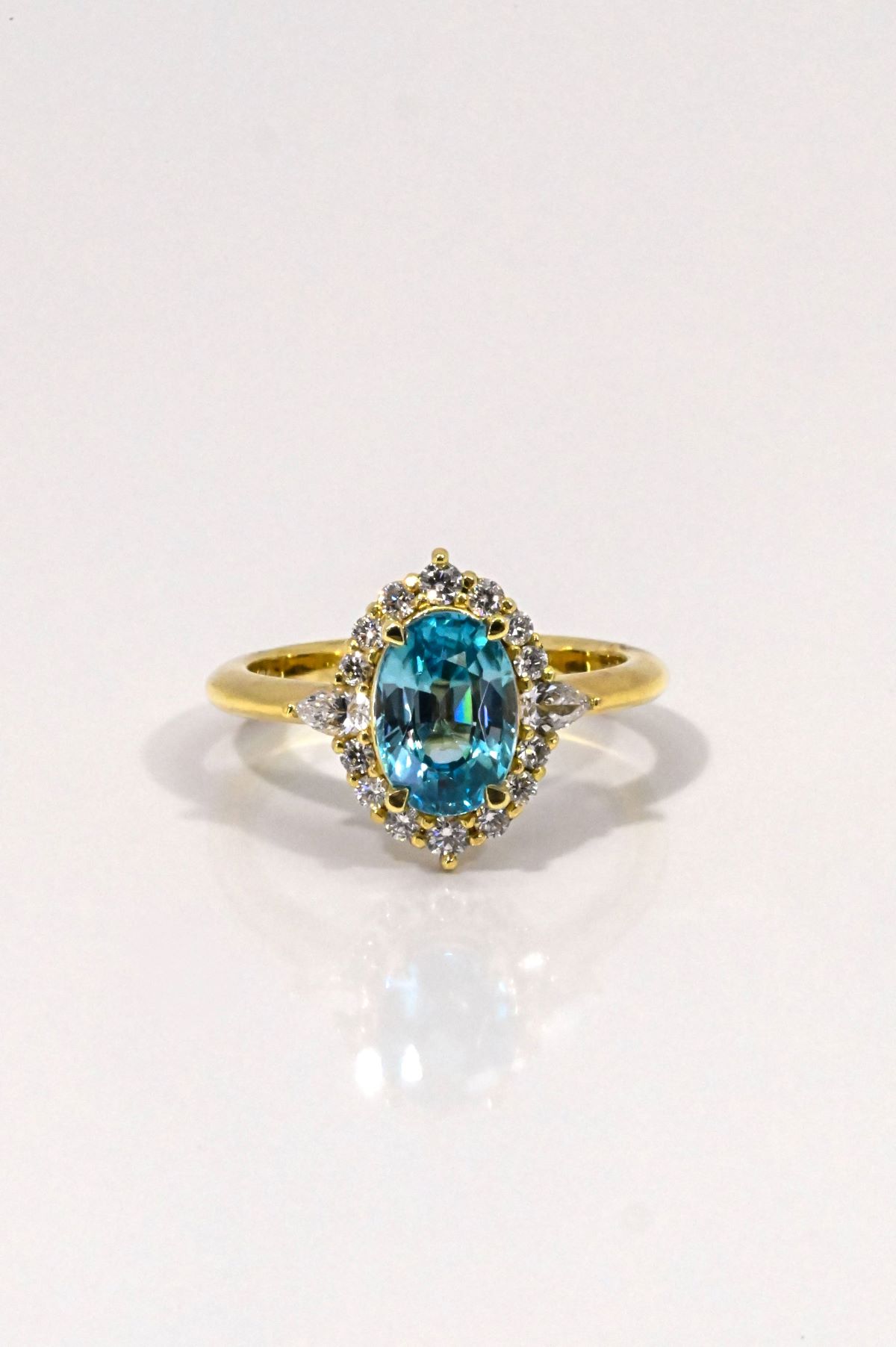 This sophisticated dinner ring features a 2.43ct oval natural blue zircon, set in rich 18Kt yellow gold. Accented with 0.41cts of pear and round brilliant cut natural diamonds (VS/F), it offers a vibrant burst of color and refined sparkle—perfect for evening elegance or everyday luxury.