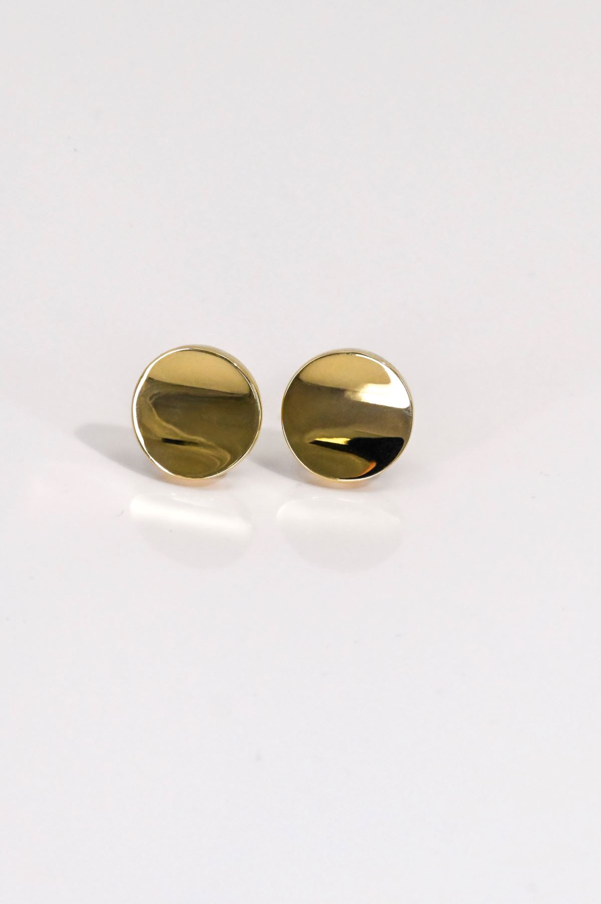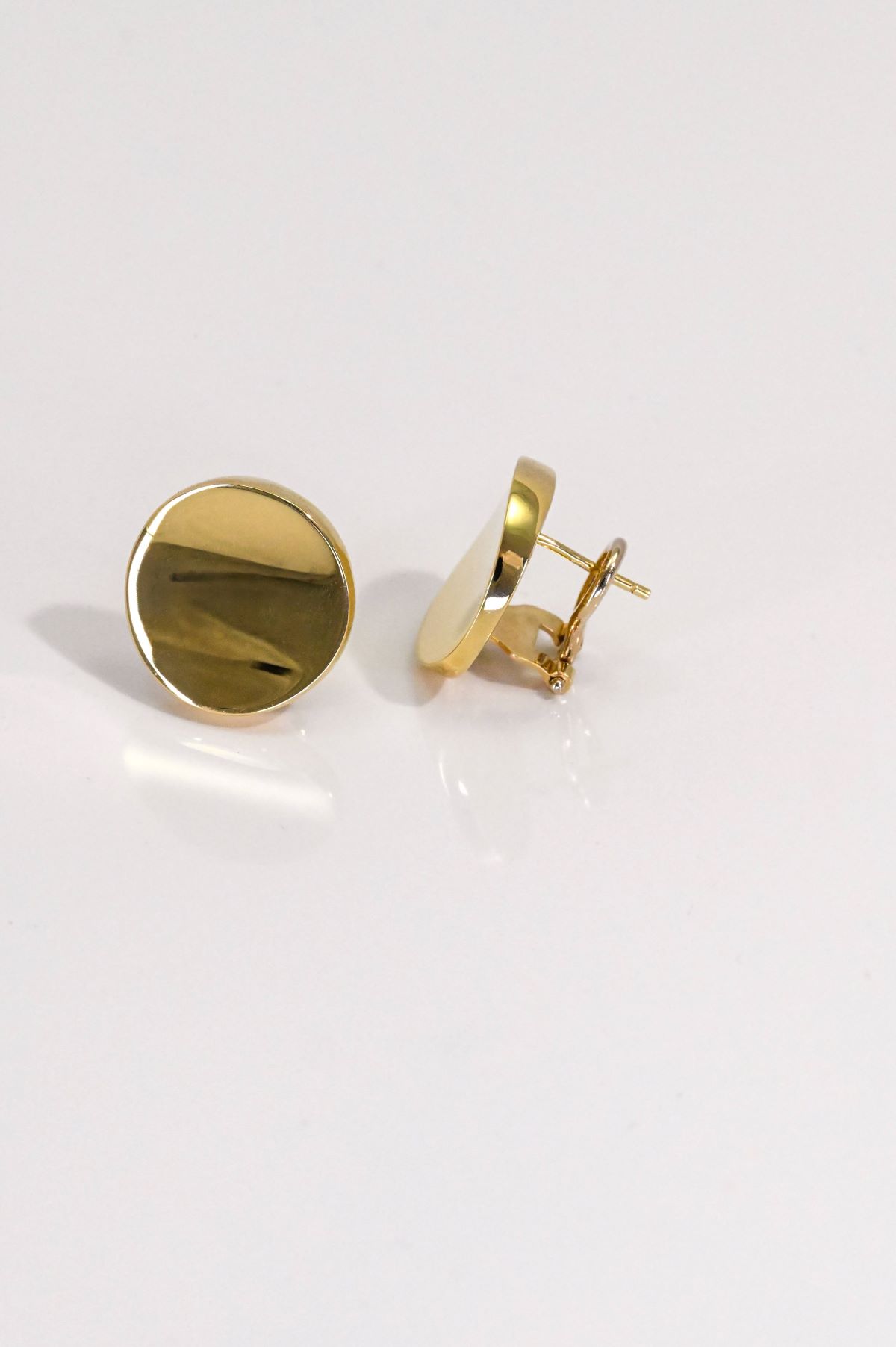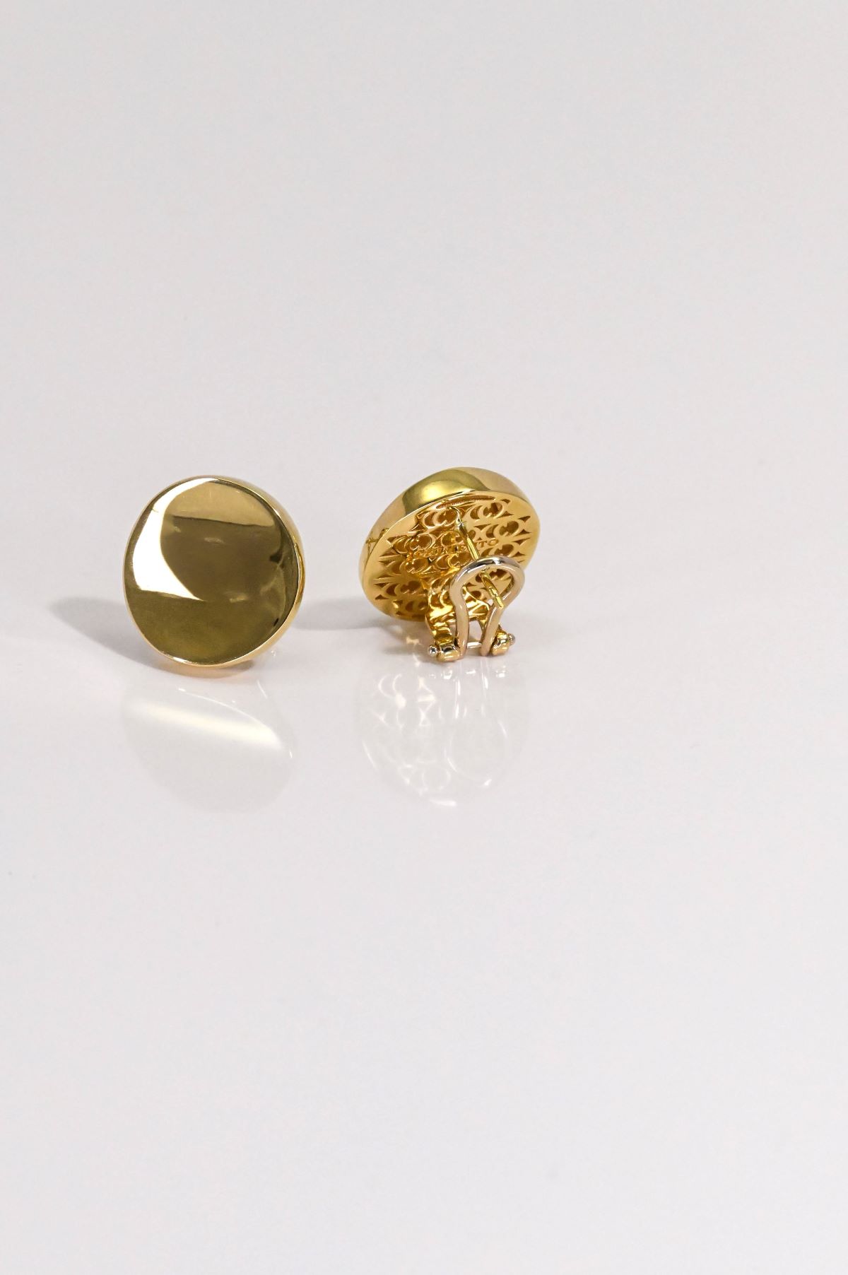 A striking pair of ladies’ 18Kt. yellow gold pierced earrings from the Armillas Glow Collection. Crafted in a bold round disc design with a concave front and intricate open filigree back, they are finished with secure omega backs. The polished gold surface creates a luminous shine, perfectly reflecting the collection’s signature elegance. Total weight: 8.2 grams.