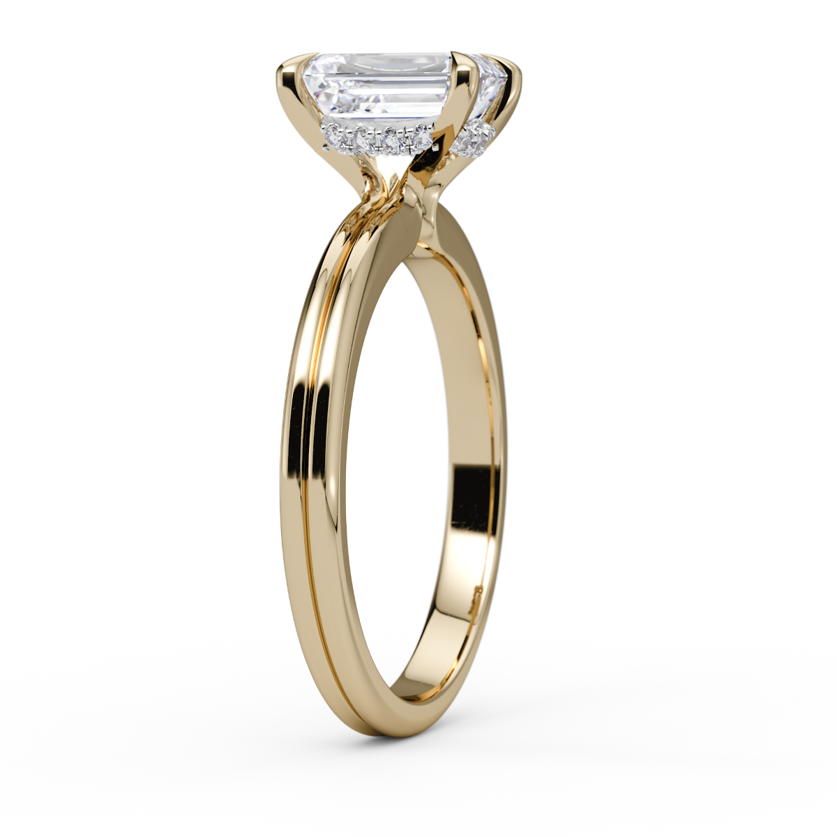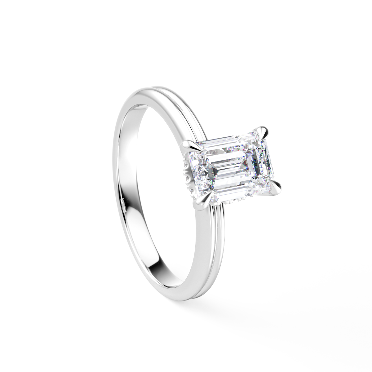 Like a breath of spring air, this emerald cut solitaire feels fresh, luminous, and impossibly romantic. Its crisp lines and hidden halo whisper elegance, holding a quiet kind of magic only true love knows. A timeless symbol of clarity and devotion—meant for the kind of love that blooms endlessly.