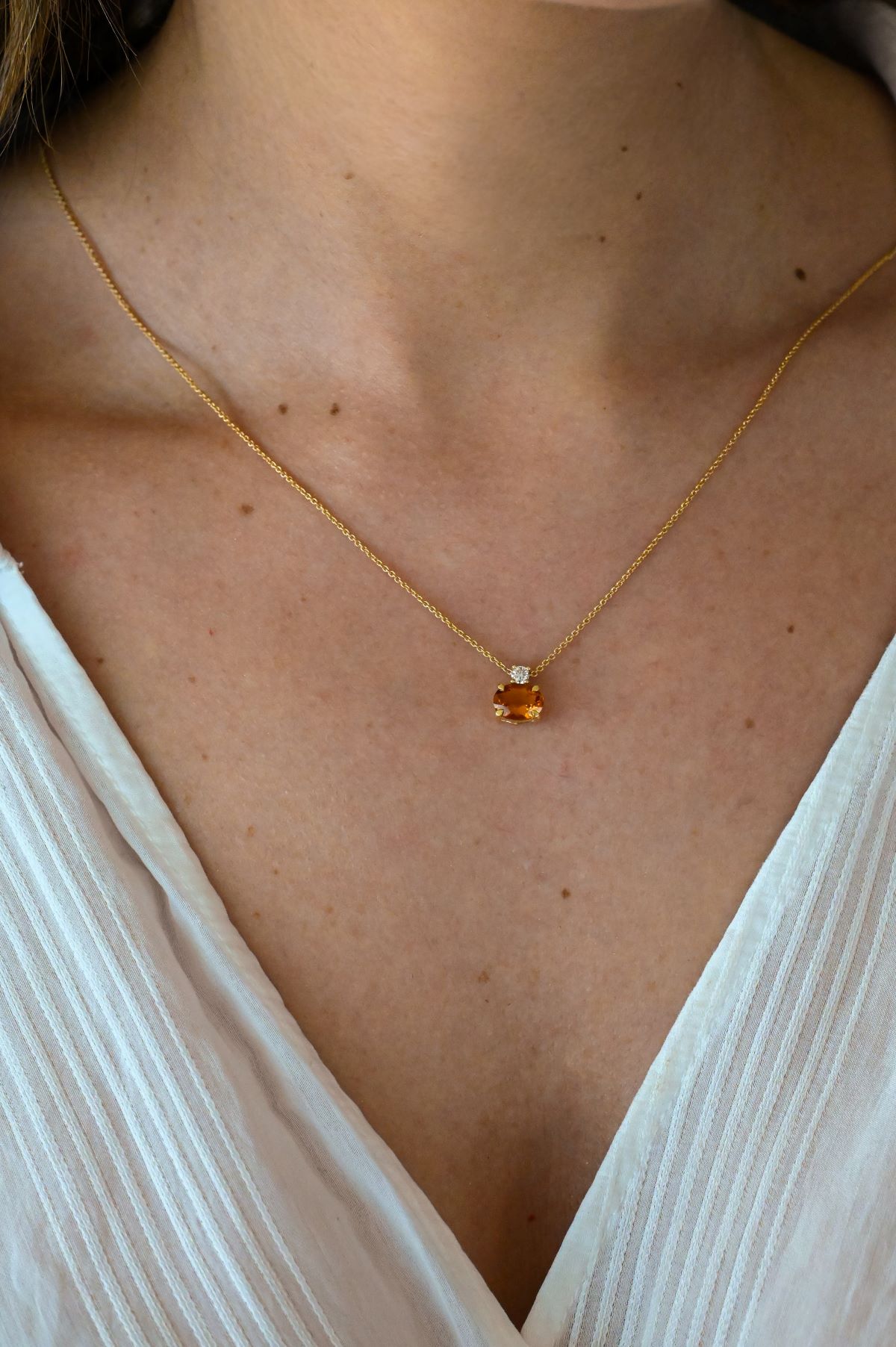 This elegant pendant is crafted in 18 karat yellow gold and features a classic drop design. It is traverse-set with a 1.01 carat oval faceted natural Citrine, radiating warm golden hues. A 0.10 carat round brilliant cut natural Diamond, graded VS clarity and F-G colour, adds a refined sparkle. The piece is completed with a fine gold chain, offering a timeless and sophisticated look.