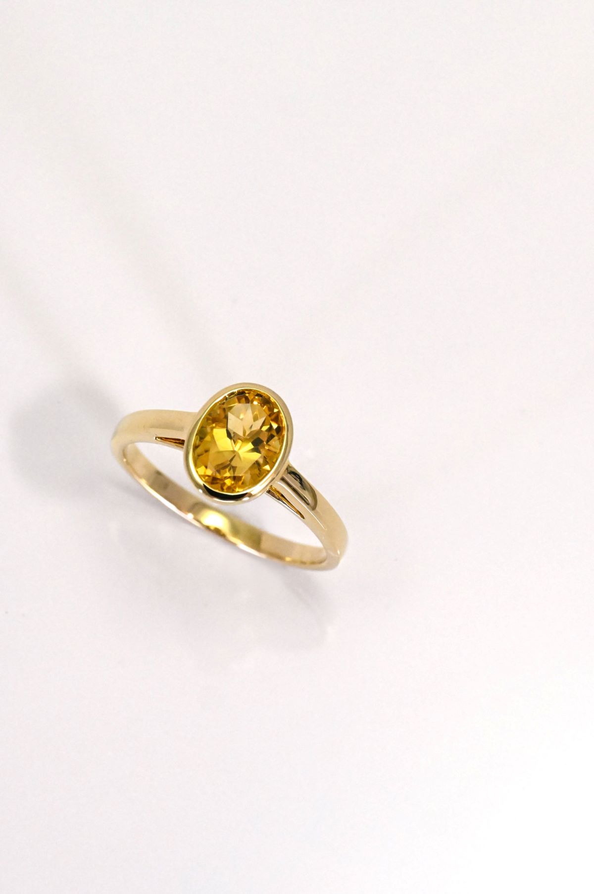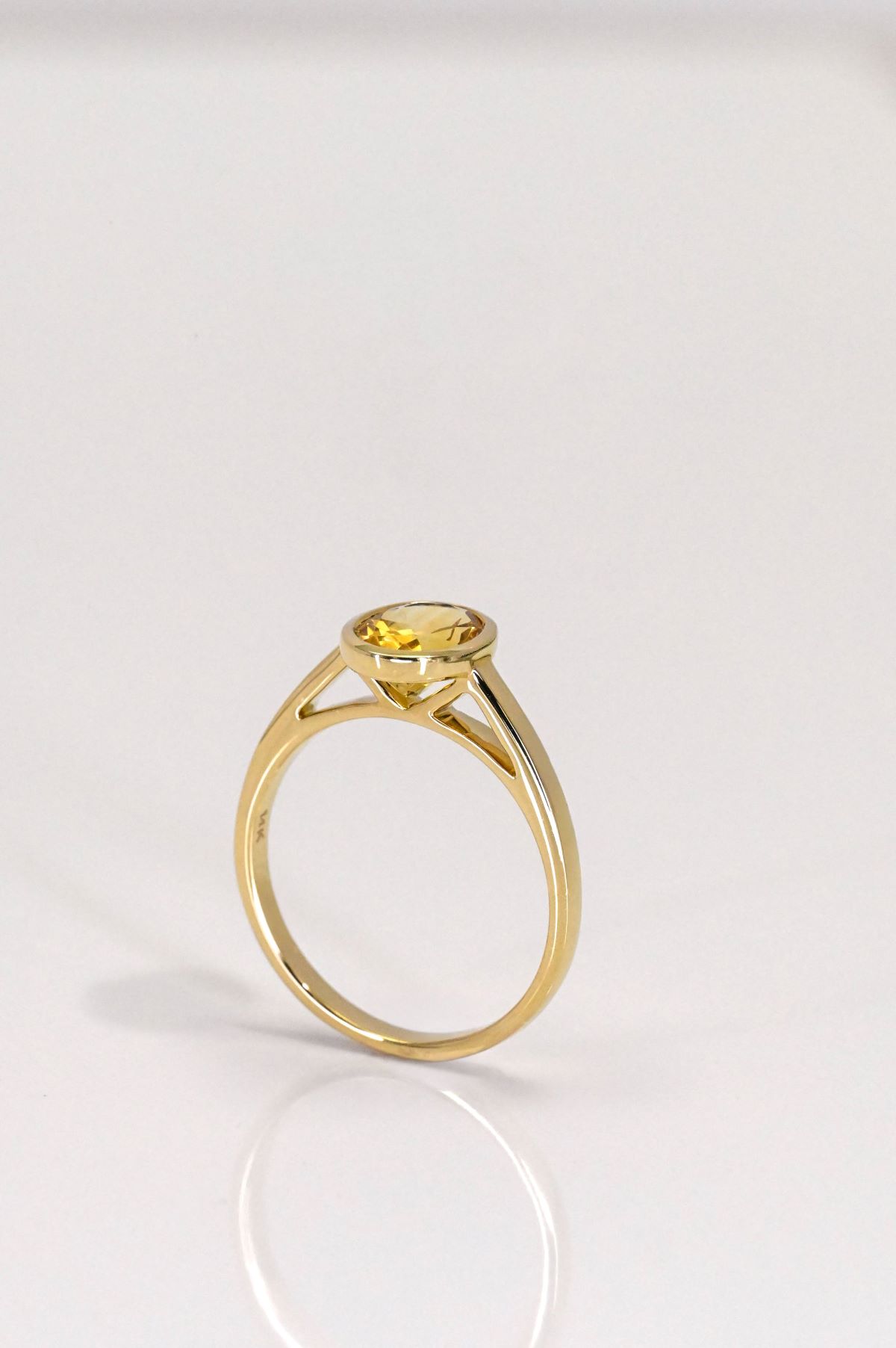 Crafted in 14Kt yellow gold, this elegant ring features a 1.04ct oval faceted natural citrine (8 x 6 mm) in a halo bezel setting. Finished with a narrow half-round band, it offers a sleek, modern silhouette with a warm pop of golden color—perfect for everyday elegance.