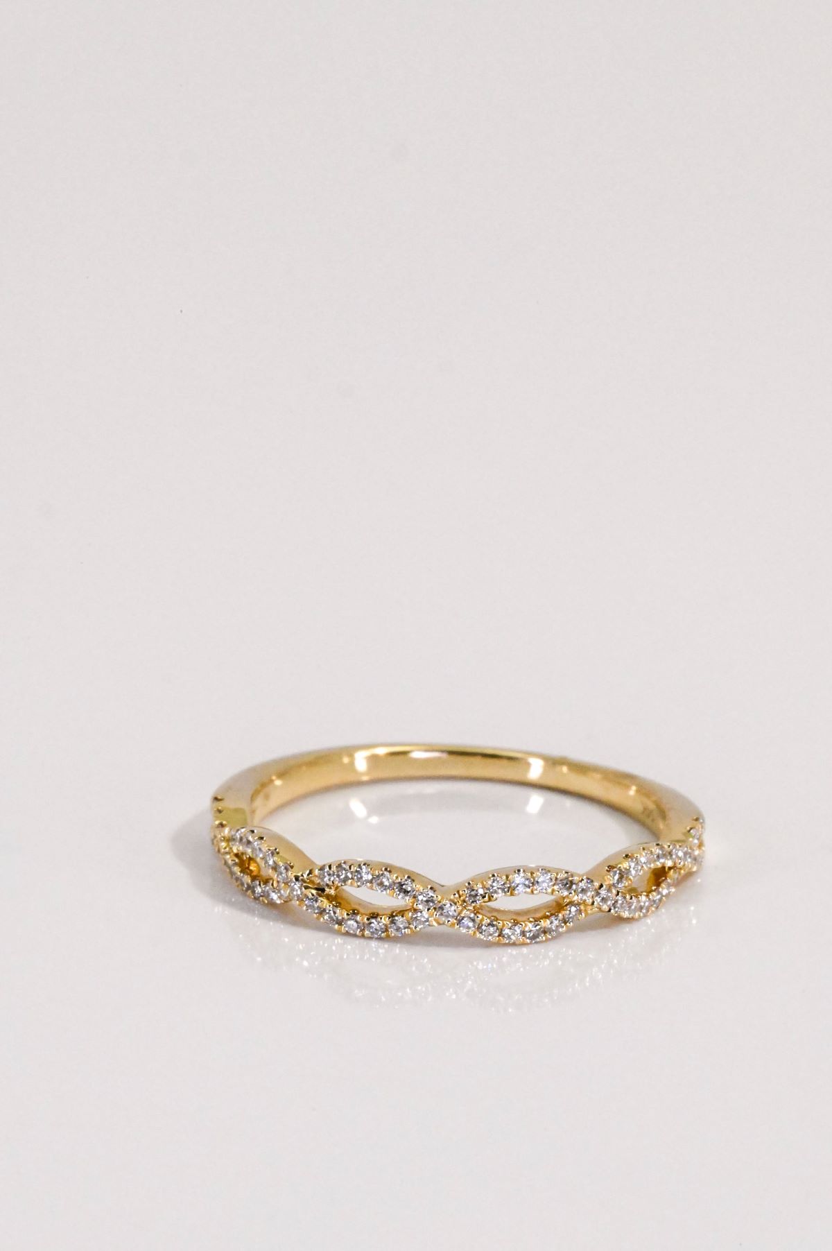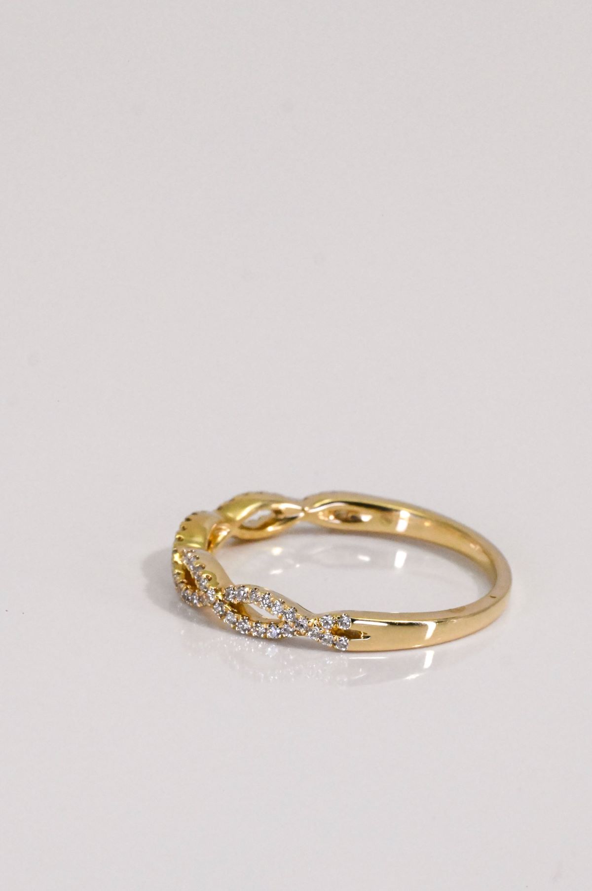 Crafted in 14Kt yellow gold, this elegant crossover-style anniversary ring is micro-set with 63 round brilliant cut natural white diamonds totaling 0.18ct. A delicate and graceful design, perfect for celebrating lasting love with timeless sparkle.