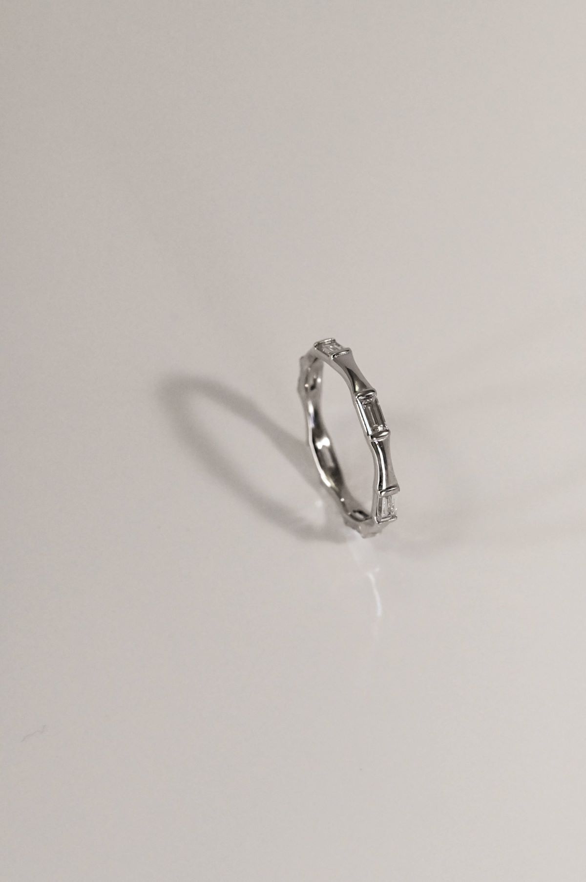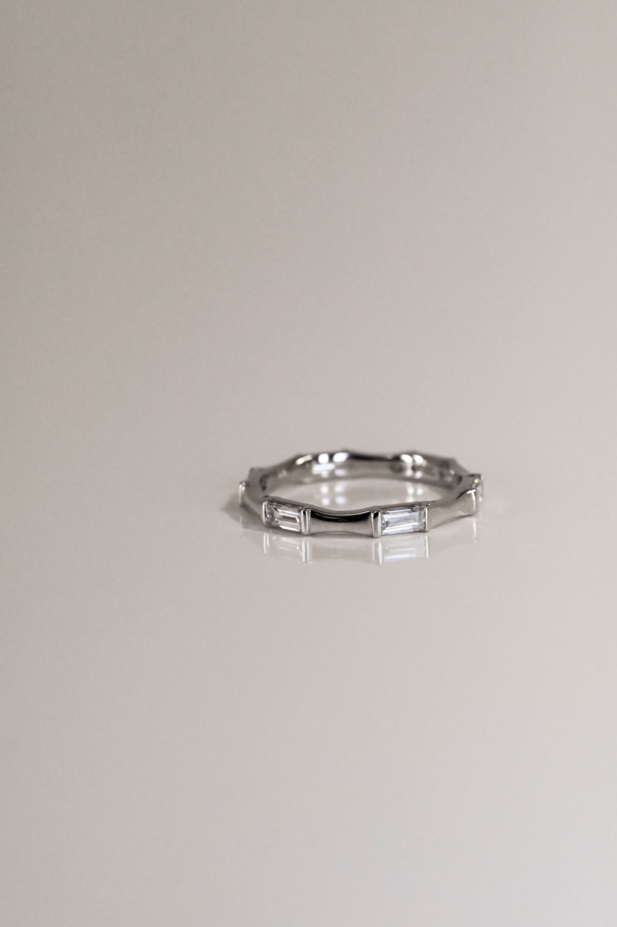Eternity band crafted in white gold, featuring an alternating pattern of curved facet bars and straight baguette-cut diamonds. The design creates a refined play of light and texture, blending modern geometry with timeless elegance — a graceful symbol of enduring love.