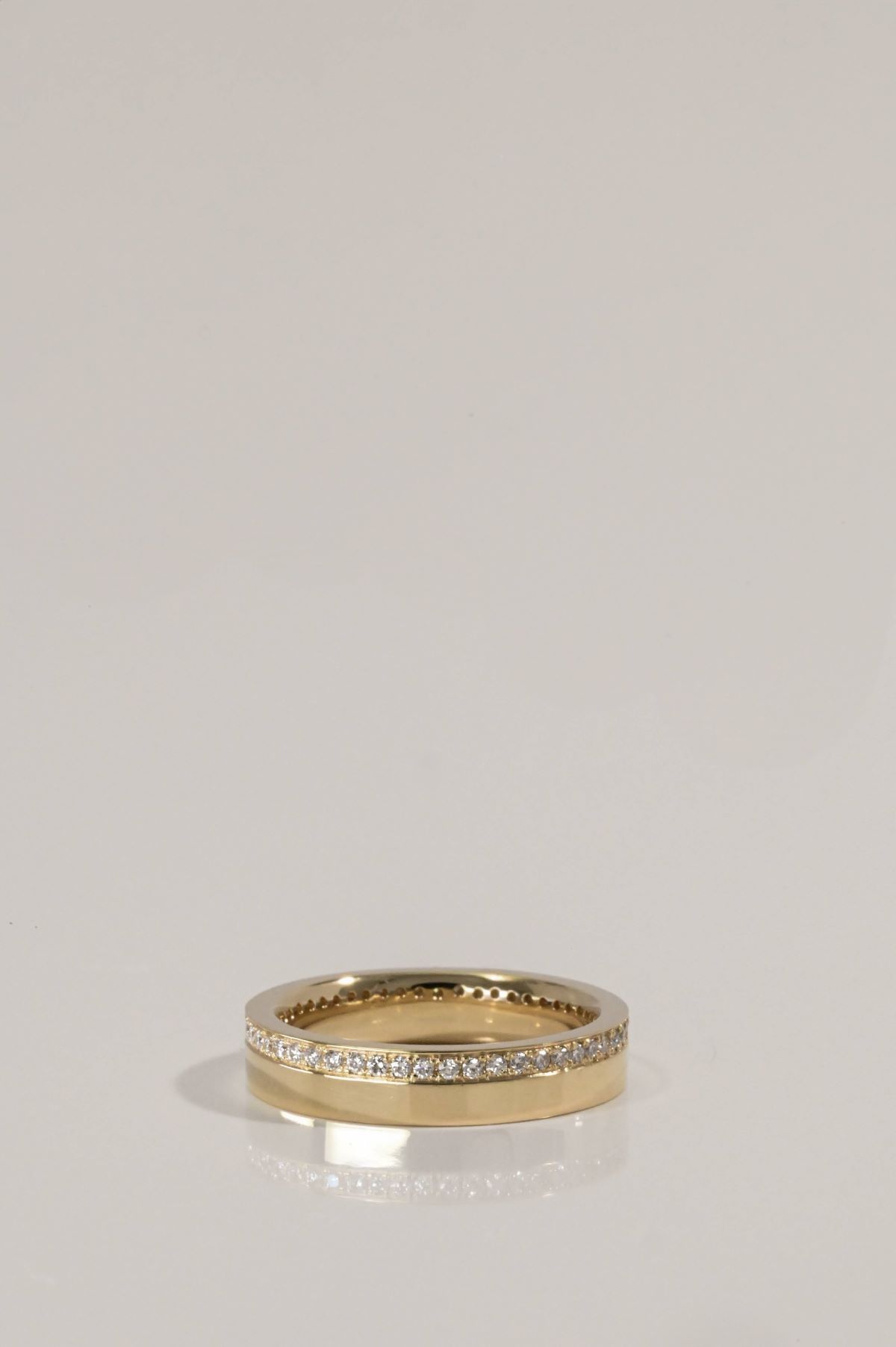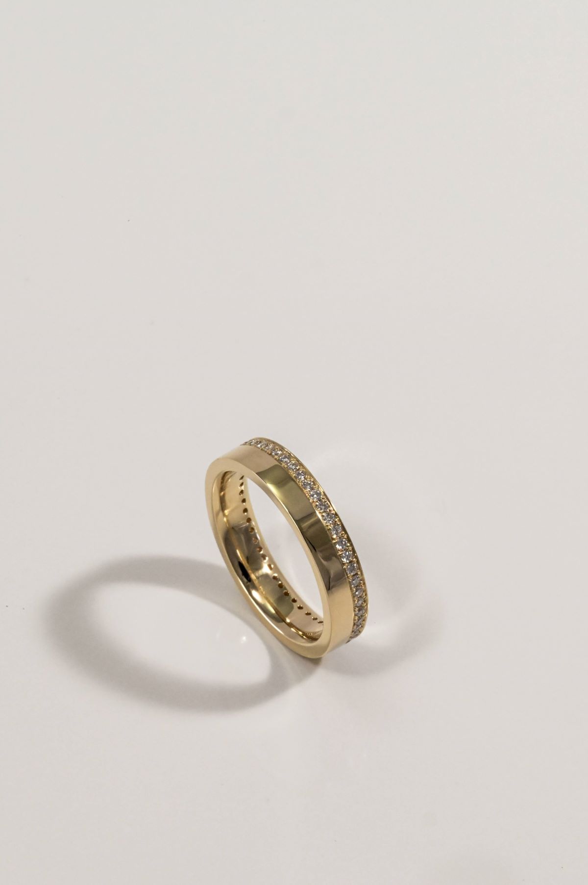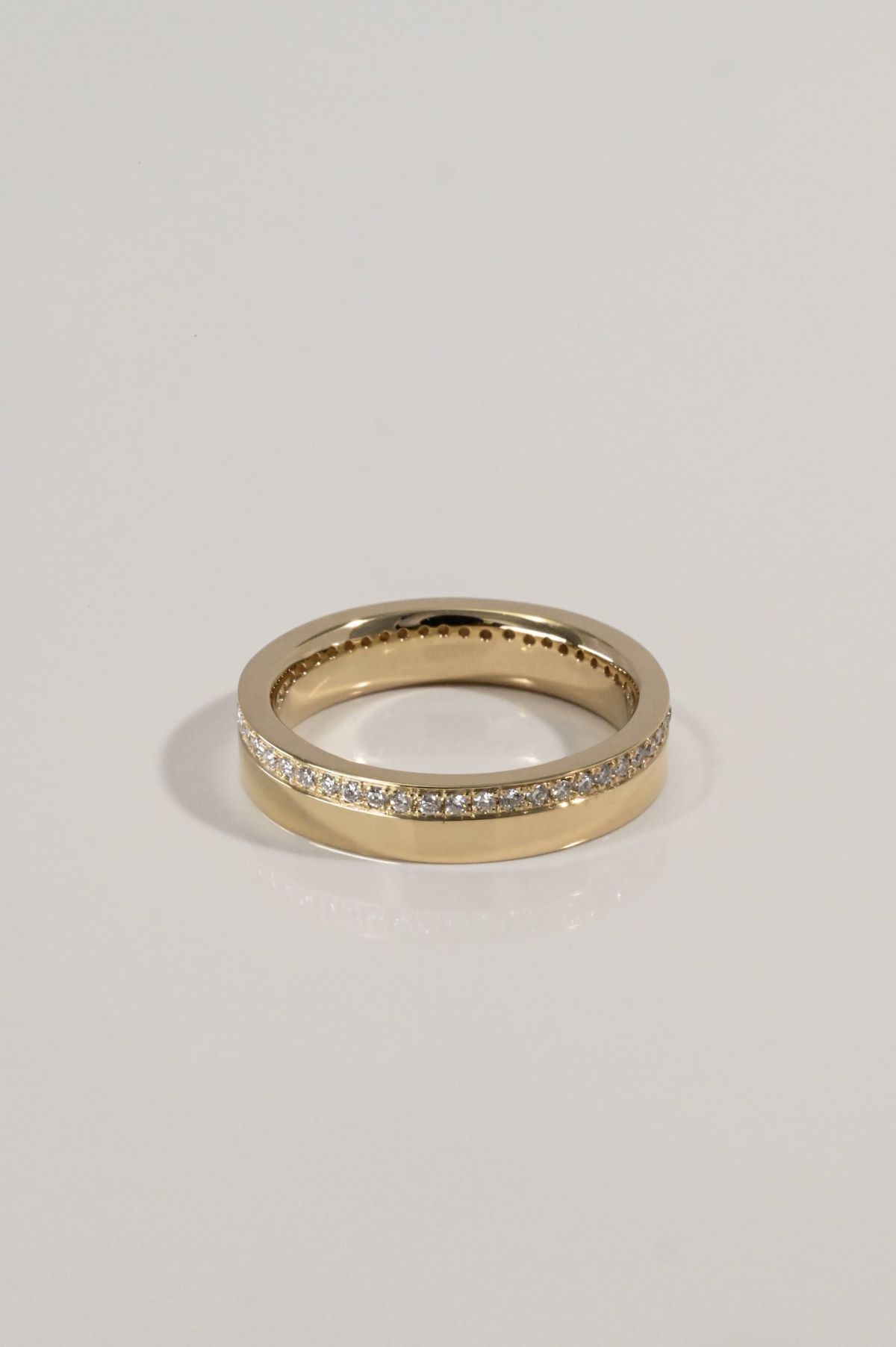 A bold flat cigar band in high polish yellow gold, fully encircled with bead-set round brilliant cut diamonds in a full eternity style.