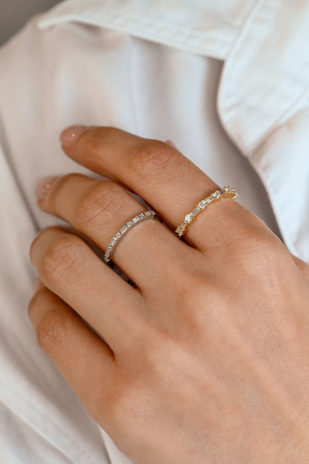 A timeless anniversary or wedding ring crafted in 14kt yellow gold with a classic half-round shank. The design features alternating baguette and round diamond settings arranged in a single level across the head and shoulders, extending just under halfway around the band. Set with 5 baguette cut natural diamonds totaling 0.20cts. and 6 round brilliant cut natural diamonds totaling 0.23cts., this piece blends modern geometry with classic brilliance.