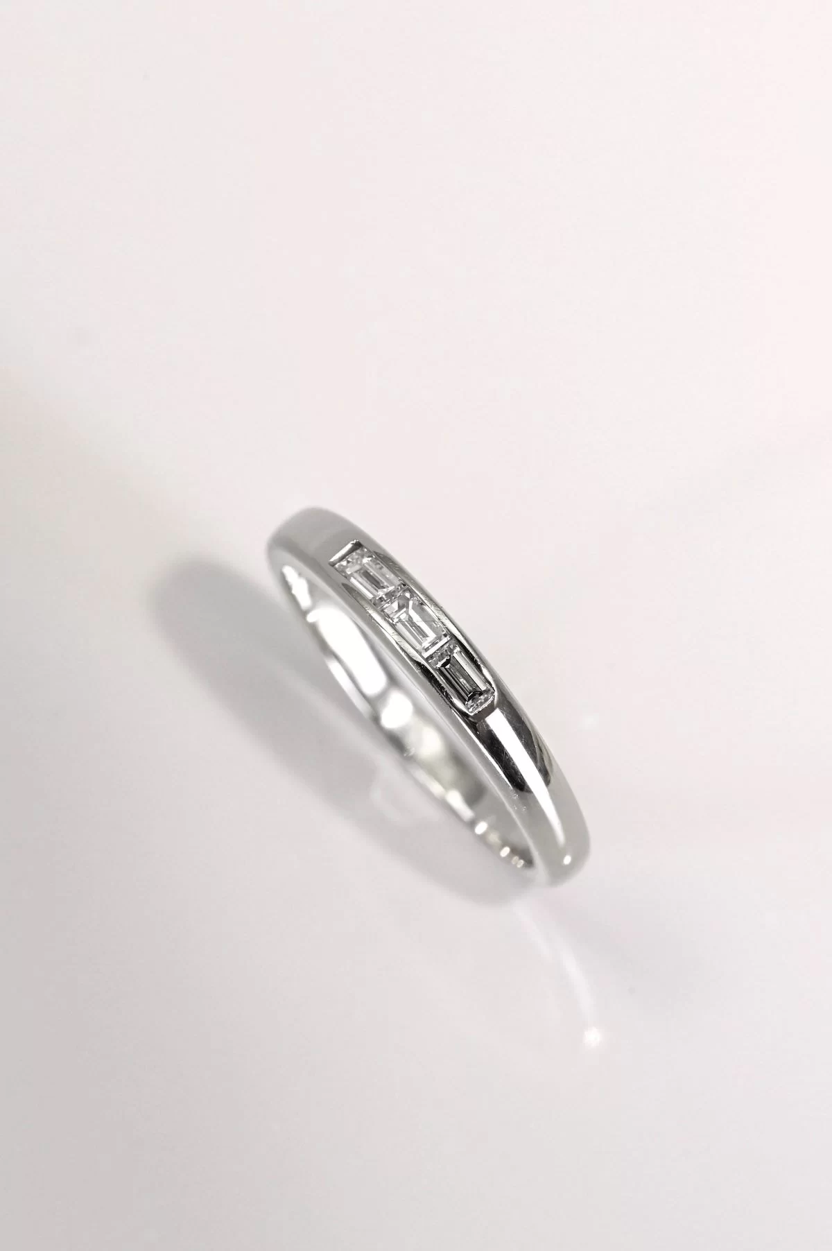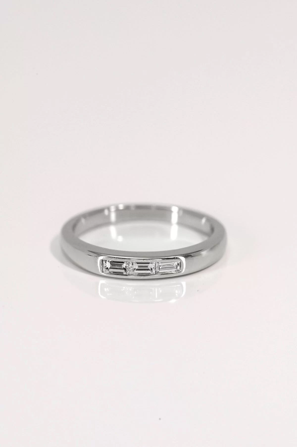 This 18k white gold three-stone ring features a sleek, modern design with three flush channel-set baguette diamonds totaling 0.24 ct. The straight baguettes create a clean, linear aesthetic that exudes contemporary sophistication, while the polished white gold band enhances the brilliance and clarity of each diamond, making it an elegant statement piece for any occasion.