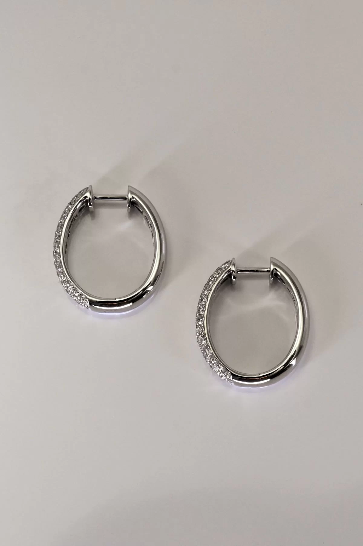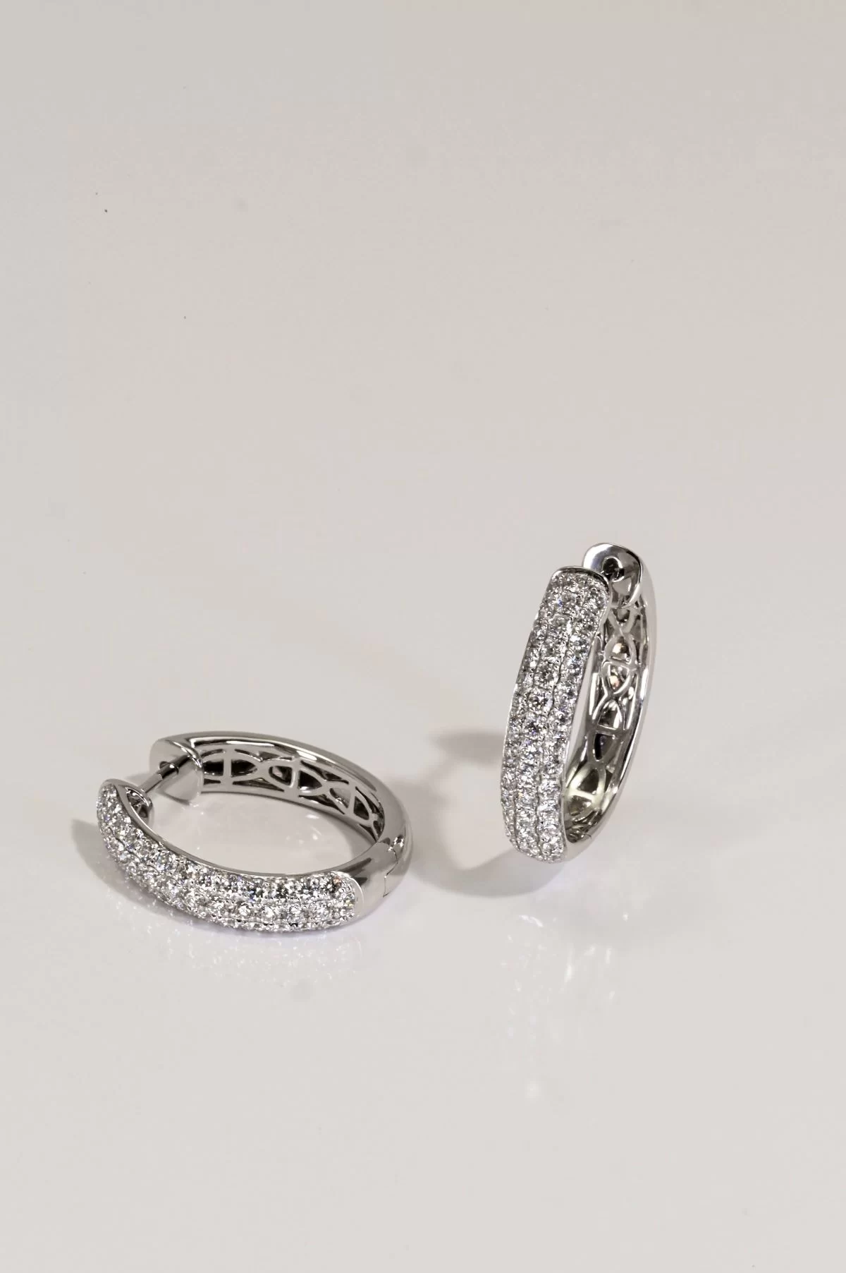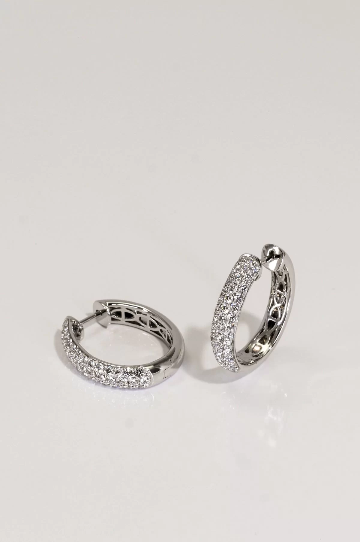 These sophisticated huggie-style hoop earrings are crafted in 14Kt white gold with a high-polish finish. Featuring three rows of pavé-set round brilliant cut diamonds totaling 1.49 carats (SI1 clarity, F color), they offer exceptional sparkle in a sleek, close-to-the-ear design. Perfect for both everyday luxury and special occasions.