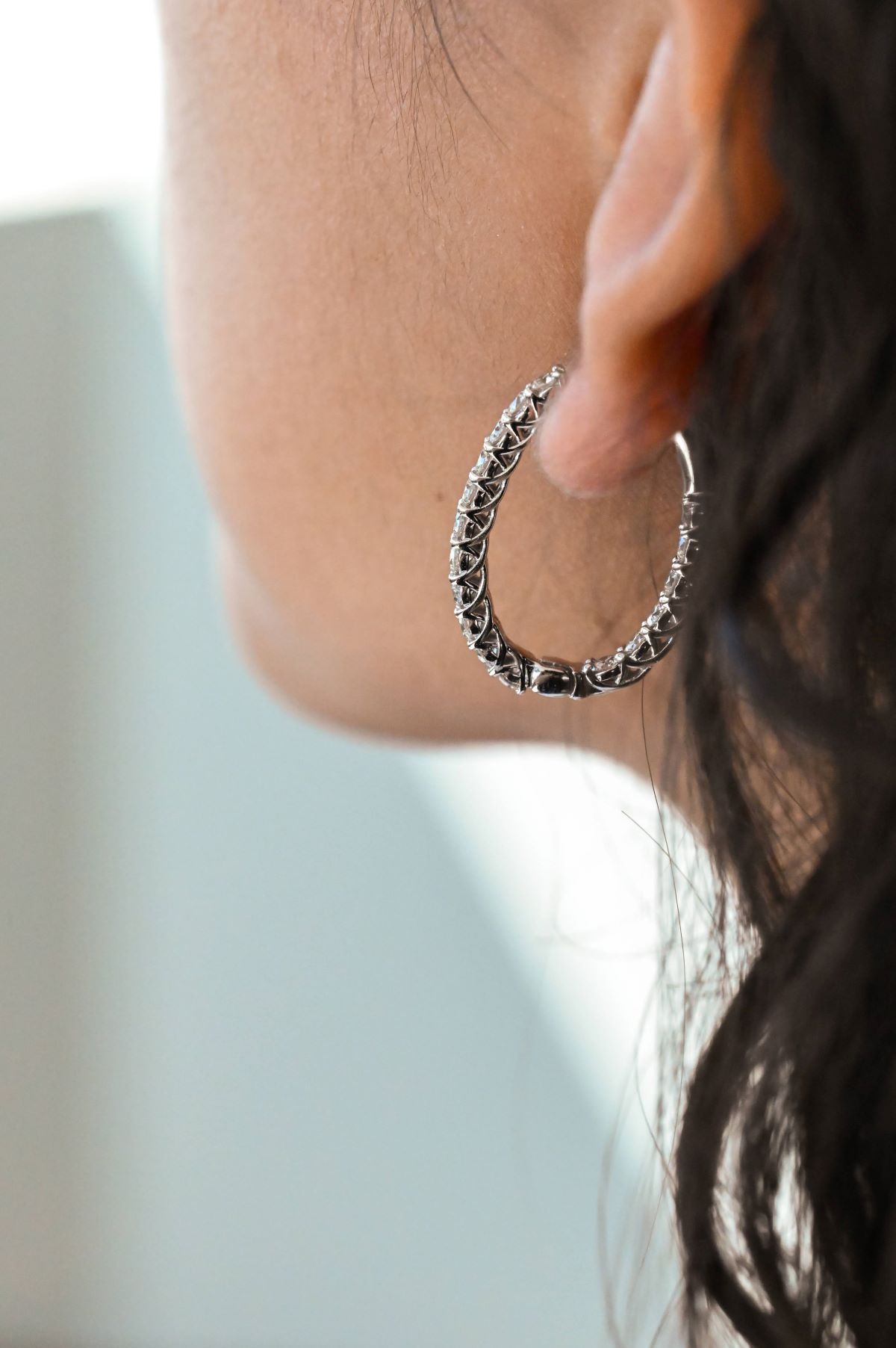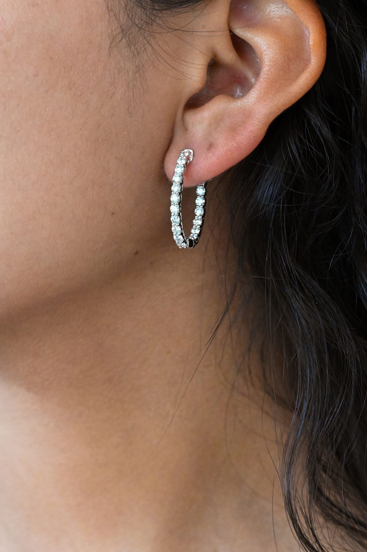 This pair of 14k white gold oval hoop earrings showcases a refined inside-outside design, measuring 1.00 inch with a sleek, high-polish finish. Set with 2.00 cts total weight of round brilliant-cut natural diamonds, graded VS clarity and GH color, they deliver dazzling sparkle and timeless elegance, making them a sophisticated statement accessory.