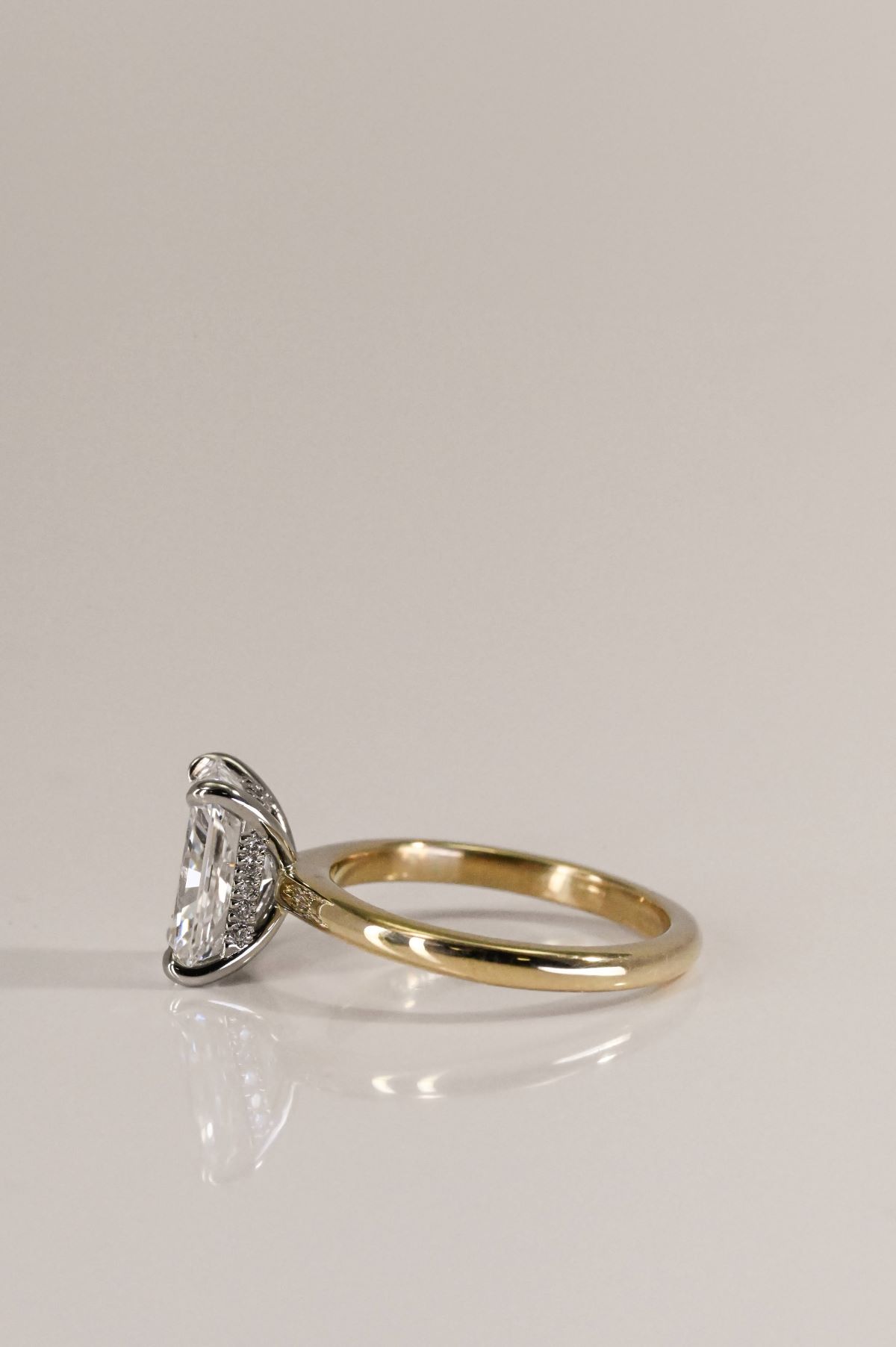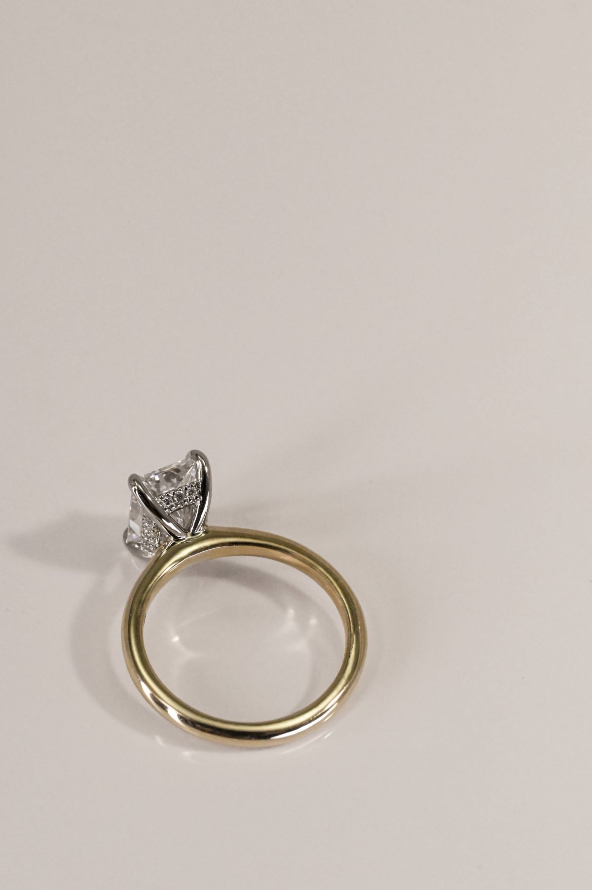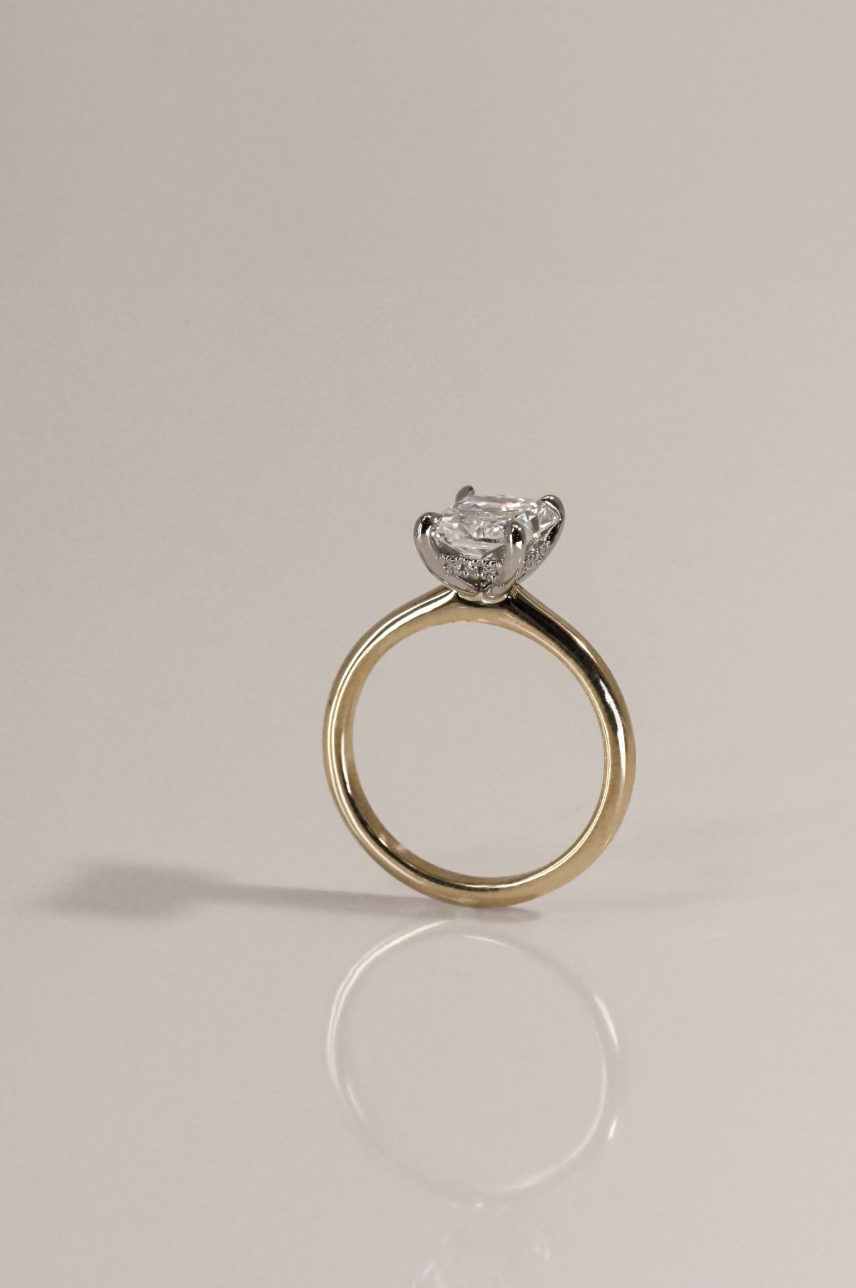 Modern yet timeless, this solitaire engagement ring showcases a brilliant radiant-cut diamond secured in a sleek white gold head. The diamond floats above a polished yellow gold shank, creating a striking two-tone contrast that highlights its beauty. A hidden halo of sparkling diamonds rests beneath the center stone, offering a touch of secret brilliance visible only from certain angles. Elegant, refined, and full of meaning, this design blends classic craftsmanship with contemporary style.