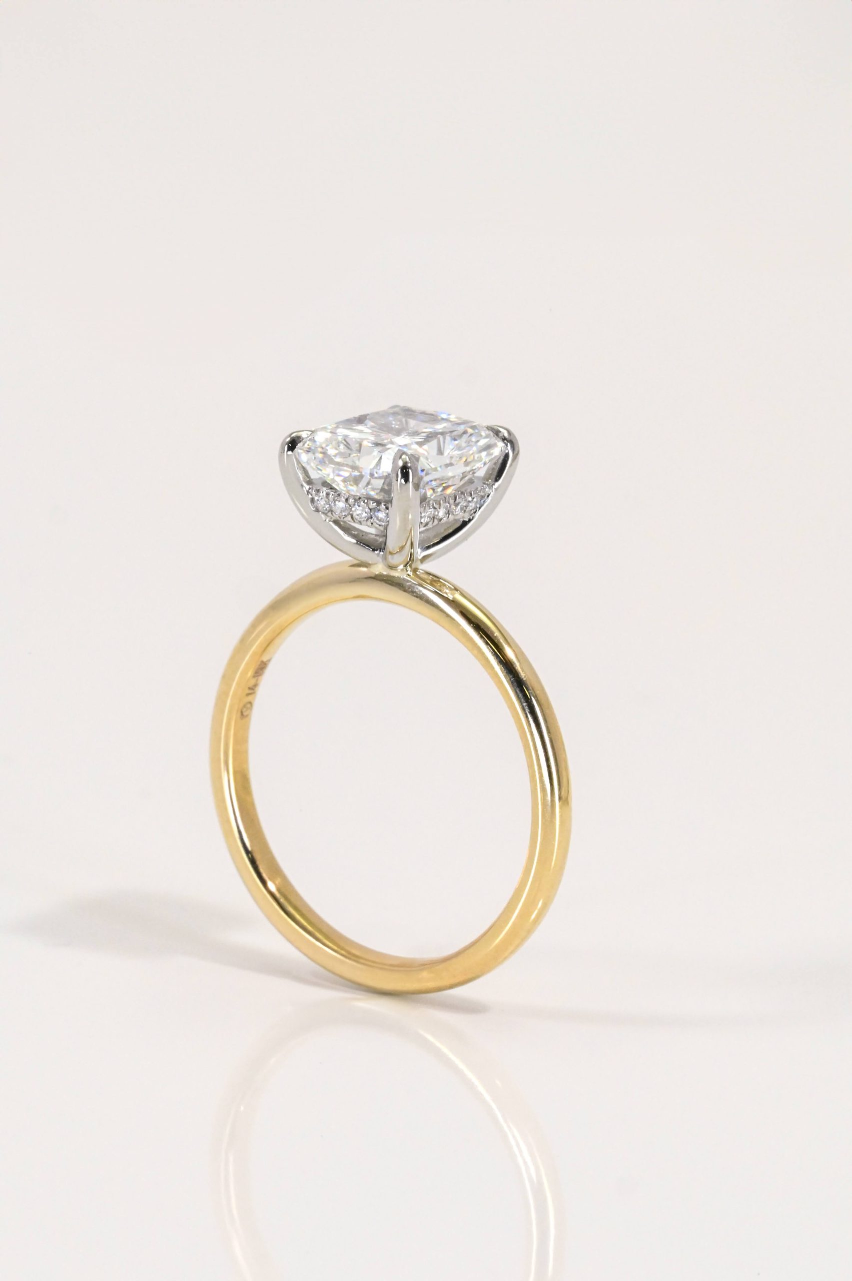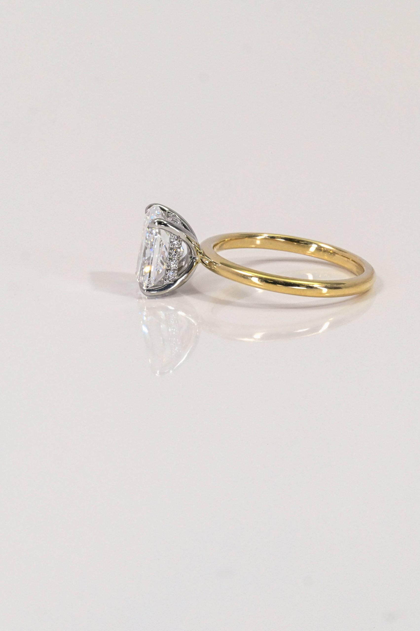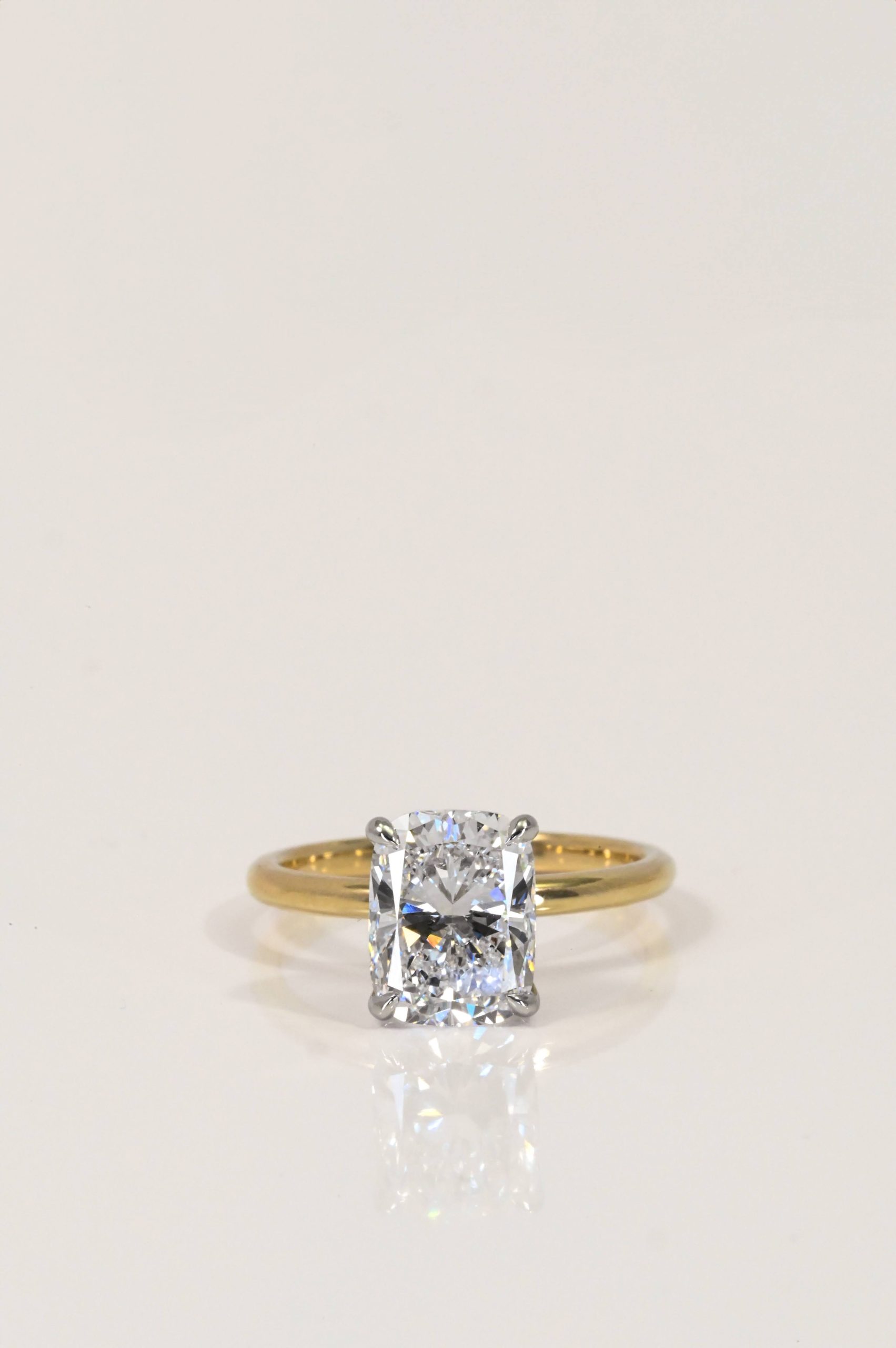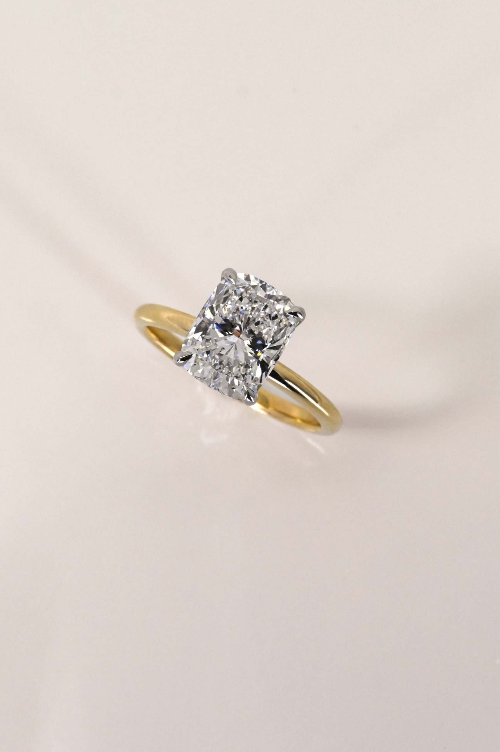 A timeless symbol of love, this solitaire engagement ring features a cushion-cut diamond set in a refined white gold head with a soft V design. Beneath the center stone, a hidden halo of sparkling diamonds adds a touch of secret brilliance, visible only from select angles. The diamond is paired with a classic yellow gold half-round shank, blending warmth and elegance with modern craftsmanship. A perfect harmony of subtle detail and enduring style.