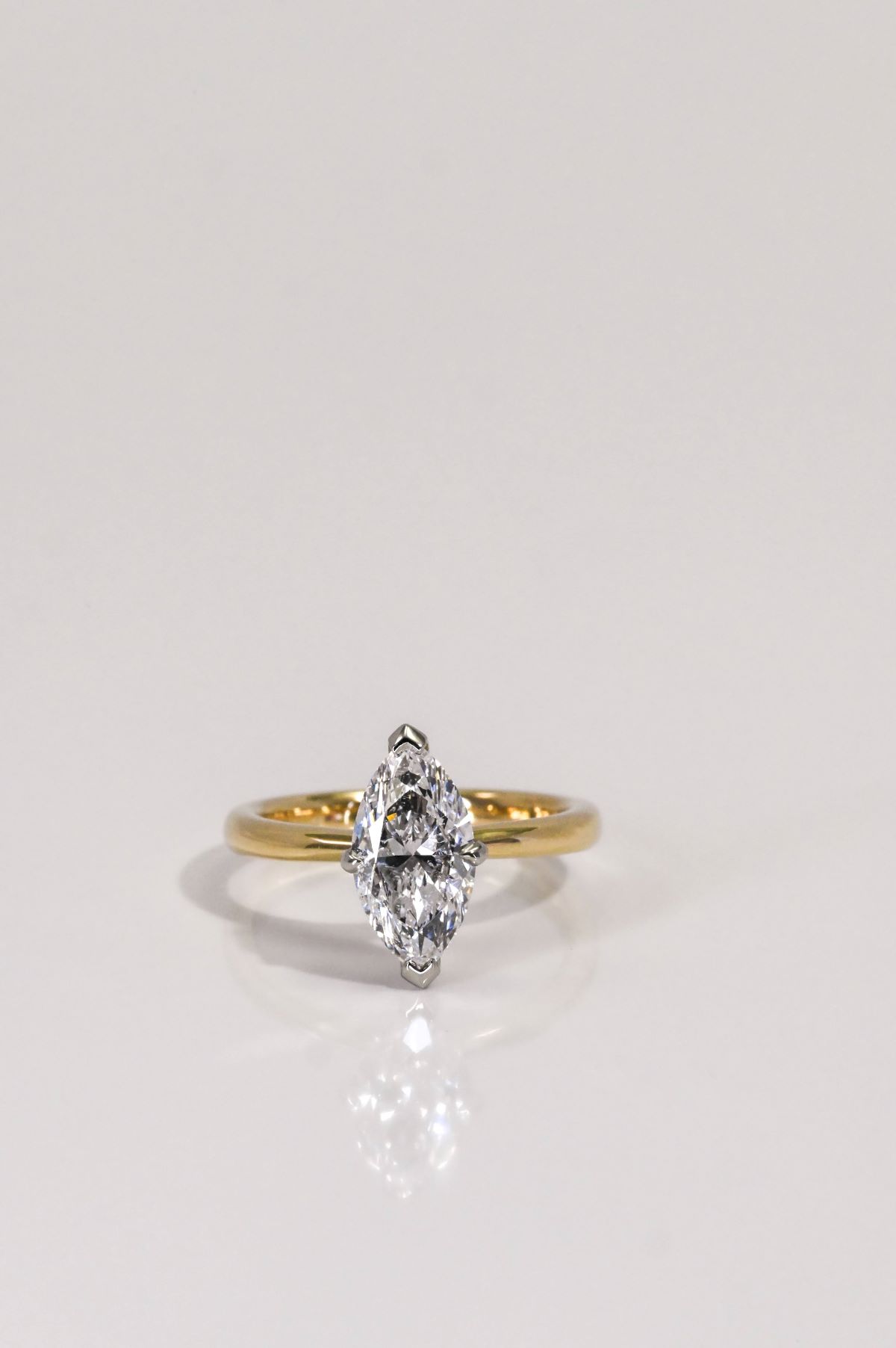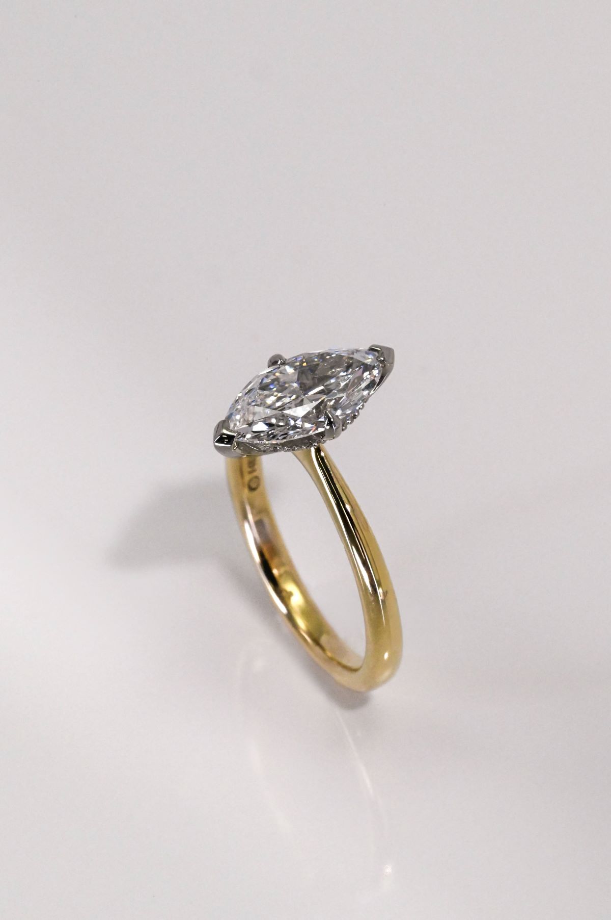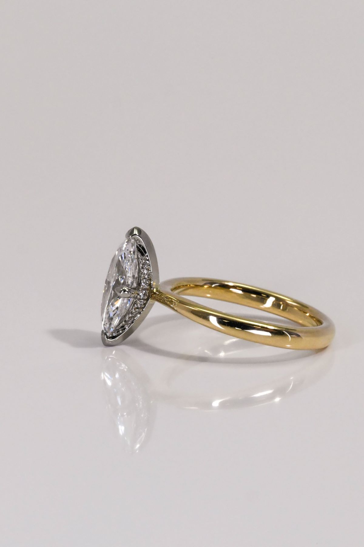This elegant cathedral-style solitaire features a marquise-cut diamond set in a refined white gold head, perfectly complemented by a yellow gold reverse-taper shank for a graceful silhouette. A curved hidden halo of sparkling diamonds rests beneath the center stone, adding a touch of secret brilliance and dimension. Blending timeless craftsmanship with modern detail, this design captures both strength and sophistication in a truly romantic setting.