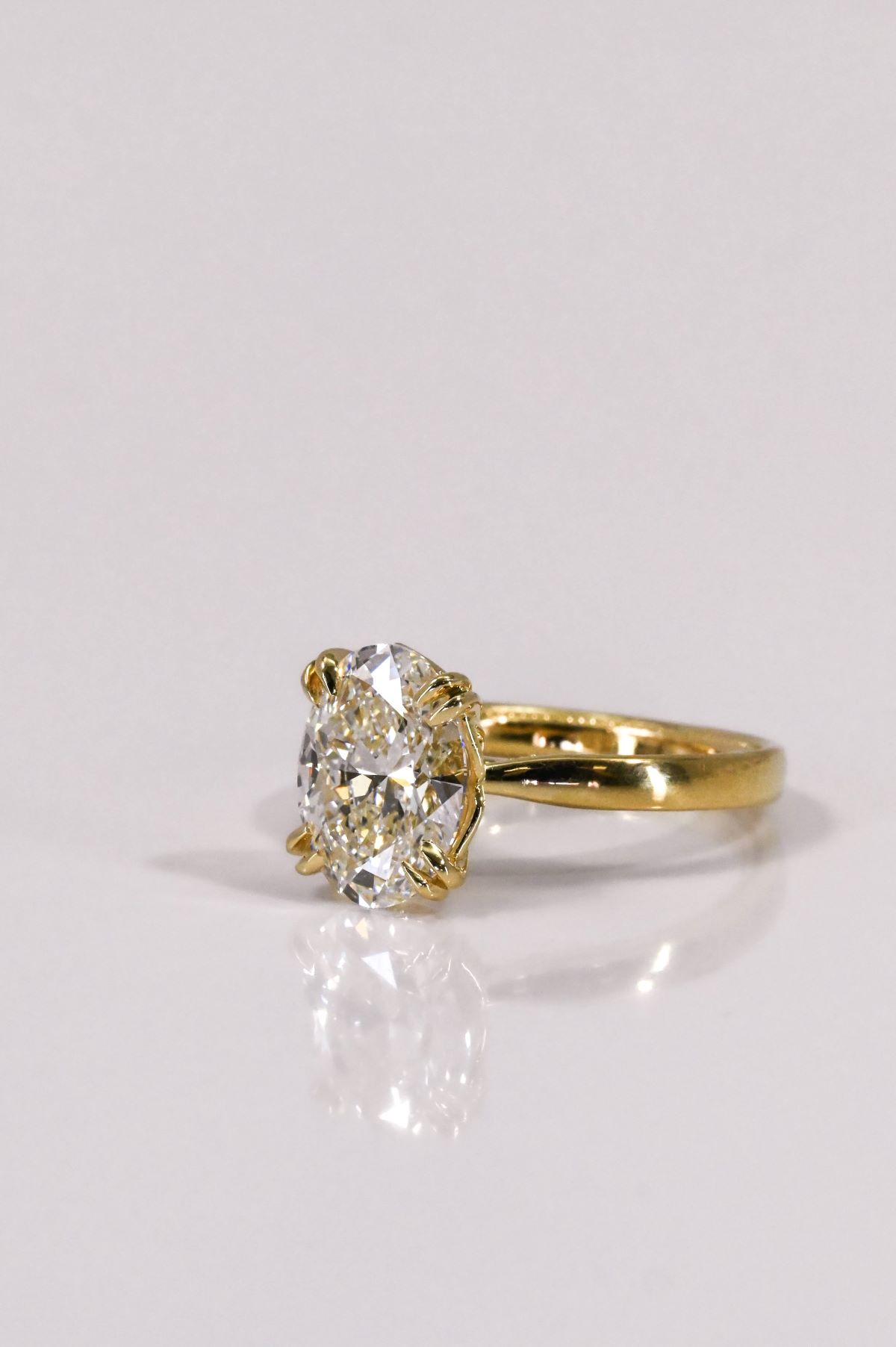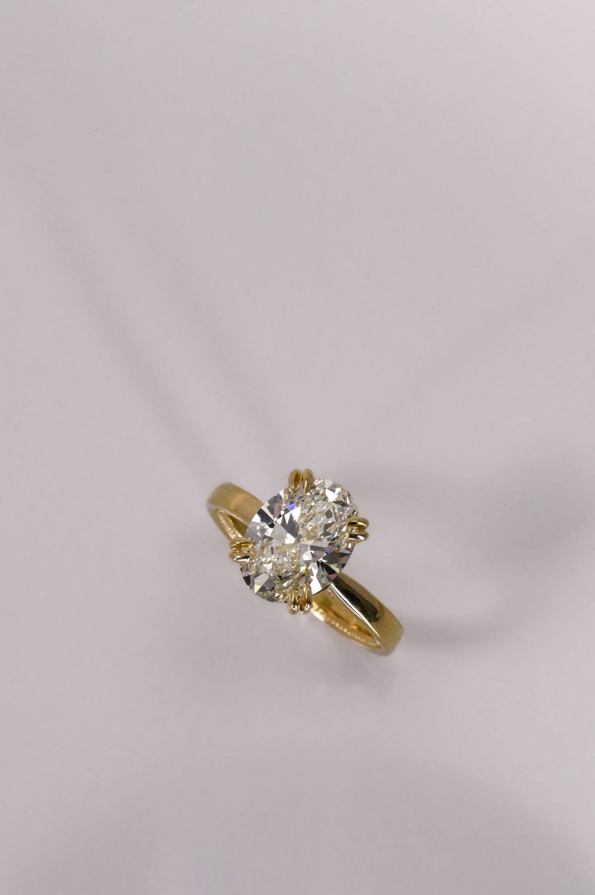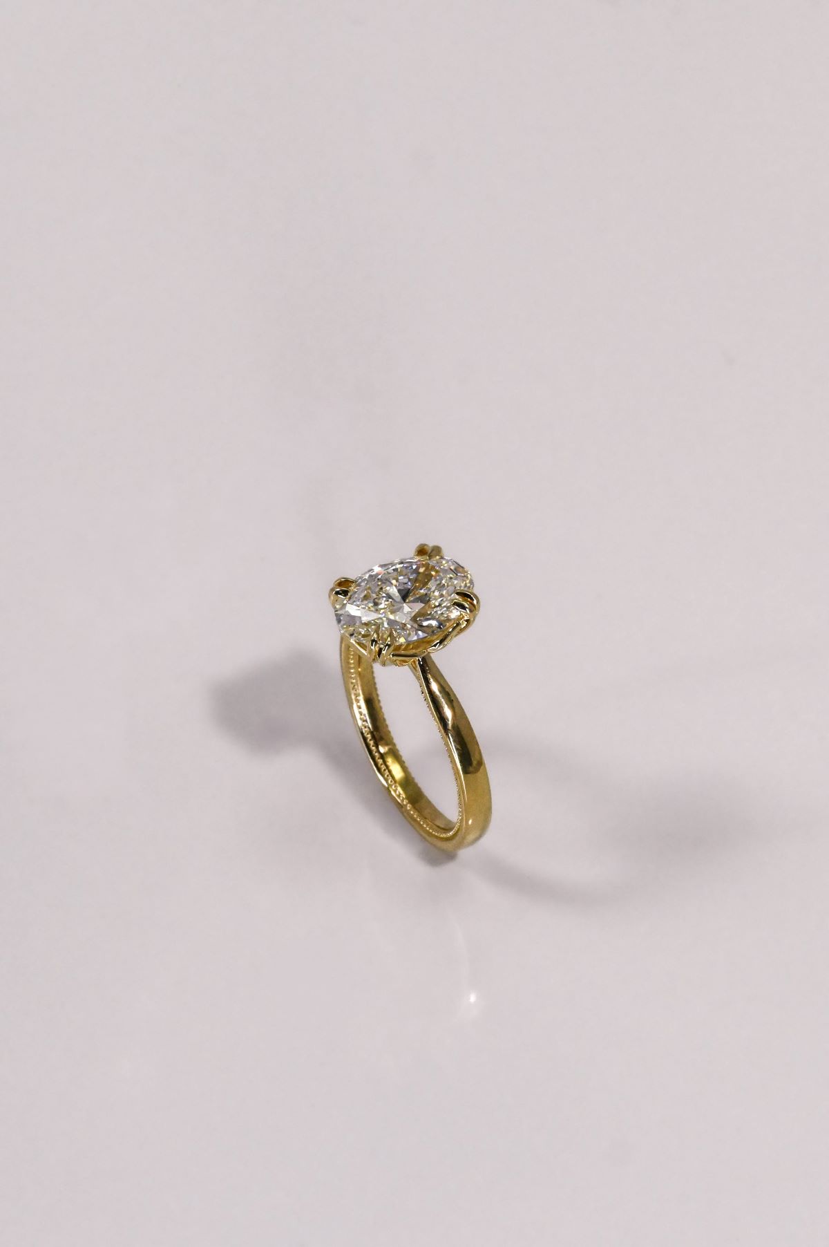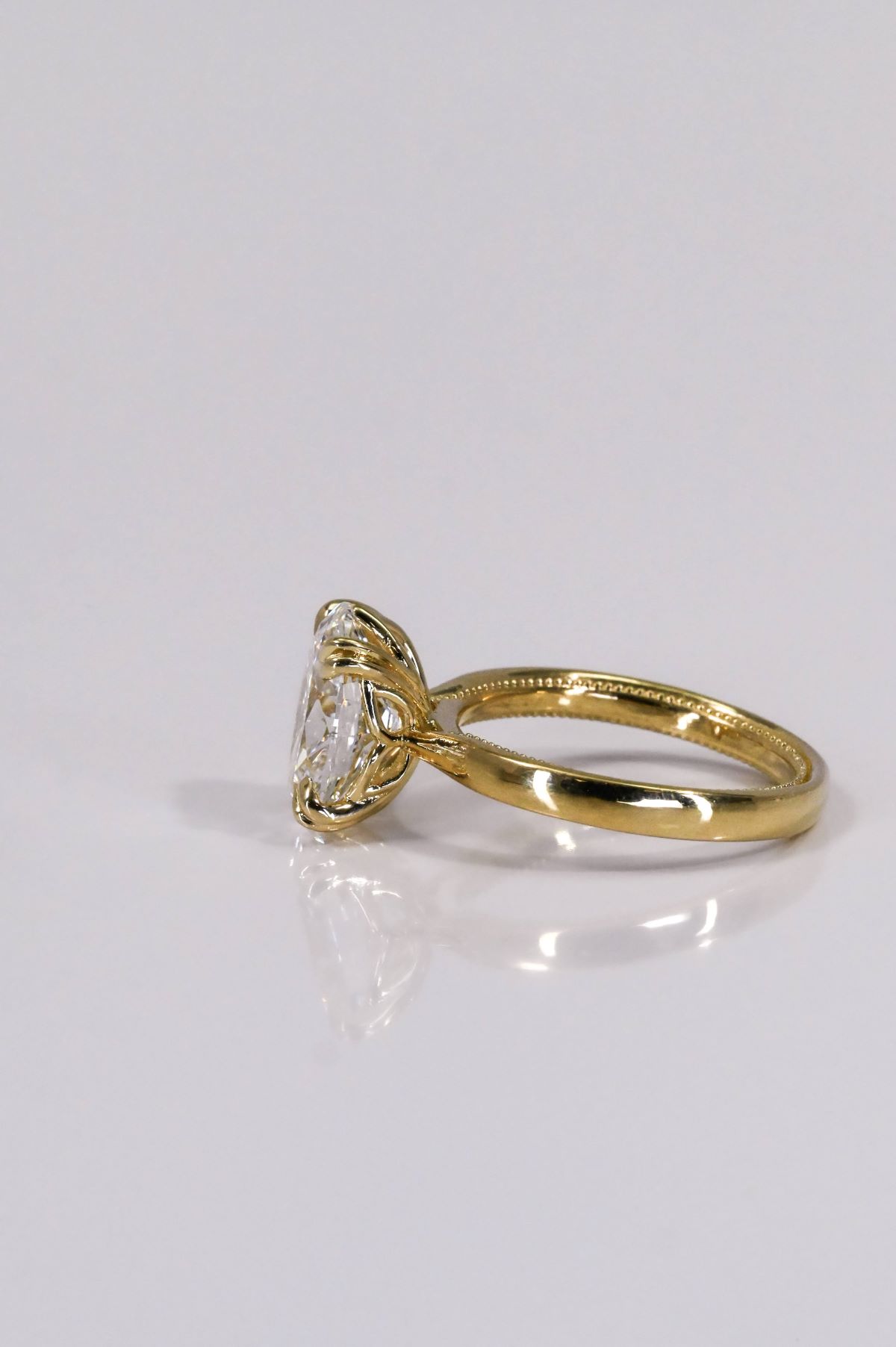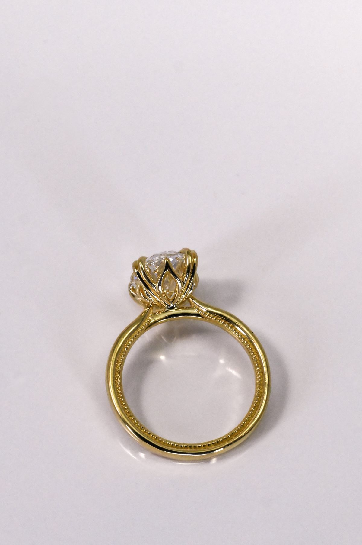 A celebration of grace and devotion, this yellow gold engagement ring features an open cathedral design that lifts the setting in a gentle arch, symbolizing strength and unity. The milgrain-detailed sleeve adds a touch of vintage romance, while the tulip-style head with double claws cradles the center stone like a blossom in bloom. Exquisitely crafted, it captures the timeless beauty of love — delicate, enduring, and forever radiant.