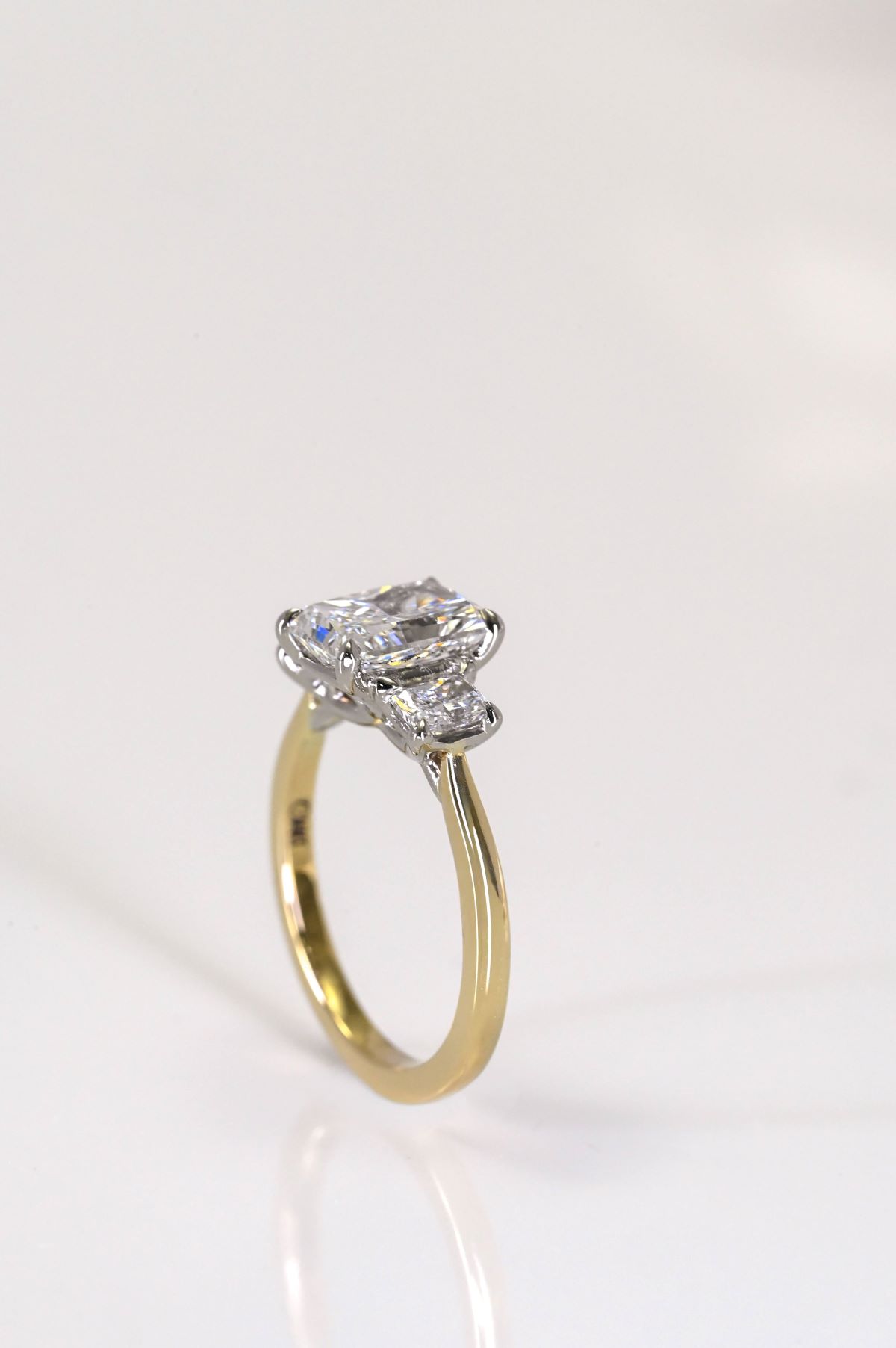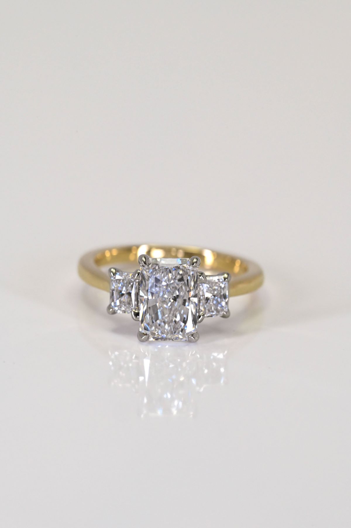 A timeless three stone engagement ring featuring a yellow gold shank paired with a white gold head. Set with a radiant cut centre stone, flanked by matching radiant cut shoulder stones, creating balanced brilliance and elegant contrast. Classic design with a modern, refined finish.