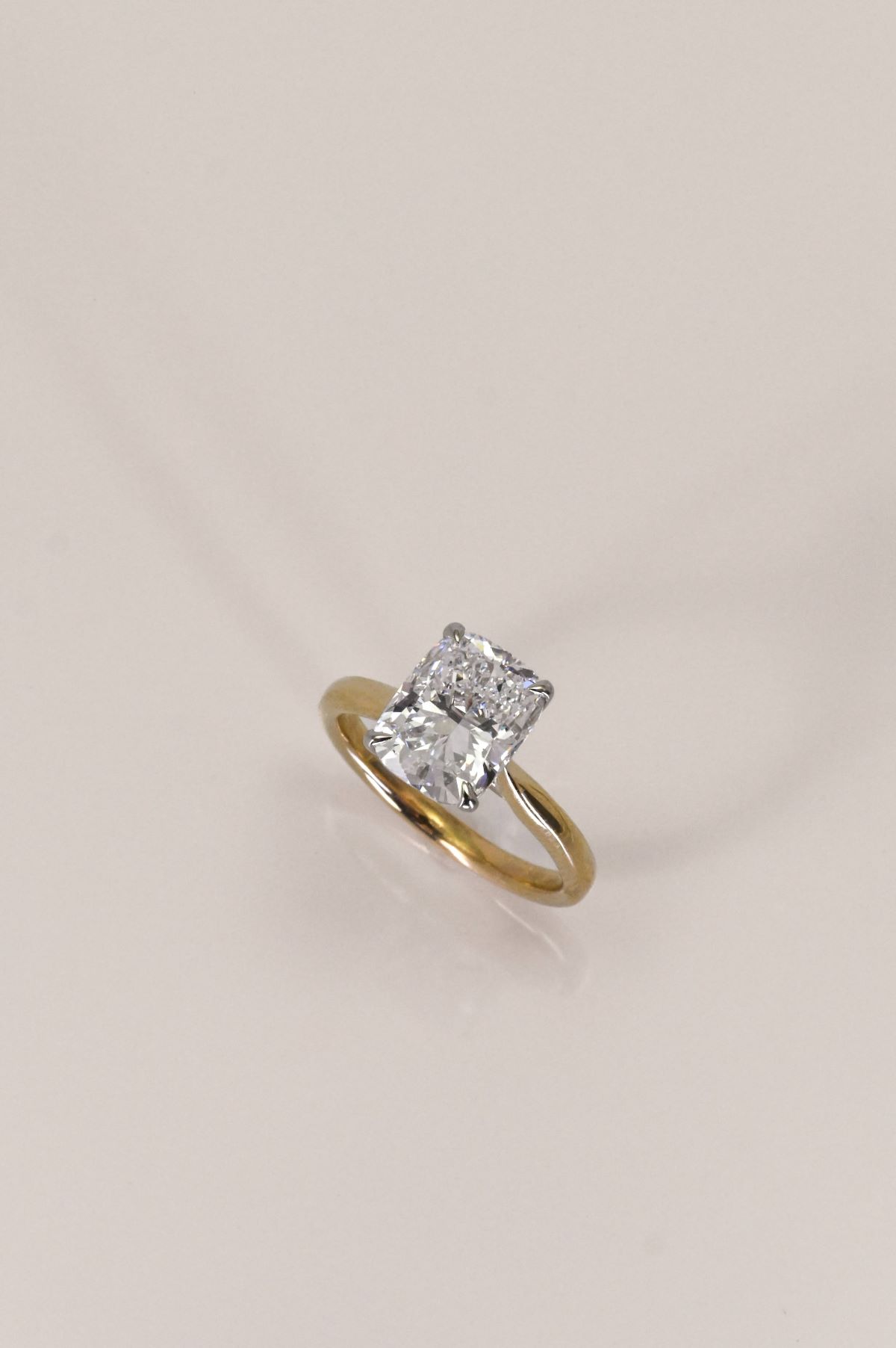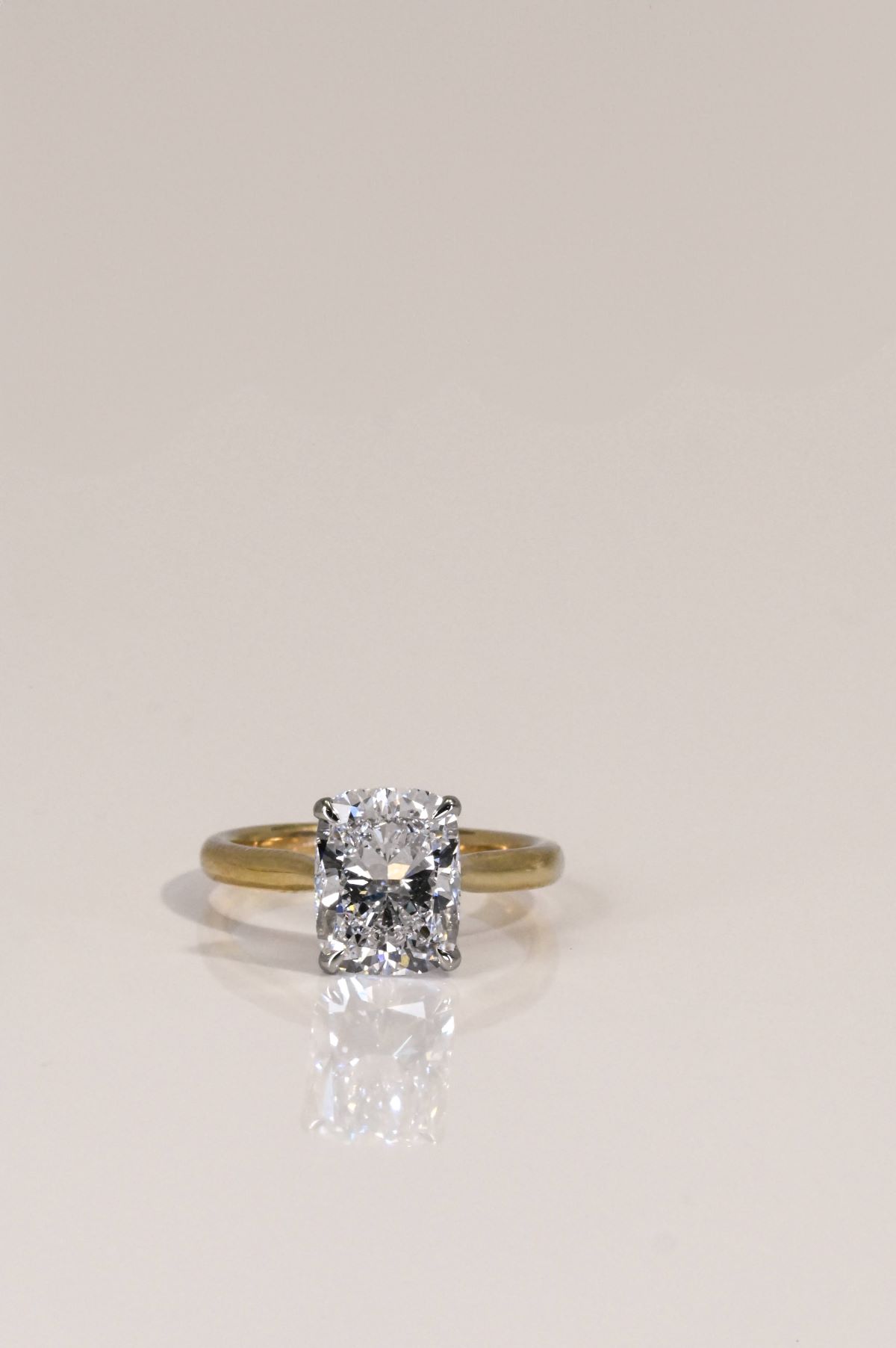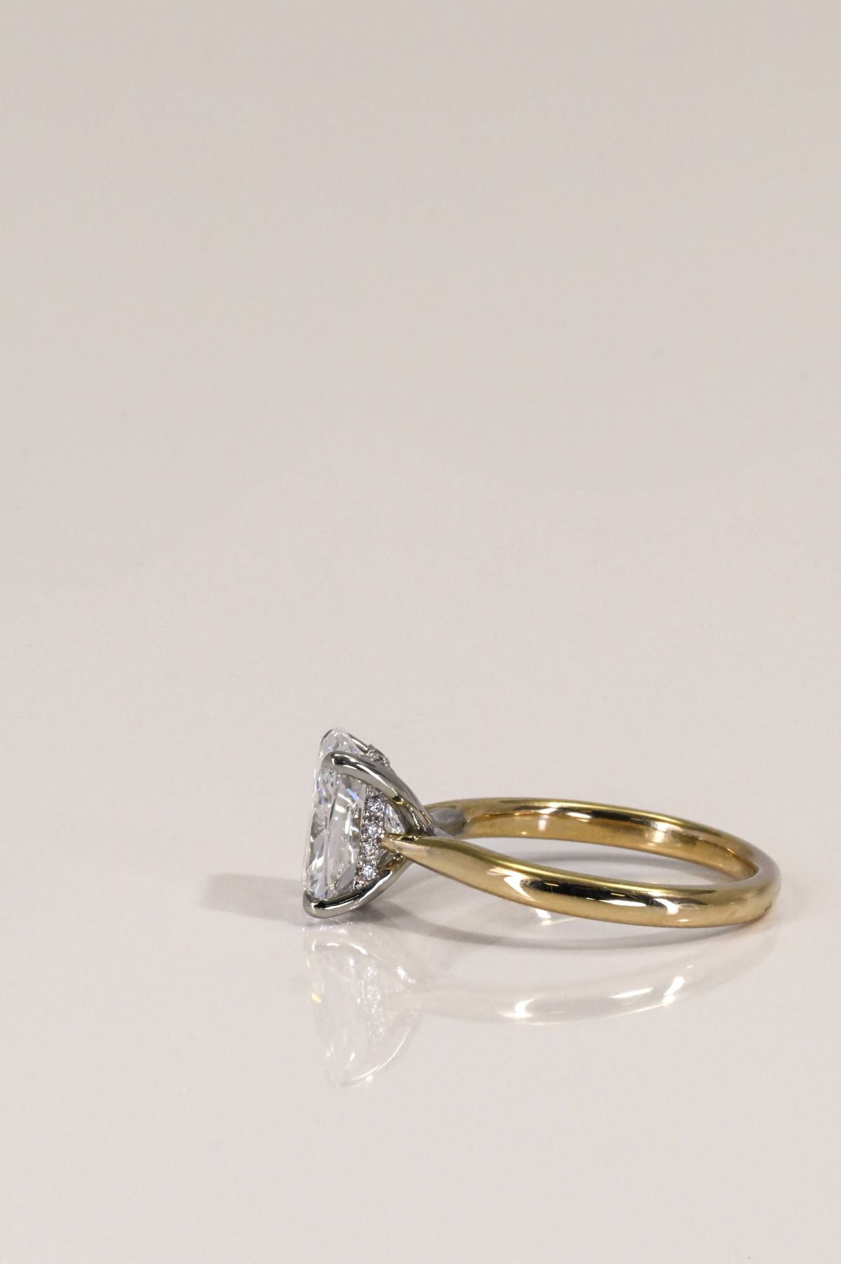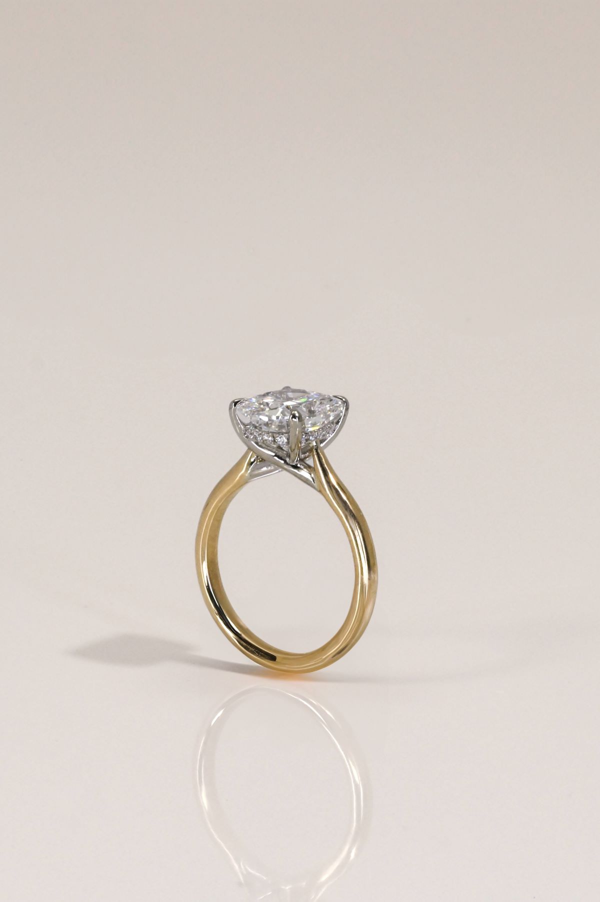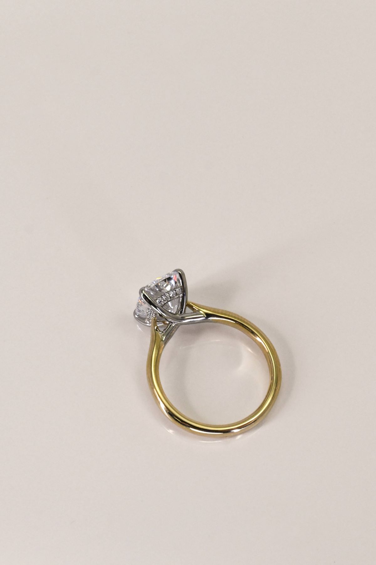 This elegant two-tone engagement ring combines timeless design with modern detail. The shank is crafted in warm 14Kt yellow gold, gracefully rising into a cathedral-style setting that enhances the center stone with height and presence. A 14Kt white gold head secures the diamond, creating a striking contrast while maximizing brilliance. Beneath the center, a hidden halo of sparkling diamonds adds an enchanting touch of light and secret shimmer, visible from every angle. A perfect blend of classic romance and contemporary sophistication.