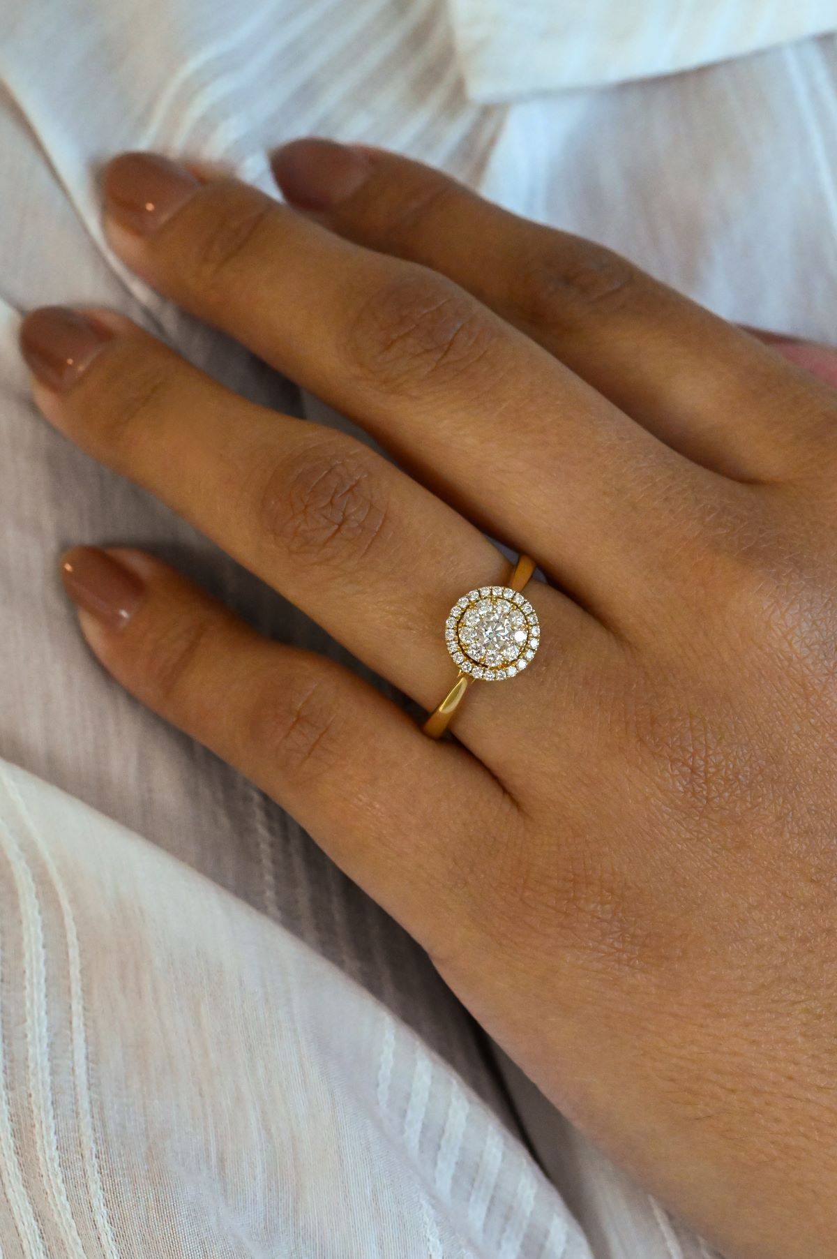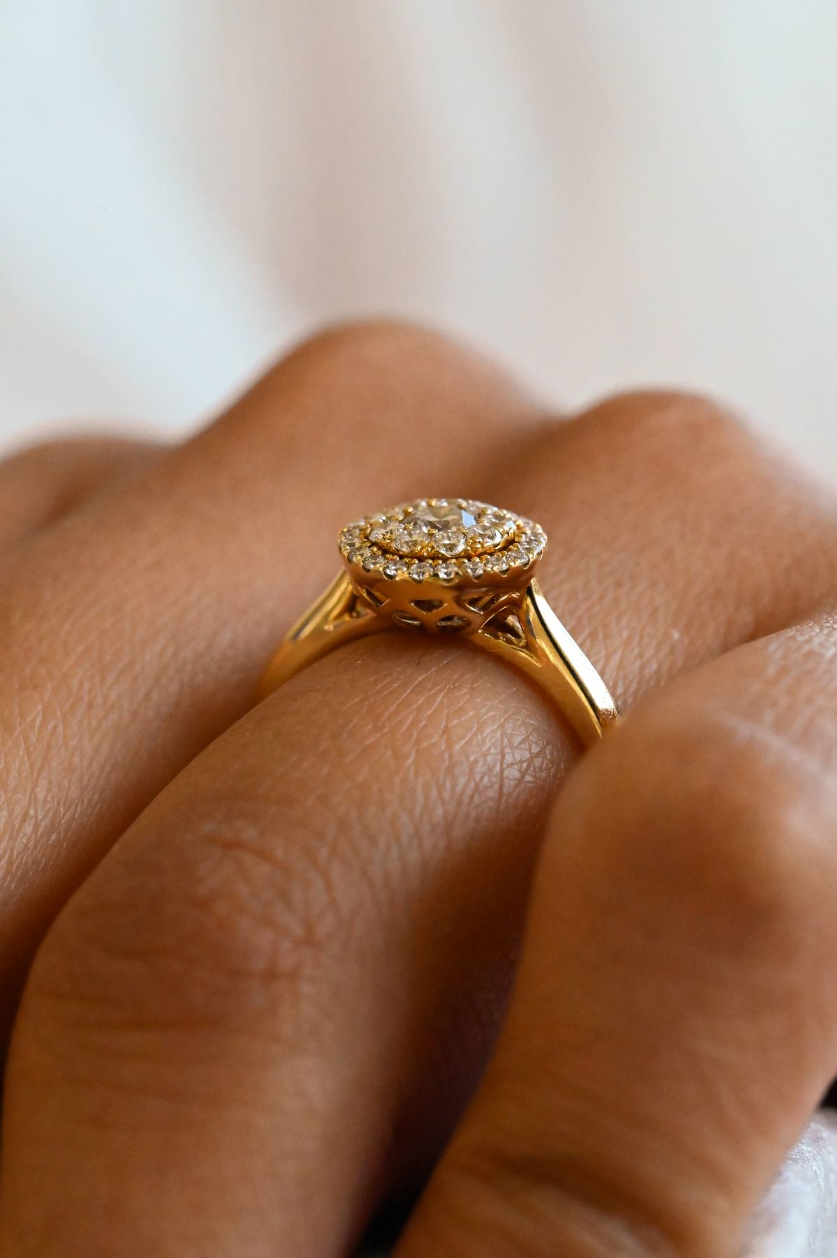This 14k yellow gold ladies’ dinner ring features a striking double halo design, elegantly showcasing a central round diamond of 0.19 ct, surrounded by 31 round brilliant-cut diamonds totaling 0.27 ct. The harmonious arrangement of sparkling diamonds and refined craftsmanship creates a glamorous statement piece, perfect for special occasions or adding a touch of everyday elegance.