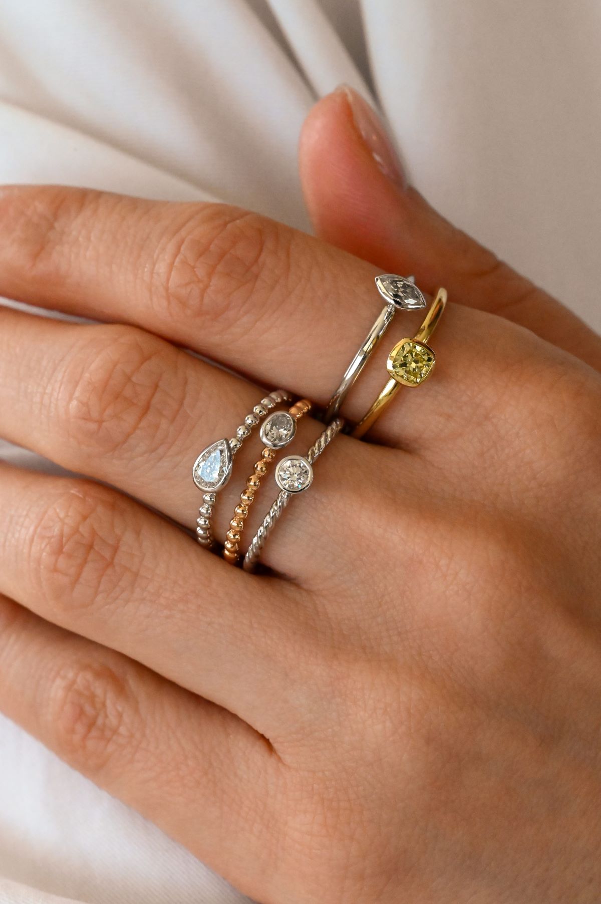A delicate and versatile stackable ring featuring a 0.15 carat oval-shaped natural diamond, bezel set in 14 karat white gold. The diamond is SI clarity and GH color, gracefully showcased atop a 14 karat rose gold beaded-style band. A refined contrast of metals and textures, perfect worn solo or layered with other rings for a personalized look.