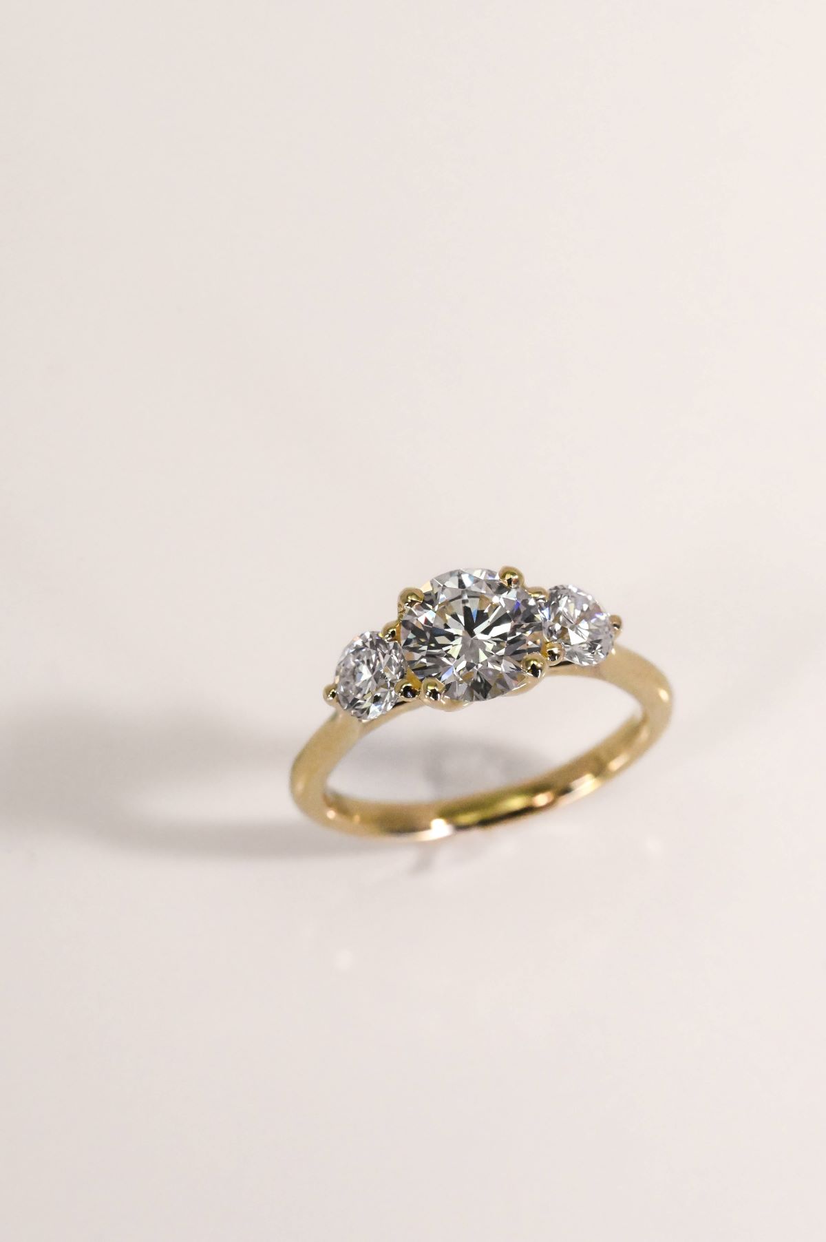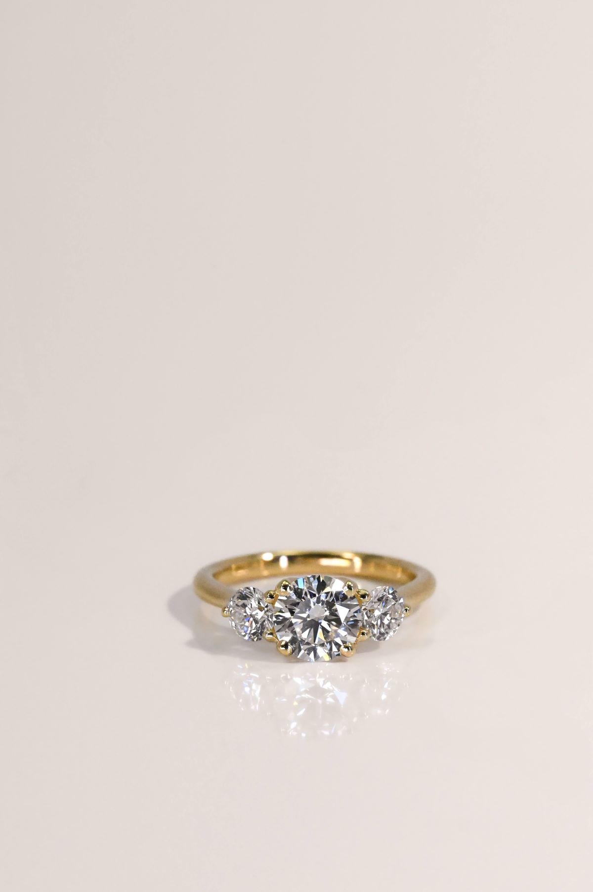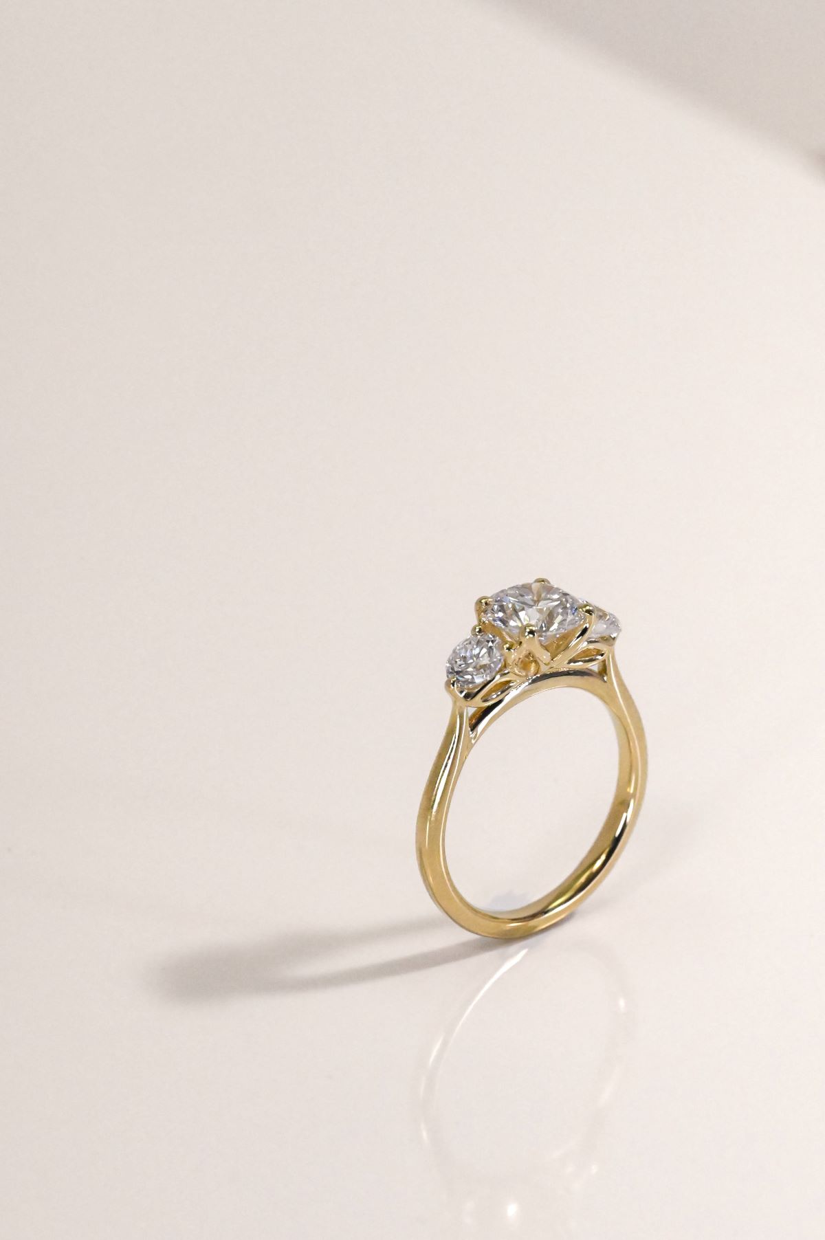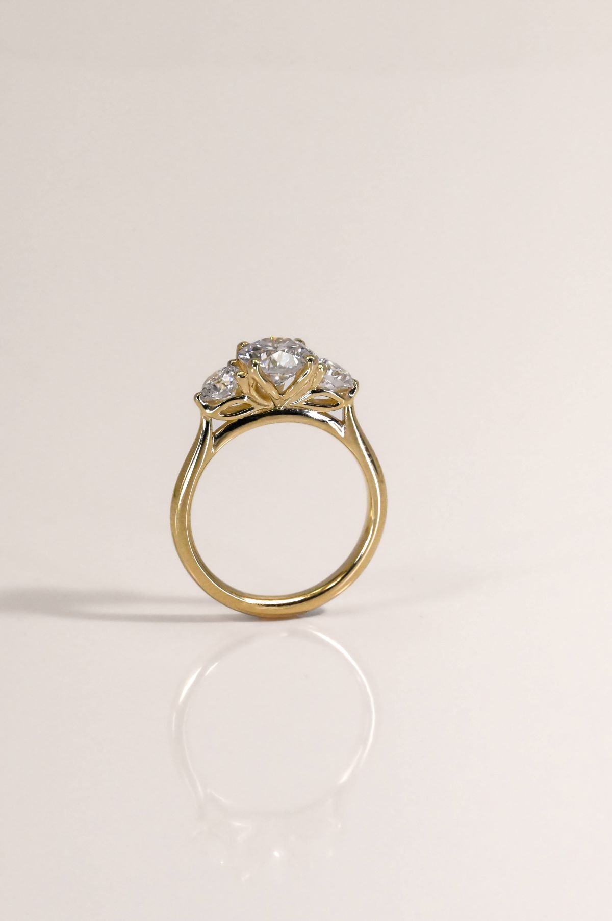 Classic with a refined twist, this 14K yellow gold engagement ring features an open cathedral-style setting with graceful tulip-inspired heads for each stone. A round brilliant cut diamond center is flanked by two matching round brilliant cut diamond shoulders, symbolizing the past, present, and future. The reverse-tapered design flows into a comfortable 3/4 round shank, offering a perfect balance of elegance, structure, and meaning. A beautifully crafted piece for a lifetime of love.