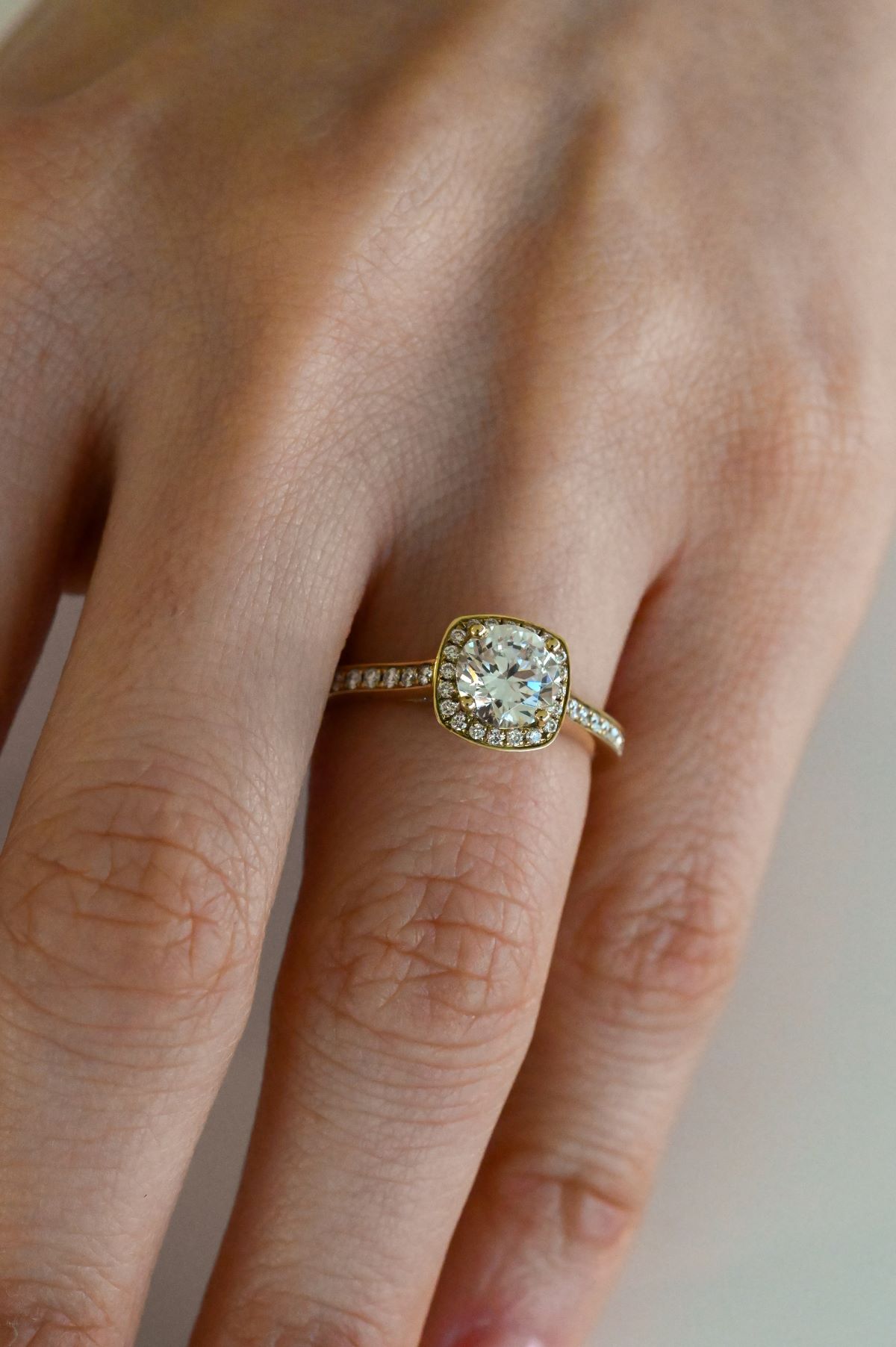 This 14k yellow gold diamond semi-mount engagement ring features a sophisticated two-level open gallery, with a bead and bright-set halo and shoulders extending halfway down the shank. Adorned with 66 round brilliant-cut diamonds totaling 0.33 cts, it surrounds a 6 mm round CZ center stone, offering a dazzling foundation ready for a custom centerpiece. The intricate design combines timeless elegance with contemporary craftsmanship, making it a standout piece in any bridal collection.