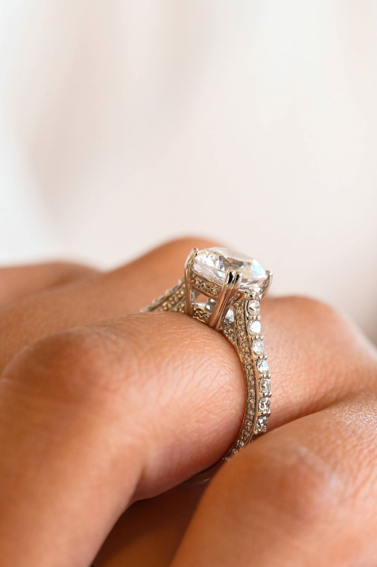 - Center Stone: Round Brilliant Cut Cubic Zirconia