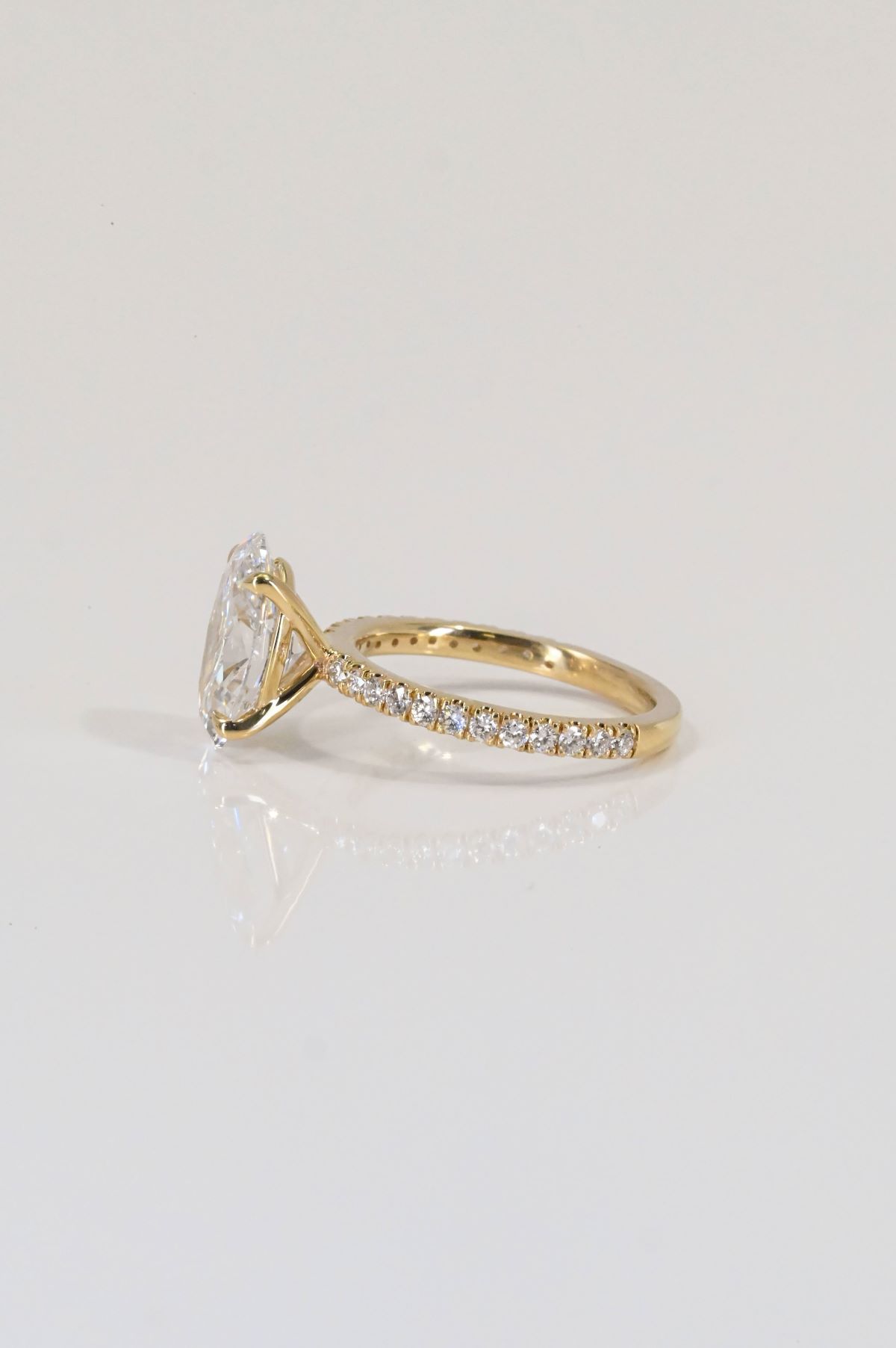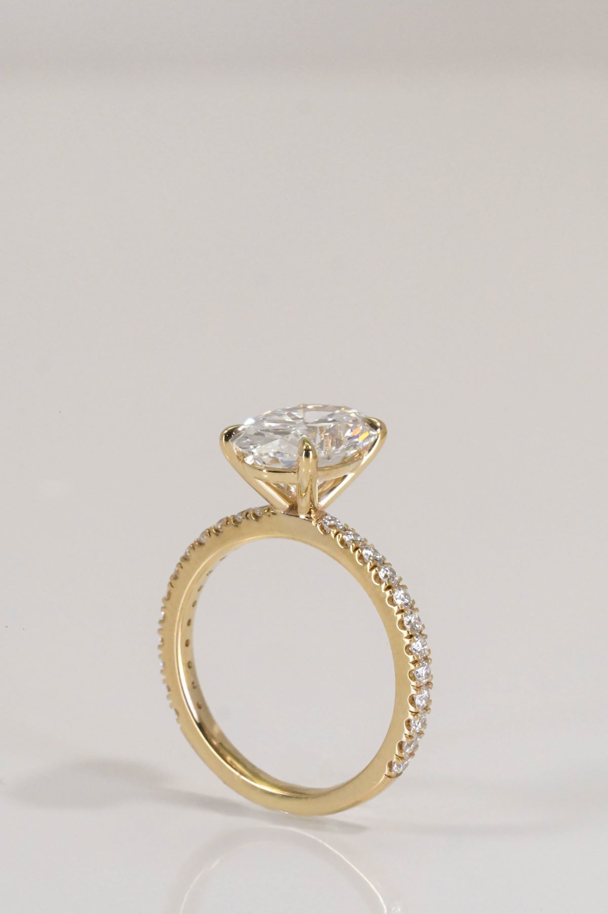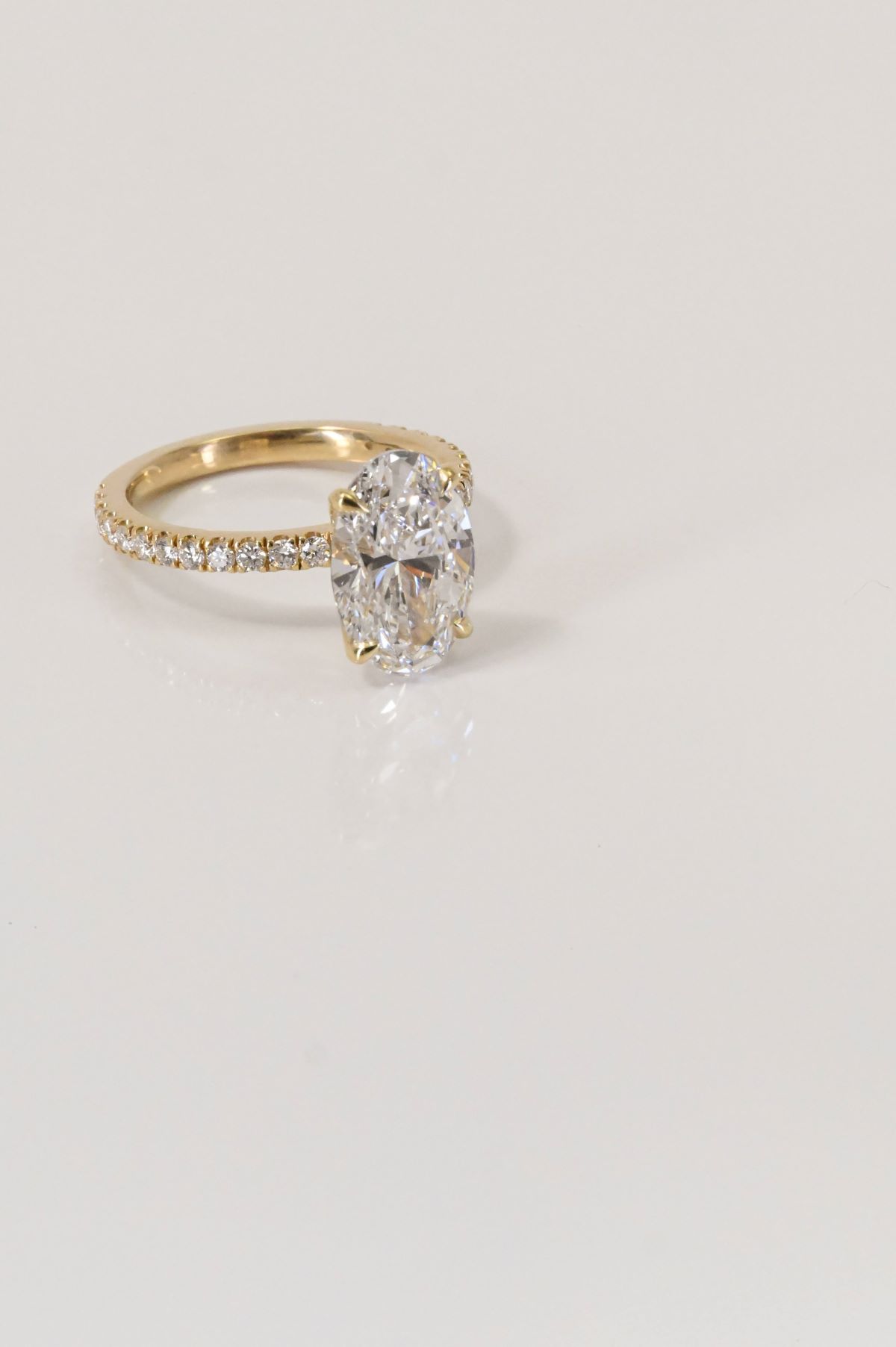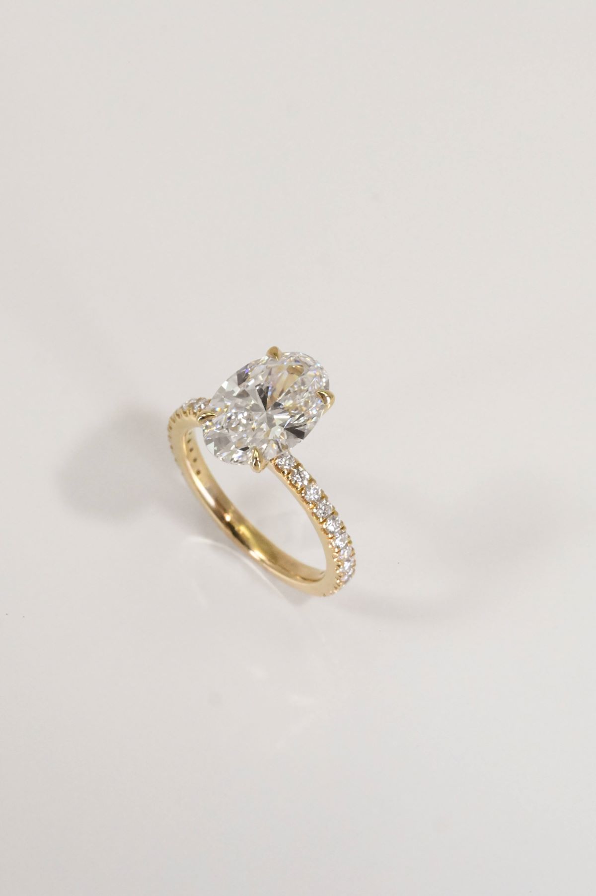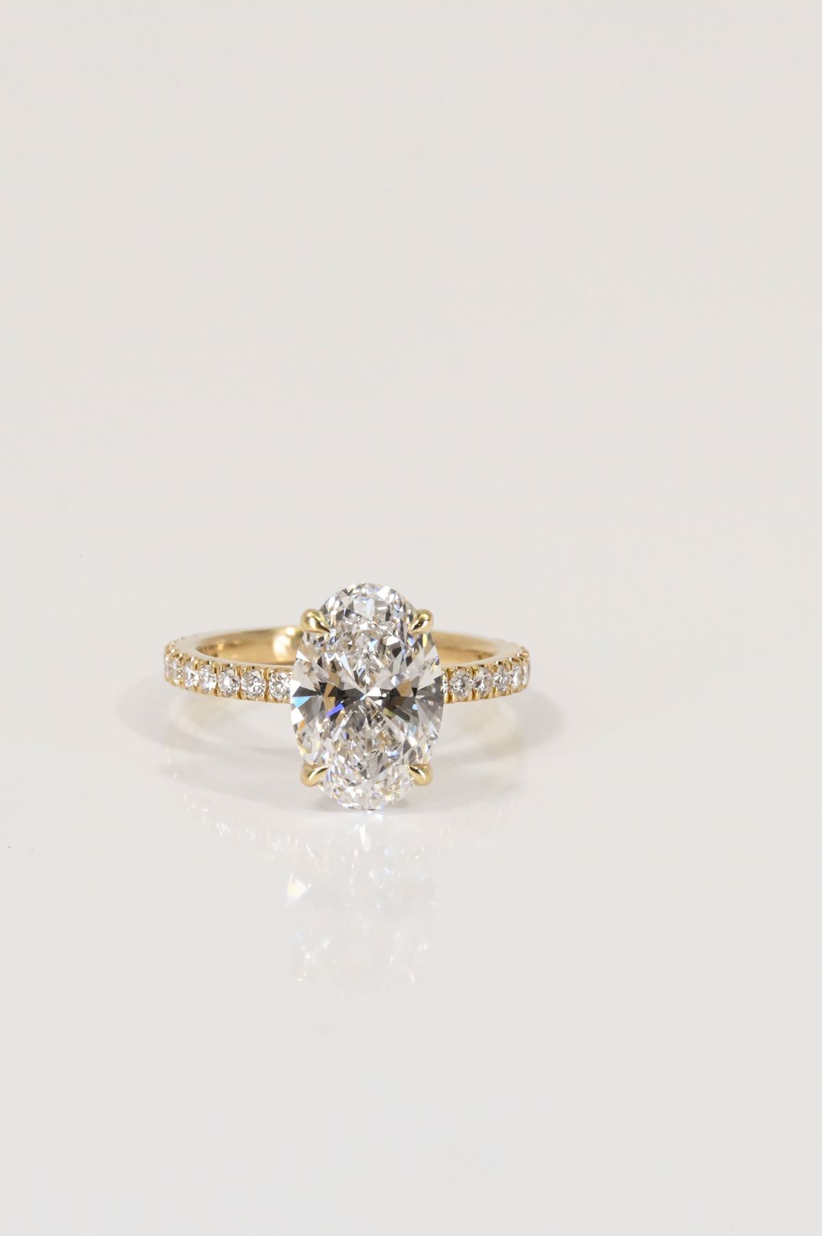 A timeless design featuring a luminous oval center stone set in yellow gold. The elegant band is pave set with sparkling round diamonds, extending three-quarters of the way down the shank for a refined touch of brilliance.