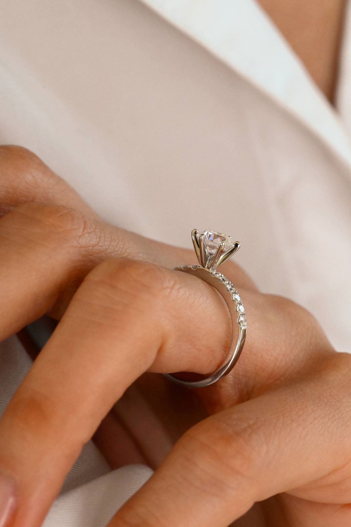 - Center Stone: 6.5mm Round Brilliant Cut Cubic Zirconia