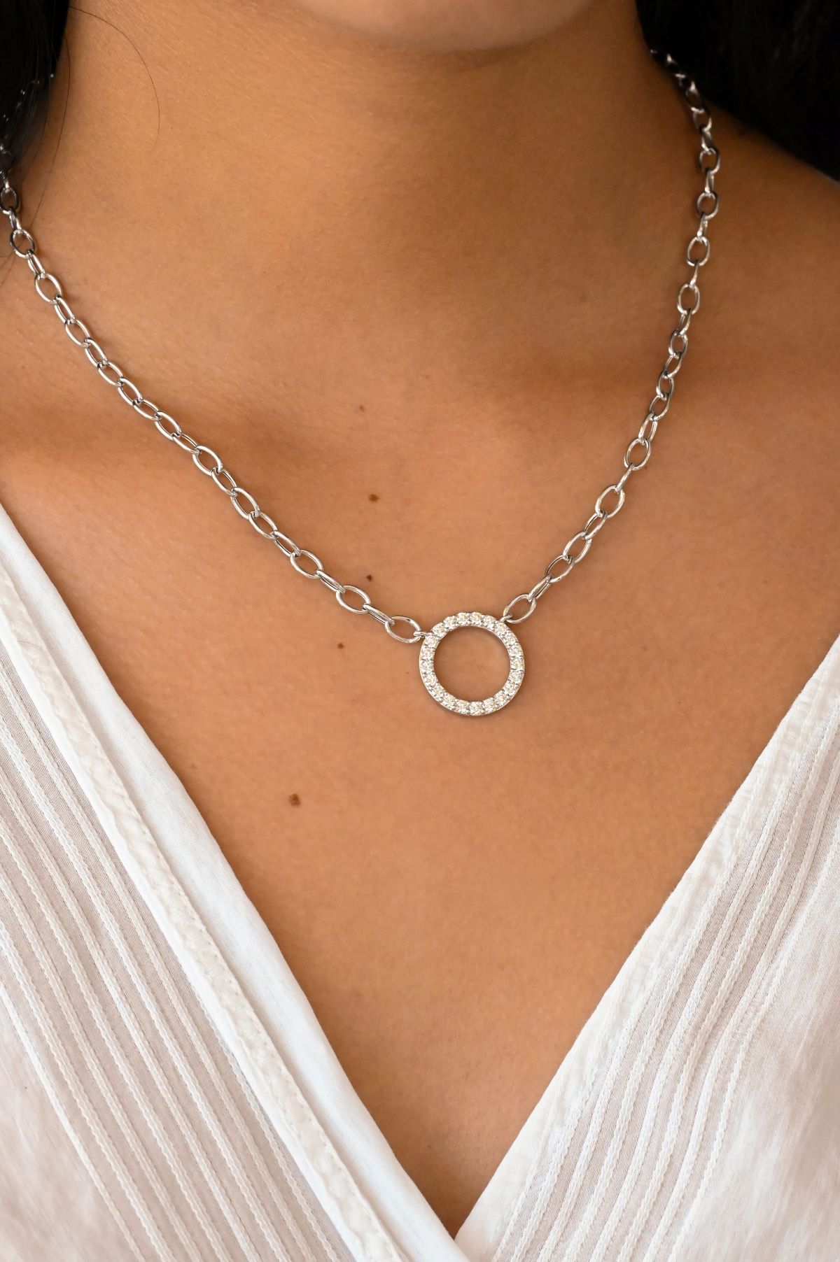 Sleek and sophisticated, this 14K white gold pendant showcases a graceful open circle set with 21 round brilliant cut natural diamonds, totaling 1.00 carat of VS clarity and GH colour. The shared claw setting allows for maximum sparkle and a clean, modern look. Paired with an 18-inch large oval link chain and secured with a lobster claw clasp, this elegant piece is a timeless addition to any jewelry collection.