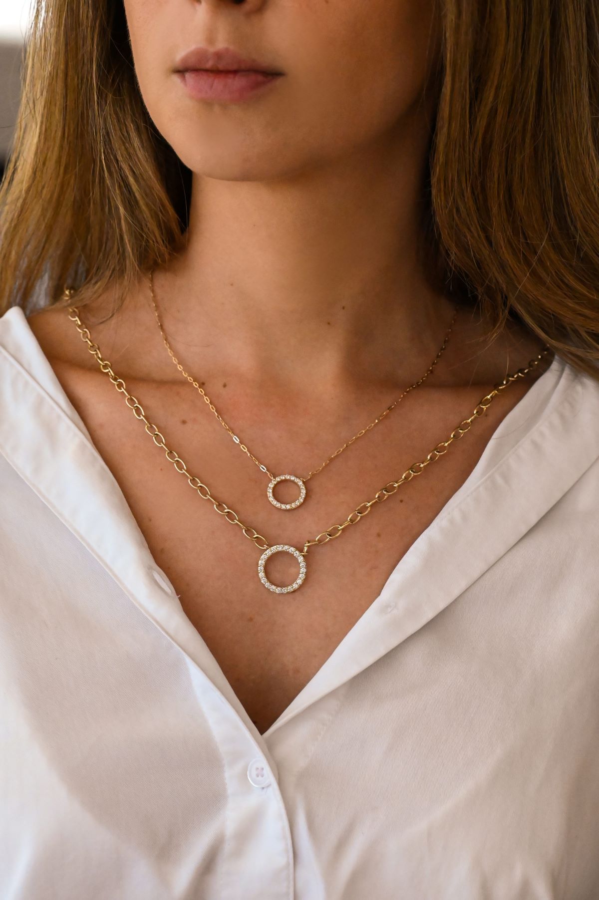 Radiating elegance and balance, this 14K yellow gold open circle pendant is adorned with 21 round brilliant cut natural diamonds, totaling 1.00 carat. Each stone is VS clarity and GH colour, set in a refined shared claw design that enhances their brilliance. The pendant is suspended from an 18-inch large oval link chain and secured with a lobster claw clasp — a timeless symbol of unity and sophistication.
