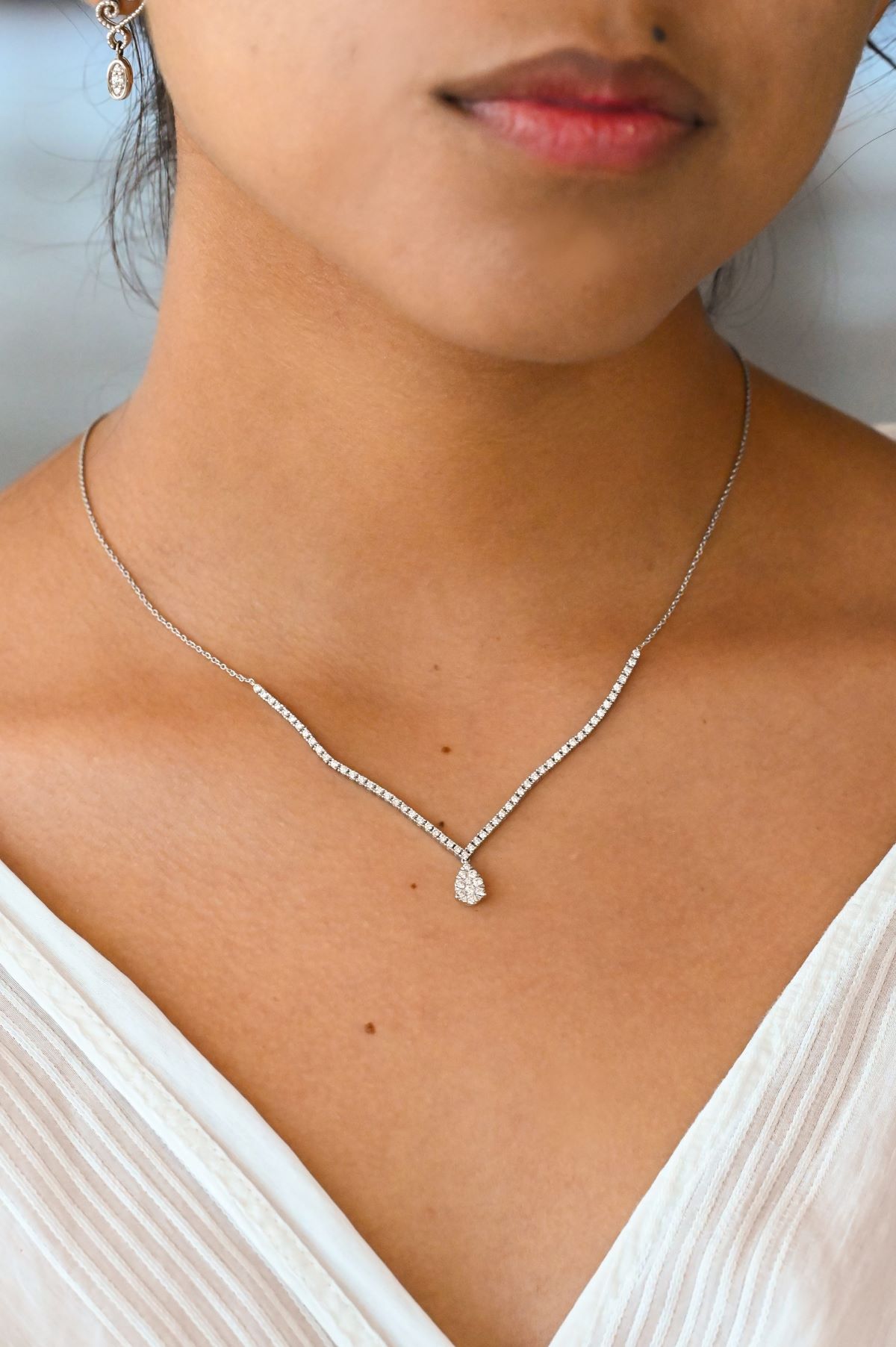 Elegant and timeless, this 14Kt white gold necklace features a graceful in-line “V” design adorned with 65 round brilliant cut natural diamonds, totaling 1.00 carat (VS clarity, G color). A pavé-set pear-shaped diamond drop at the center adds a delicate focal point. Finished with a fine rolo link chain, this necklace blends classic style with contemporary elegance—perfect for any special occasion or refined everyday wear.
