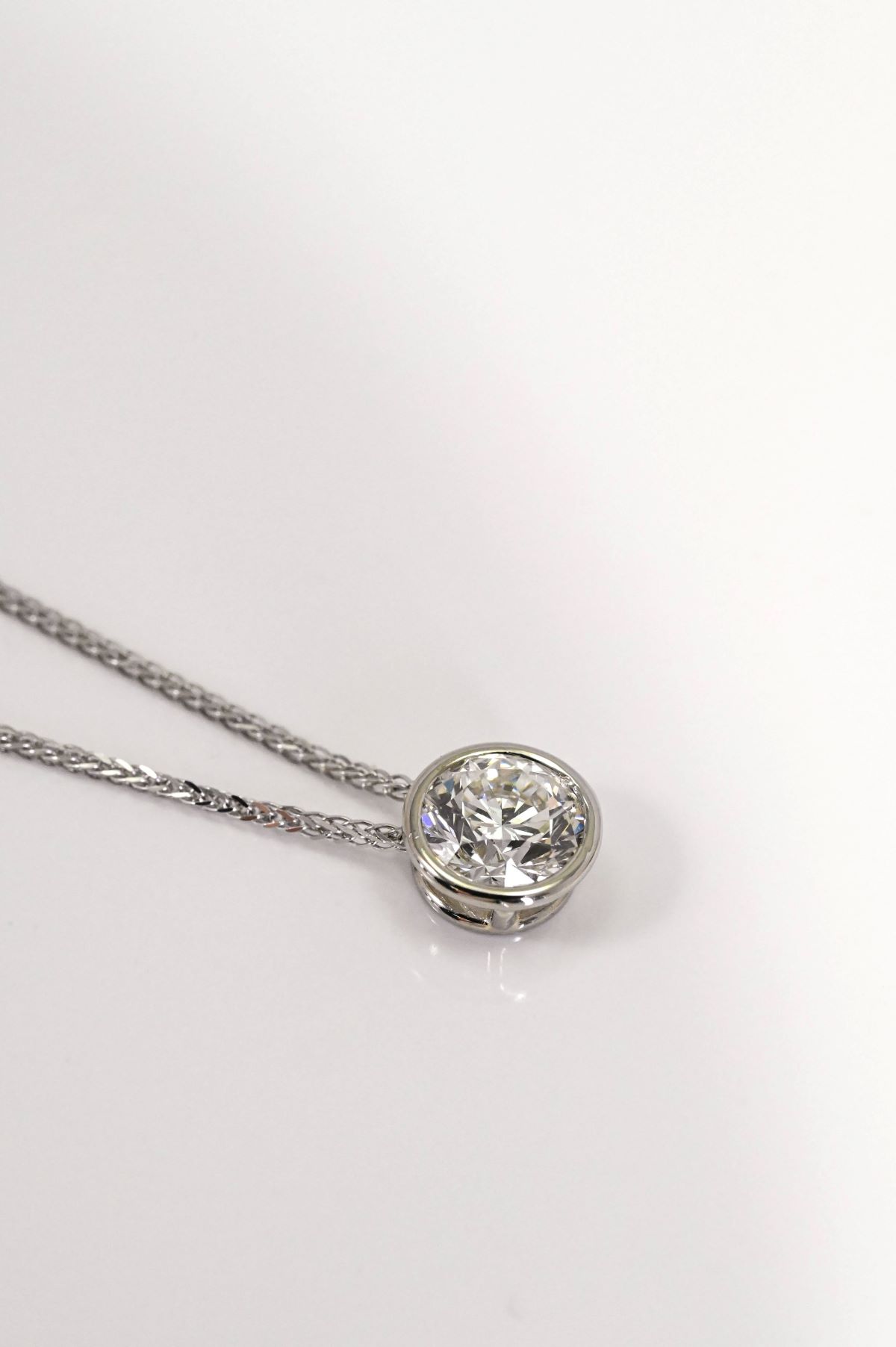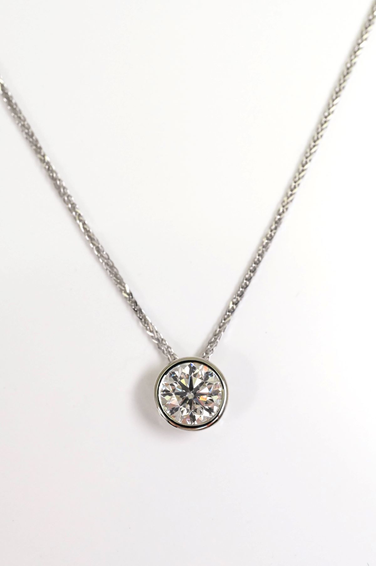 Crafted in 14-karat white gold, this elegant ladies’ slider pendant features a 0.956-carat round brilliant-cut natural diamond of I color and SI1 clarity, bezel-set within a delicate halo design. The pendant is suspended from an 18-inch fine wheat link chain in matching 14-karat white gold, weighing 1.65 grams. Combining timeless elegance with contemporary refinement, this piece radiates understated sophistication and enduring beauty.