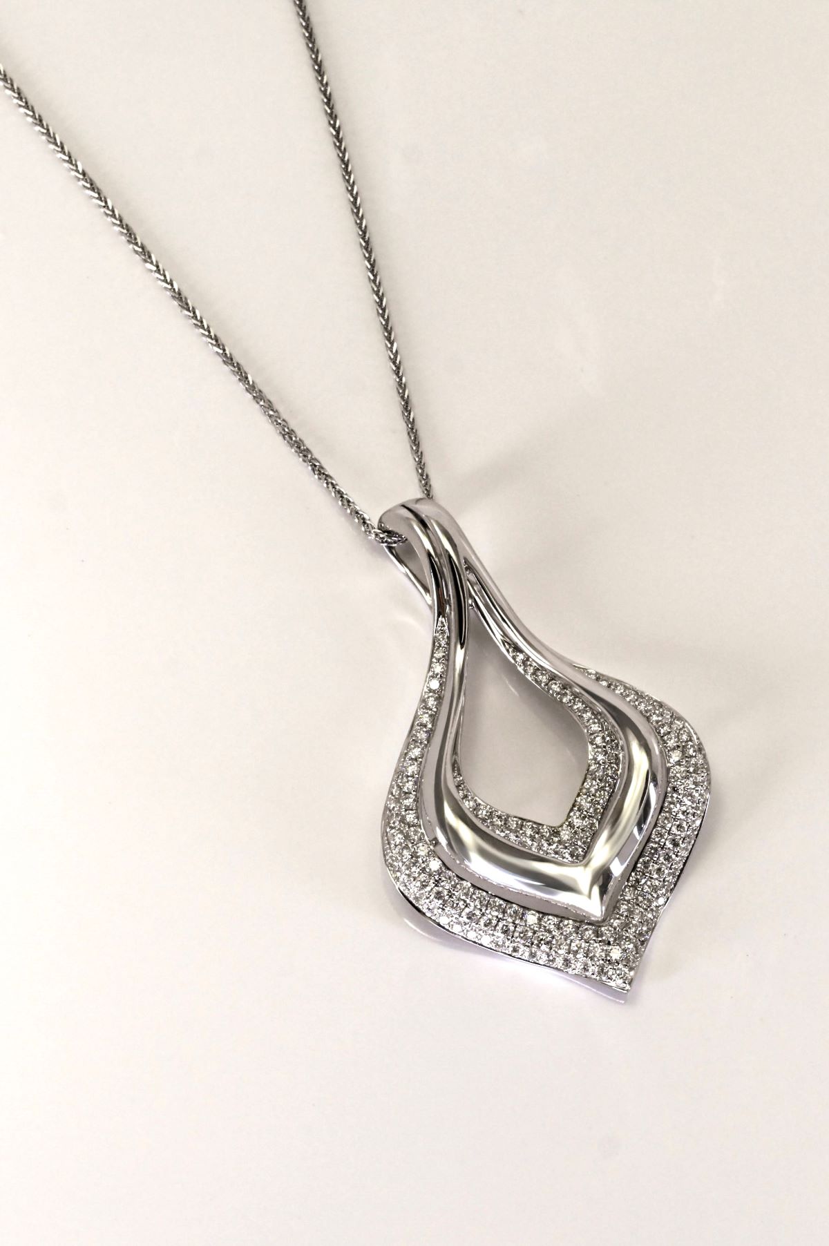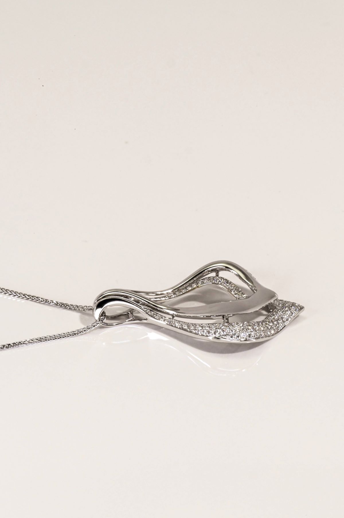 An elegant stylized teardrop pendant crafted in 14Kt white gold, shimmering with 153 pavé-set round brilliant cut diamonds totaling 0.90cts. A timeless expression of brilliance and sophistication.
