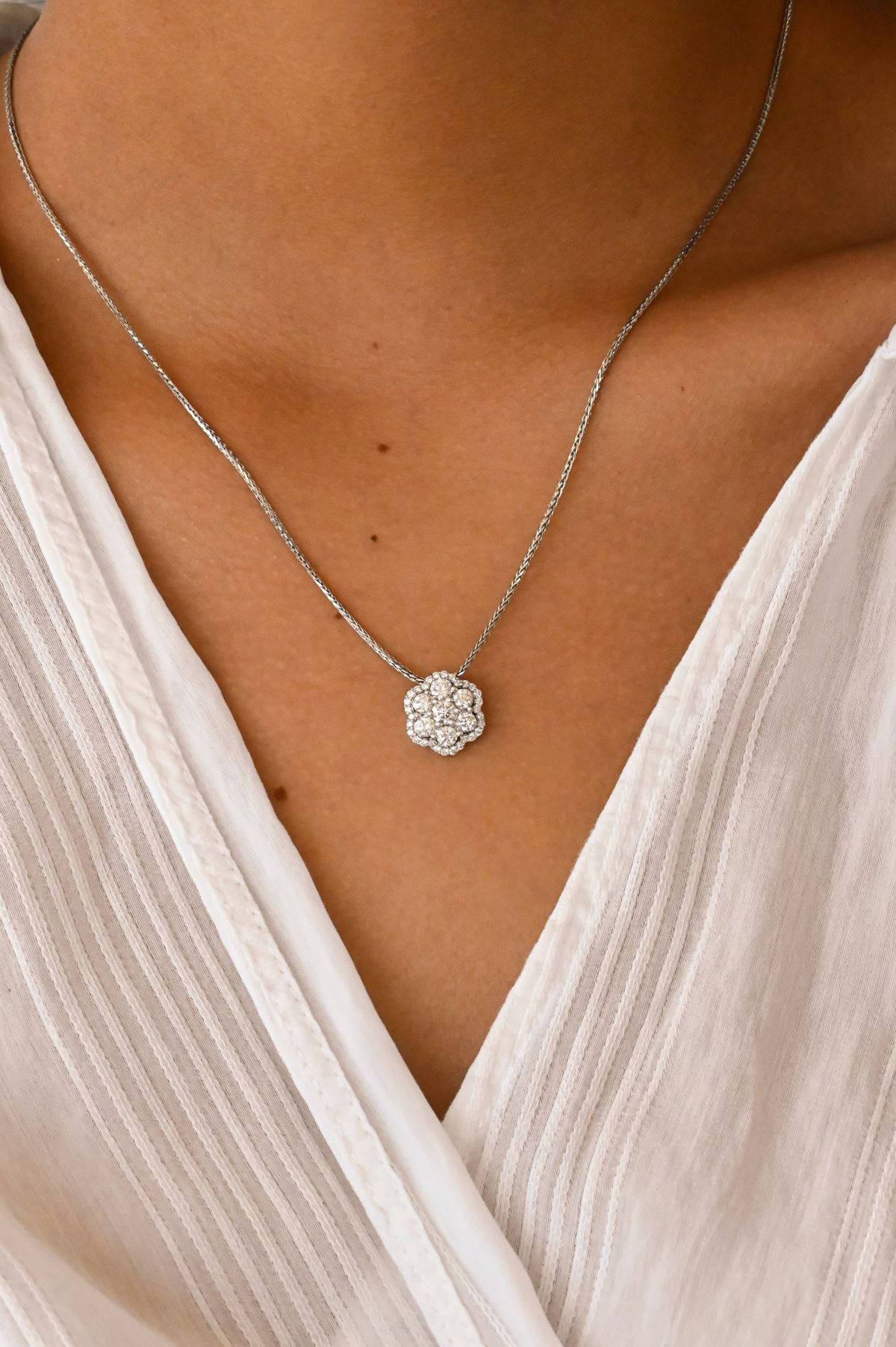 The “Radiance” pendant in 14Kt. white gold captures timeless elegance with its graceful flower-inspired design. Expertly crafted as a diamond slide pendant, it is adorned with 1.00 carats total weight of dazzling round brilliant cut Diamonds, offering exceptional sparkle and sophistication.
